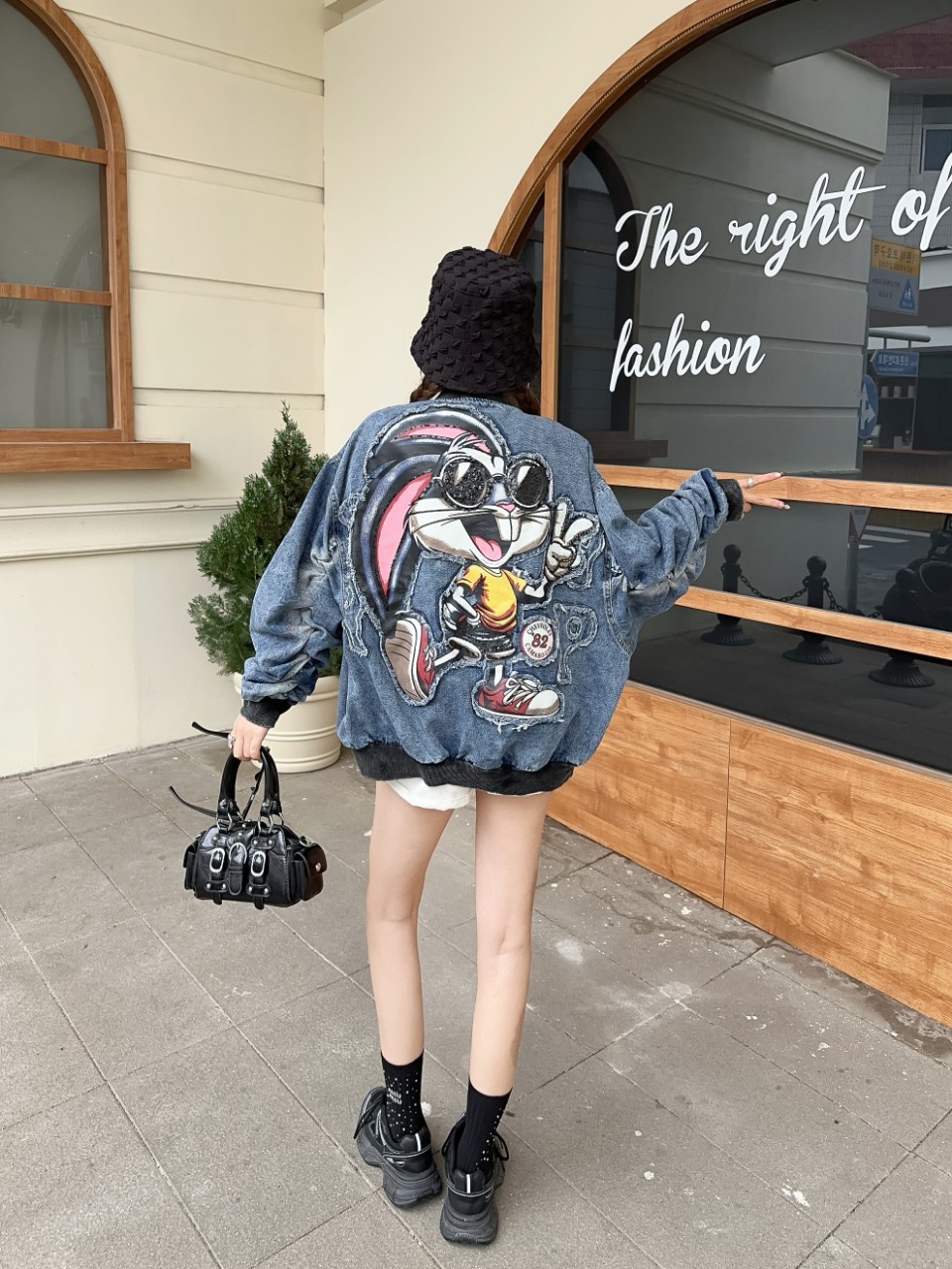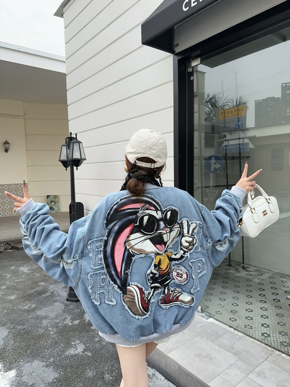 유럽 2025 봄 느슨한 중간 길이 컬러 접합 자수 야구 세트 재킷 코트 여자