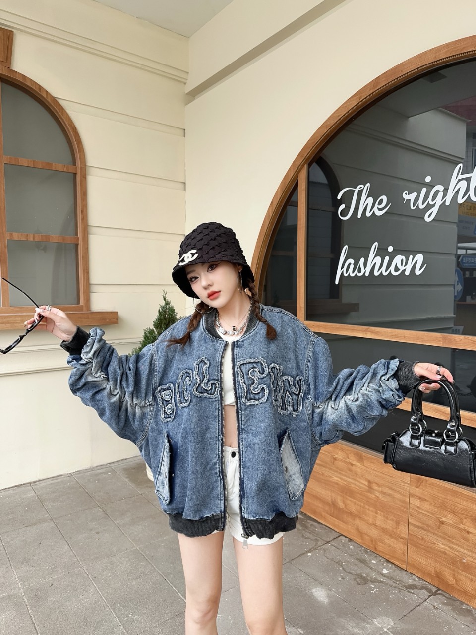 유럽 2025 봄 느슨한 중간 길이 컬러 접합 자수 야구 세트 재킷 코트 여자스토어 가기