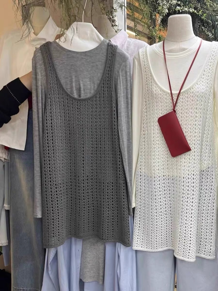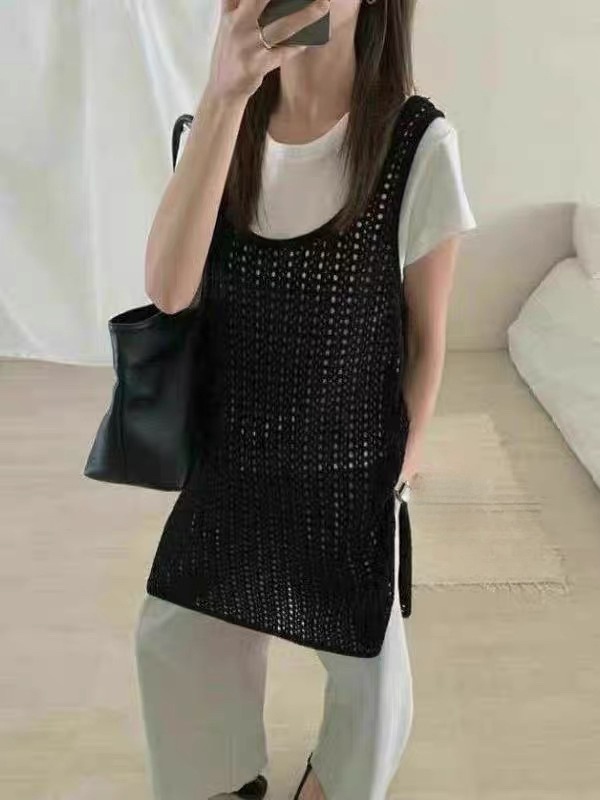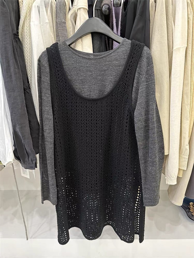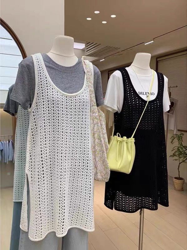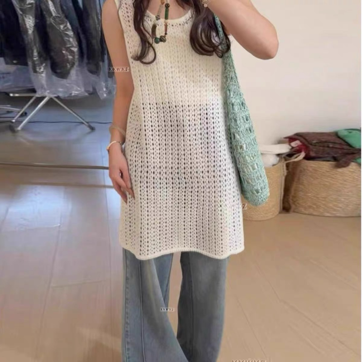 이른 봄 U-넥 조끼 스커트 할로우 캐주얼 니트 조끼 스택 느슨한 한국 스타일 사이드 슬릿 미디 블라우스 여성