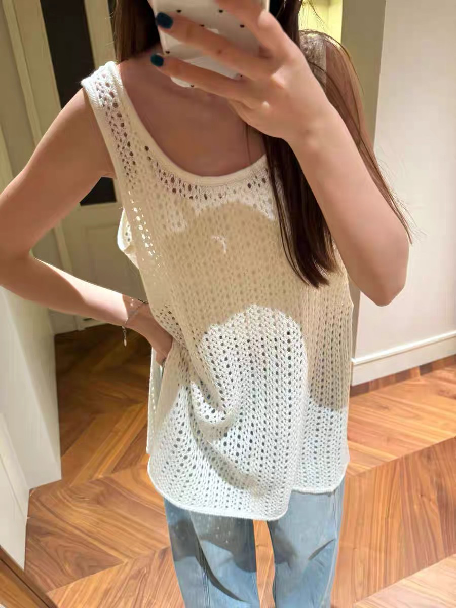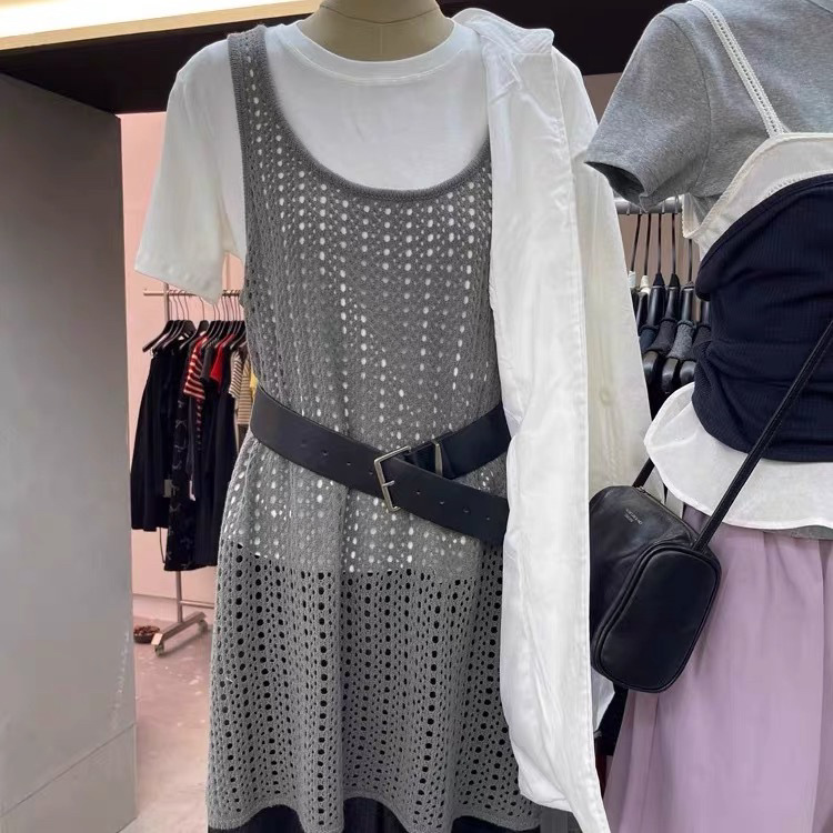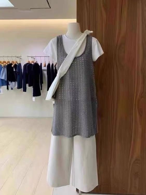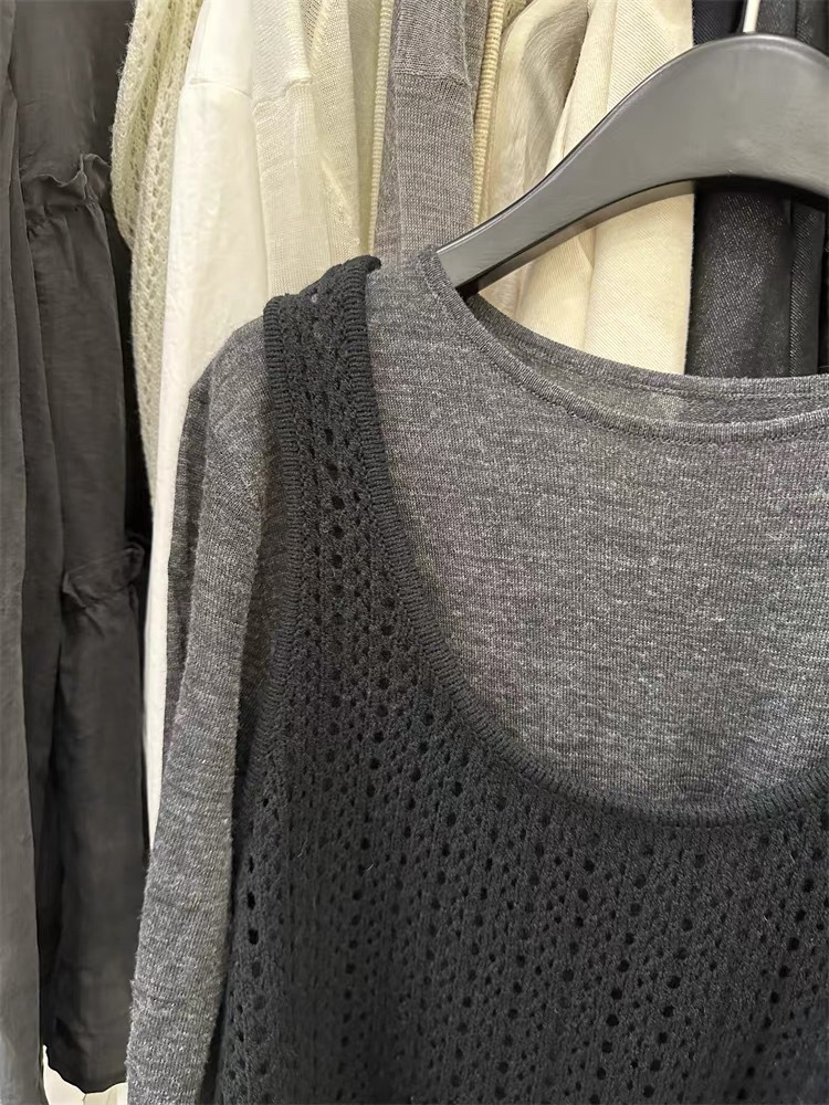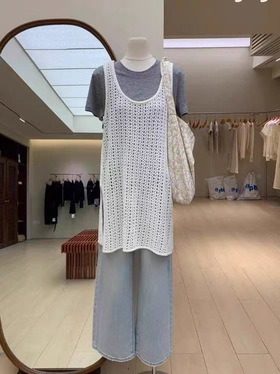 이른 봄 U-넥 조끼 스커트 할로우 캐주얼 니트 조끼 스택 느슨한 한국 스타일 사이드 슬릿 미디 블라우스 여성