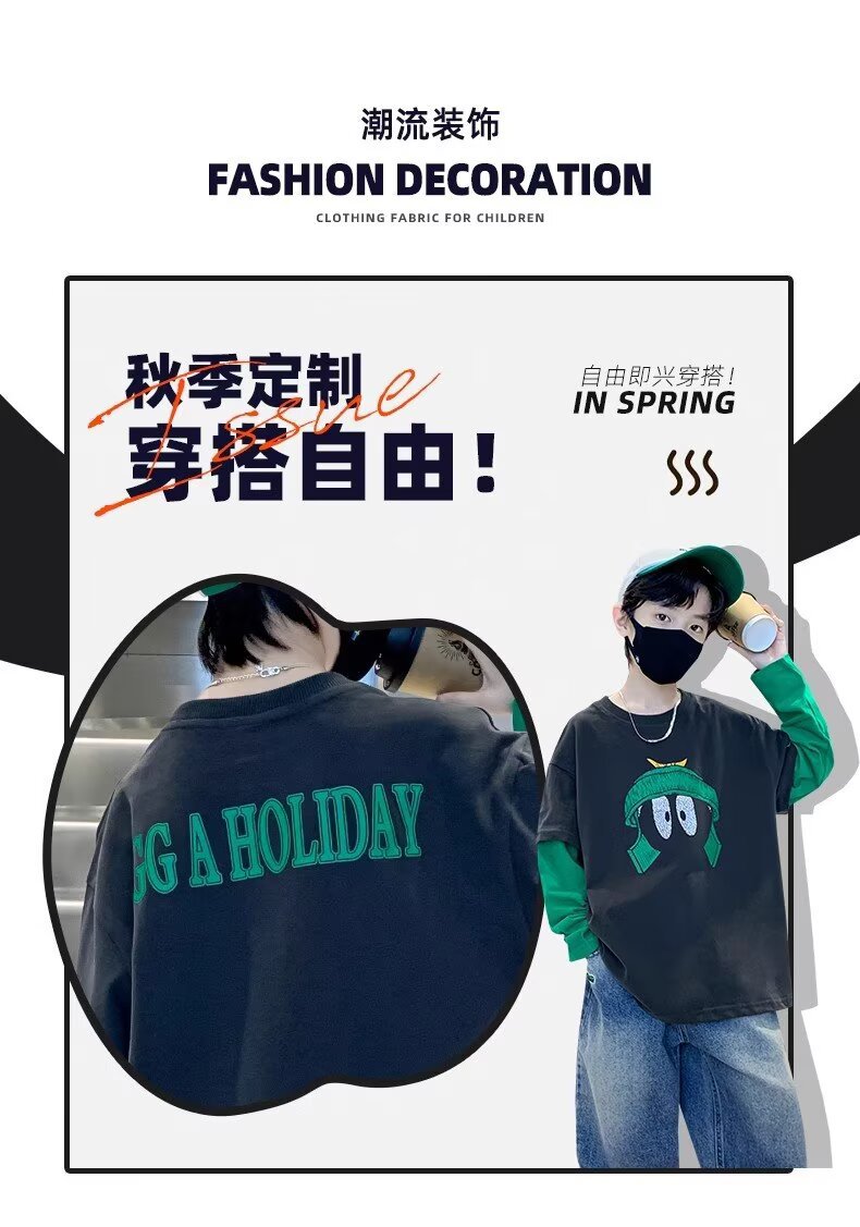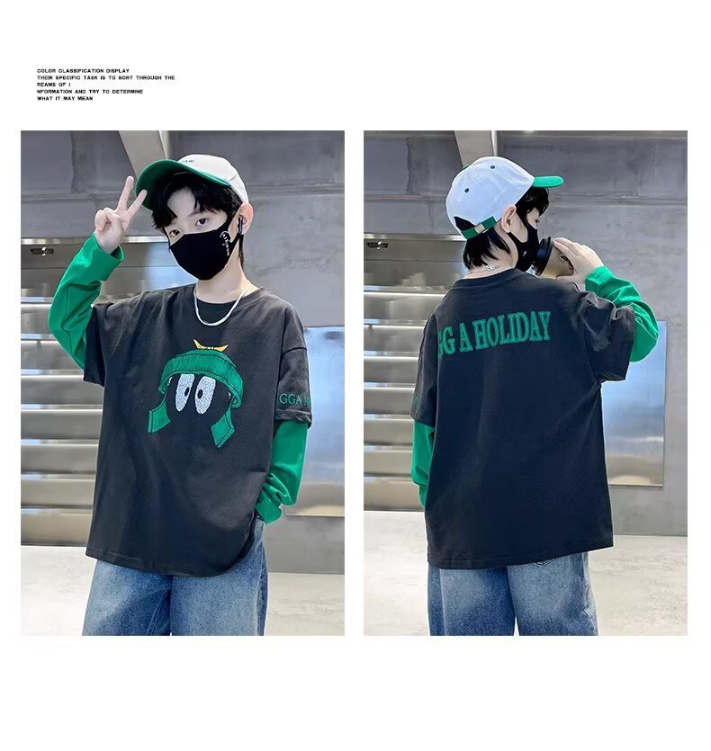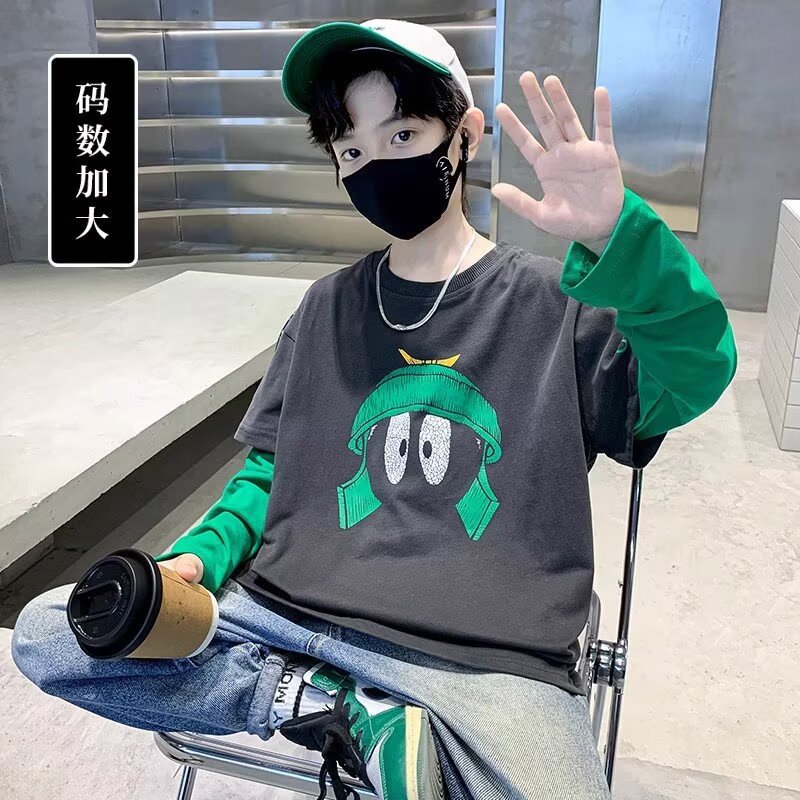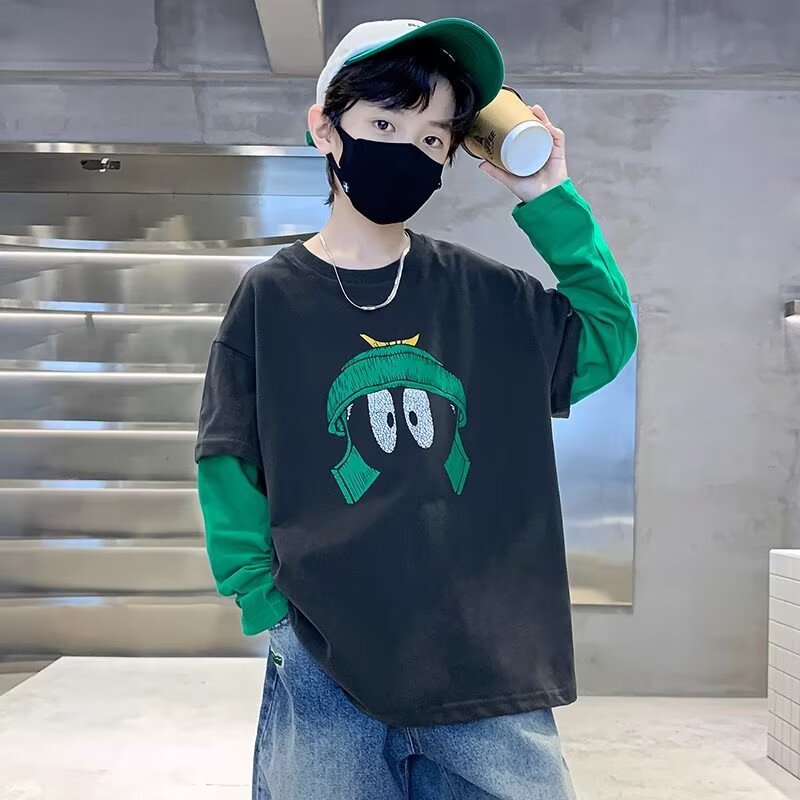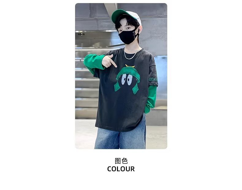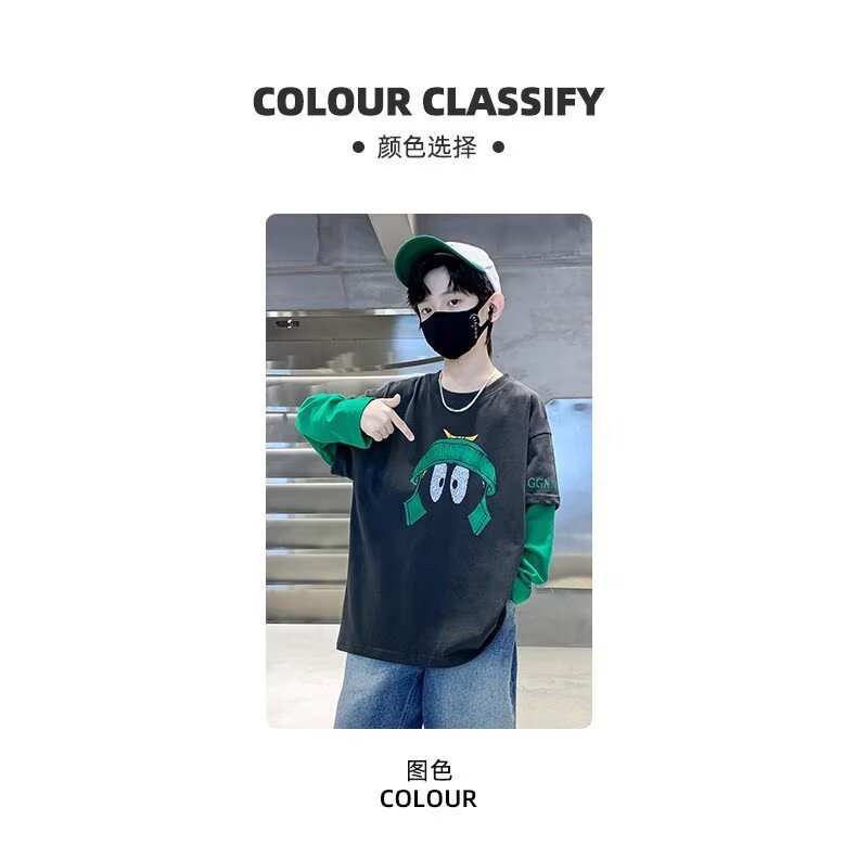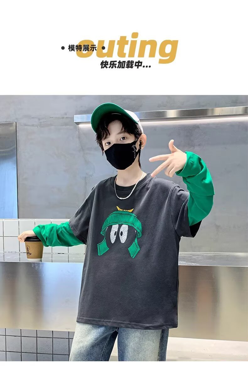 소년 봄 긴팔 가짜 투피스 티셔츠 2025 새로운 어린이 소년 봄, 가을 느슨한 대비 색상 만화 탑 유행스토어 가기