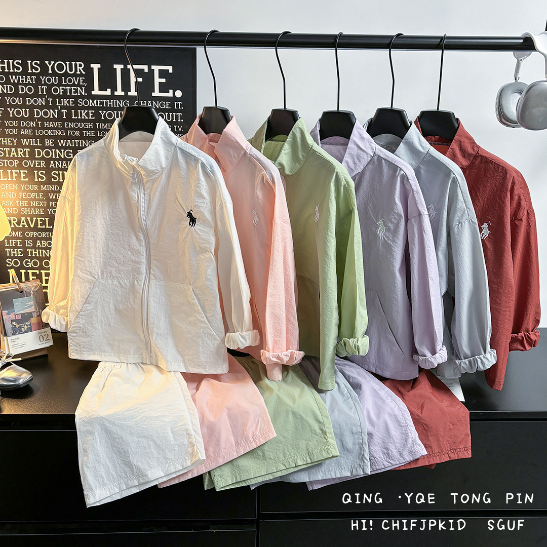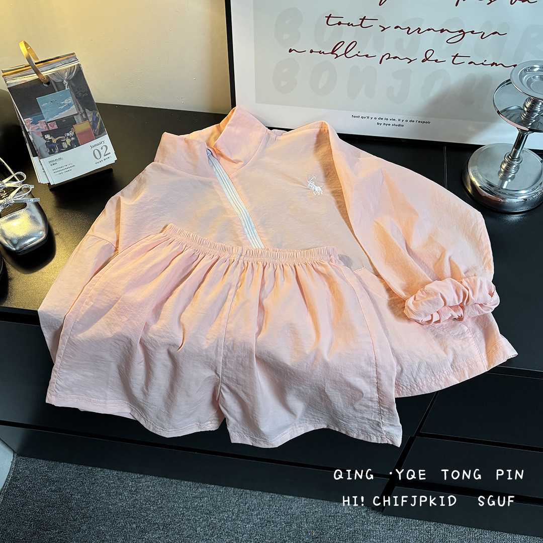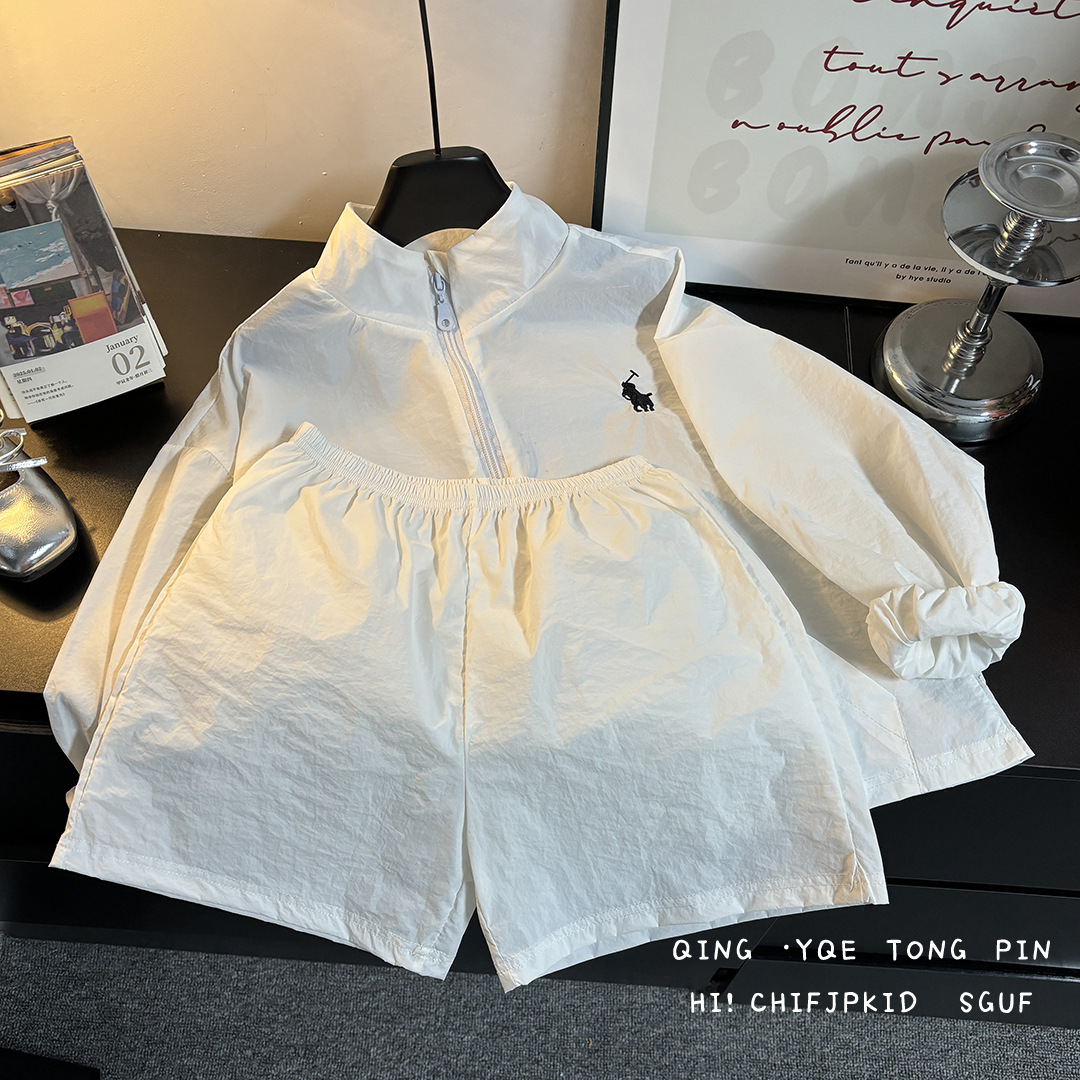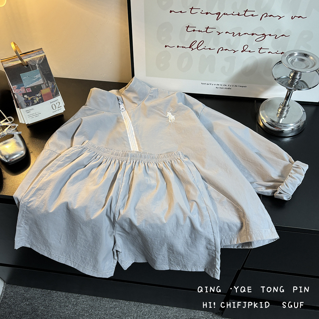 어린이 여름 선 스크린 의류 세트 소년 스포츠 탑 반바지 투피스 세트 아기 소녀의 얇은 지퍼 스킨 의류