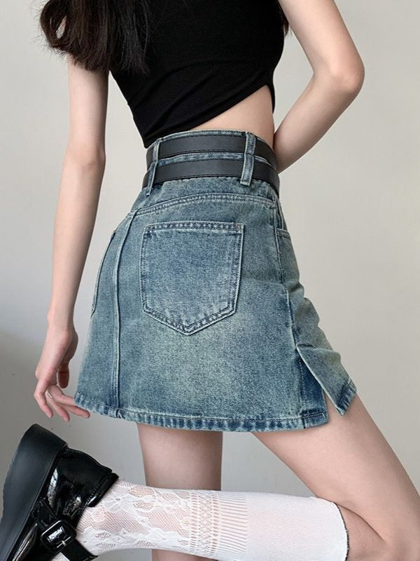 높은 허리 데님 스커트 여성 여름 새로운 슬림 핏 빈티지 스파이스 소녀 가방 엉덩이 슬리밍 A 라인 스커트 미끄럼 방지 스커트 바지스토어 가기