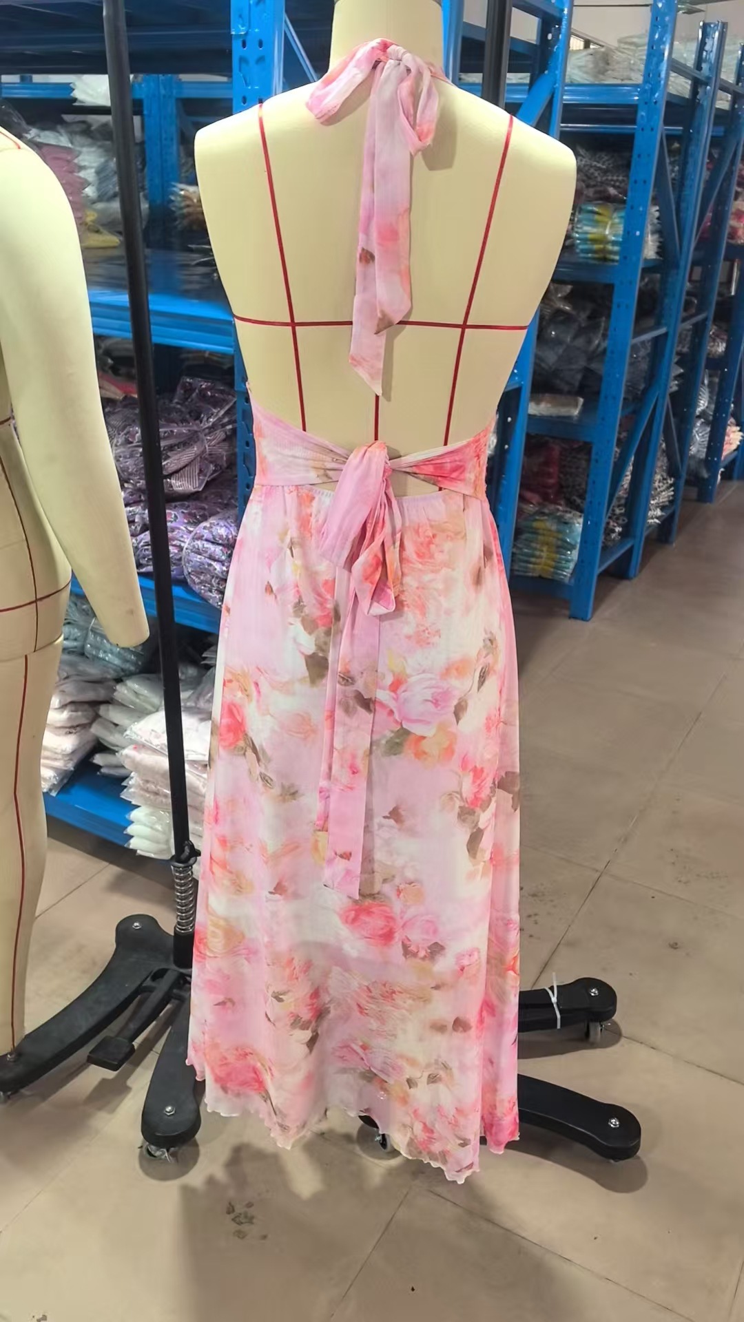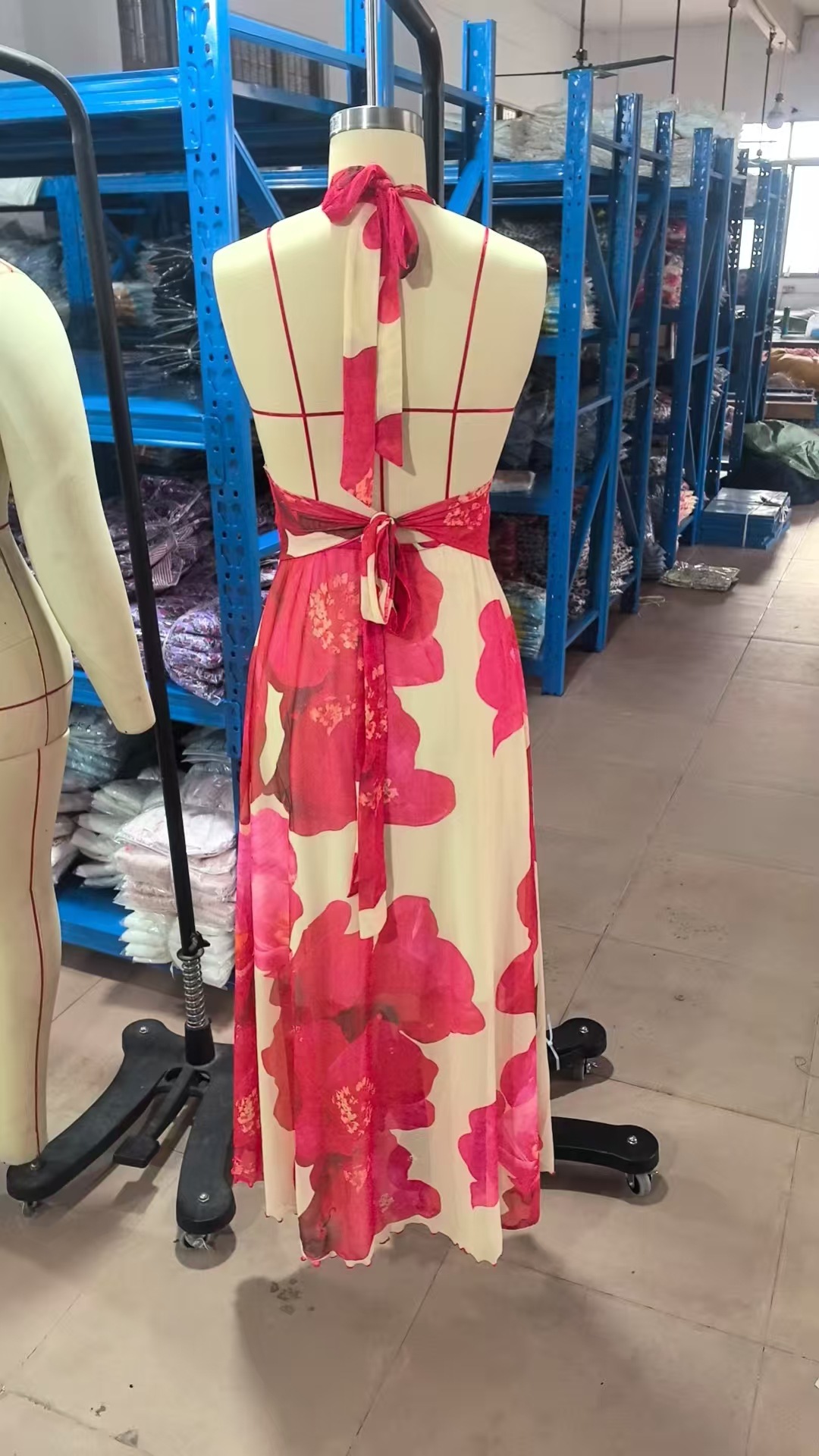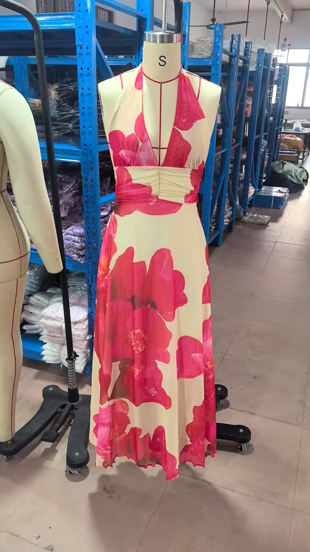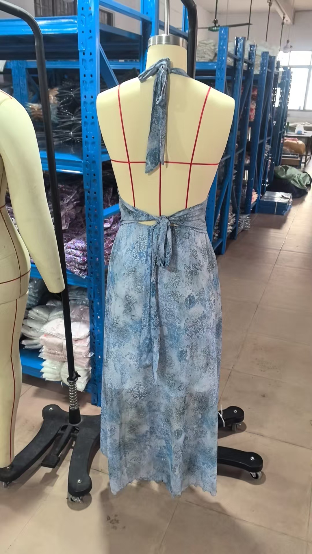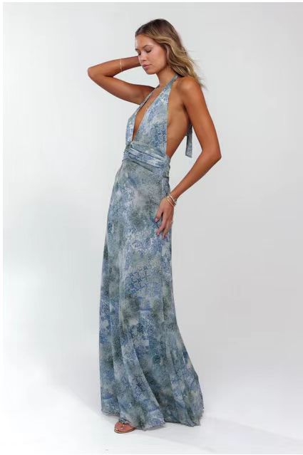 유럽과 미국의 Ins 스타일 국경 봄과 여름 새로운 패션 섹시한 원피스 백리스 슬림 핏 인쇄 된 목 교수형 원피스스토어 가기