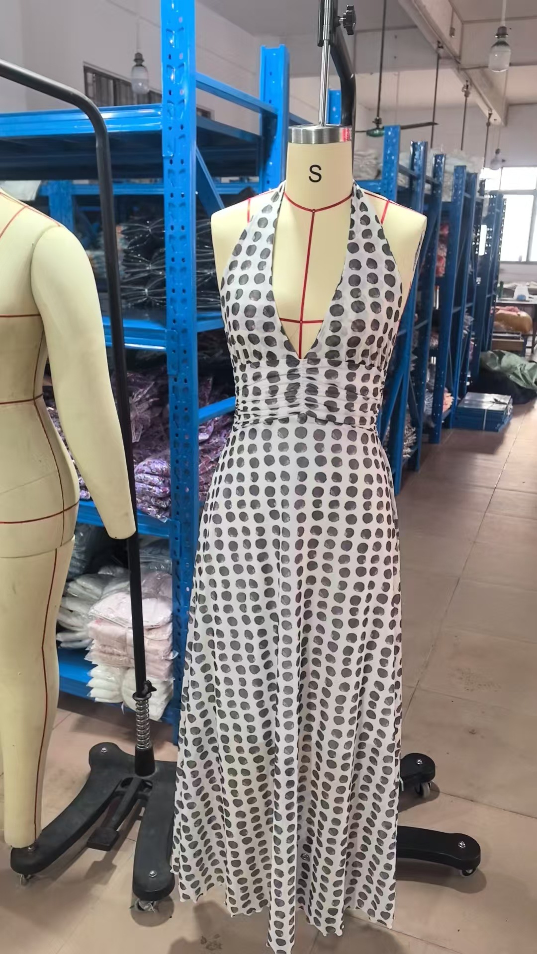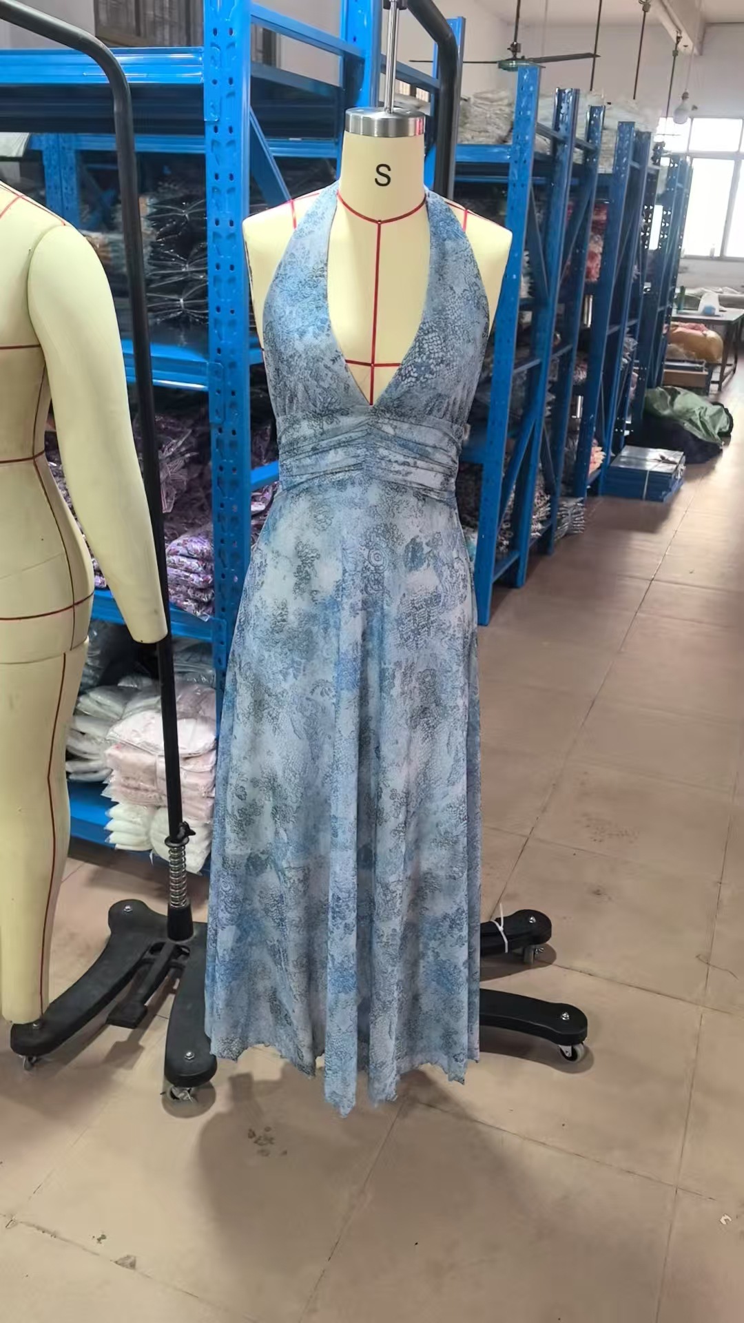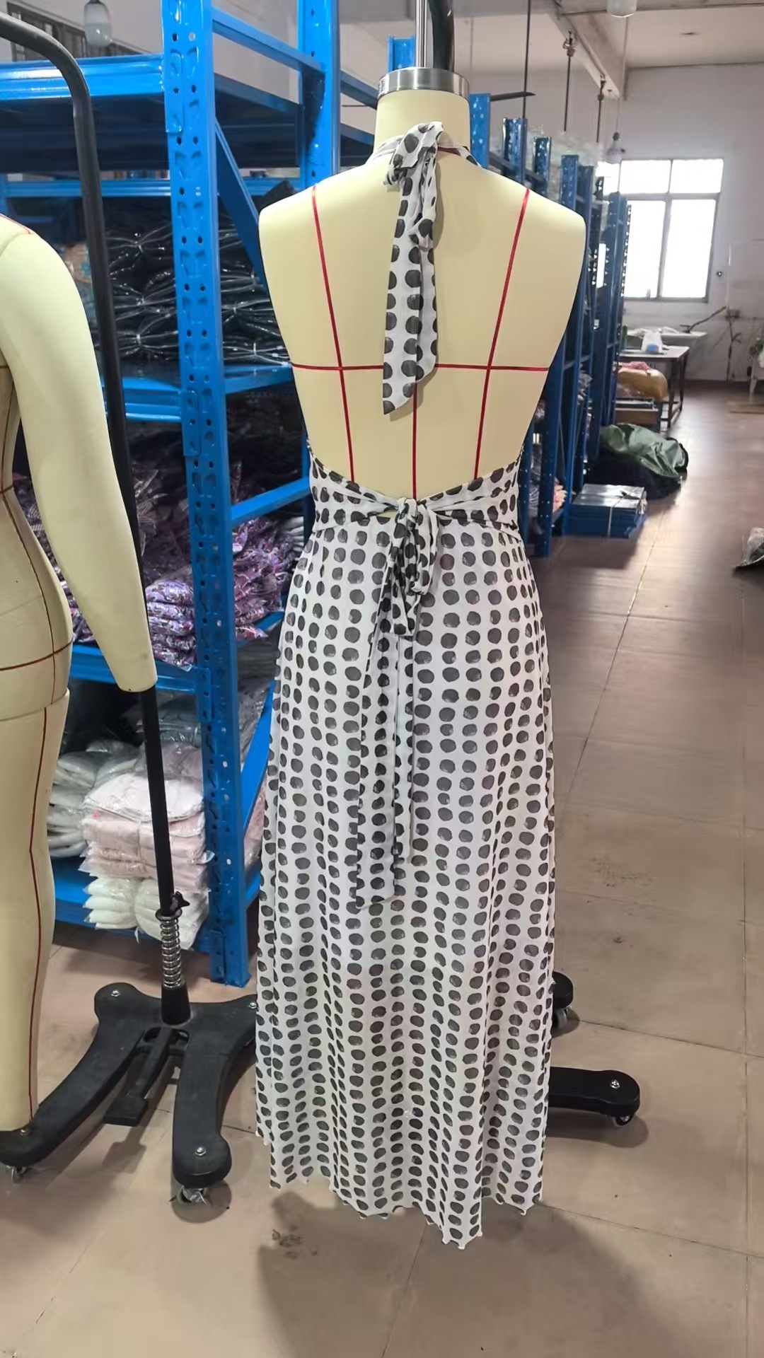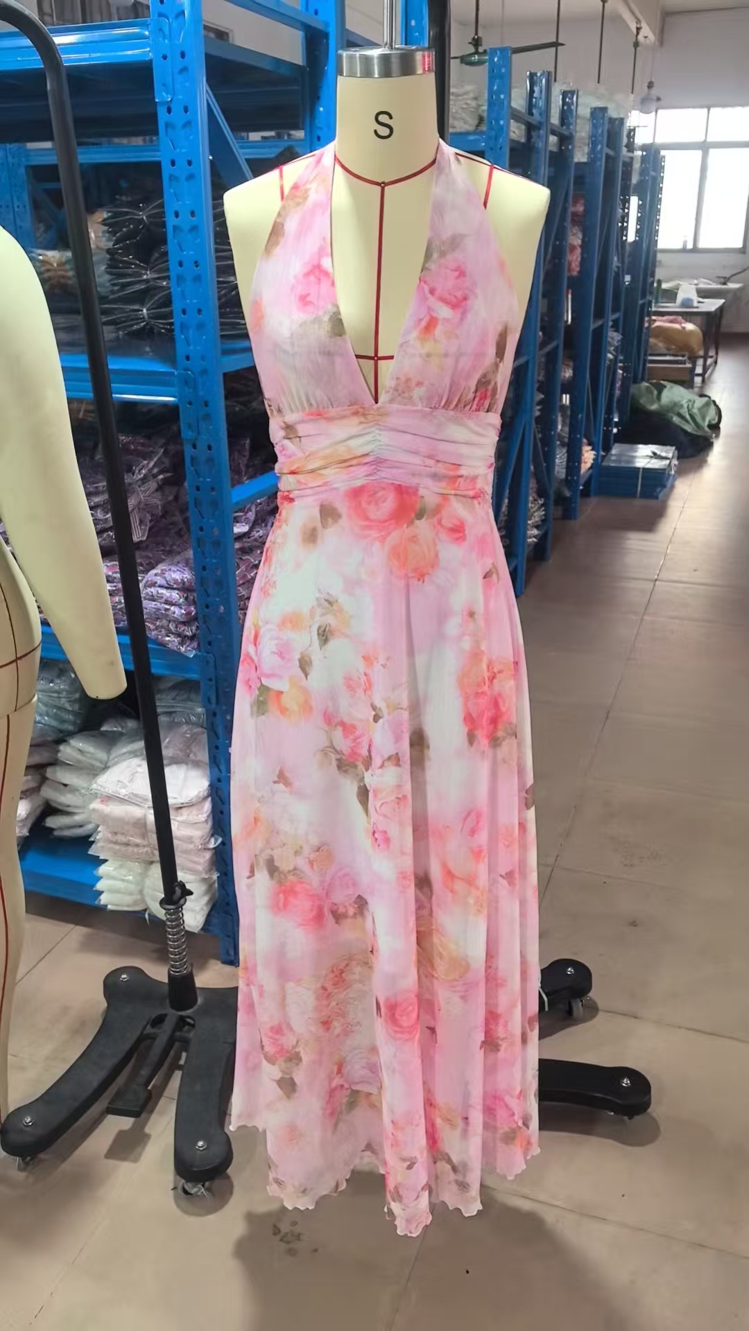 유럽과 미국의 Ins 스타일 국경 봄과 여름 새로운 패션 섹시한 원피스 백리스 슬림 핏 인쇄 된 목 교수형 원피스스토어 가기