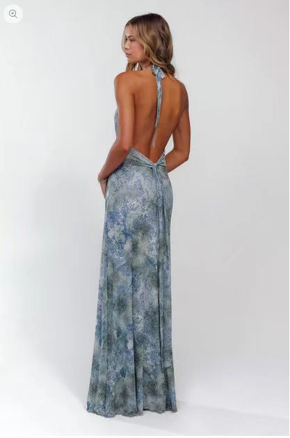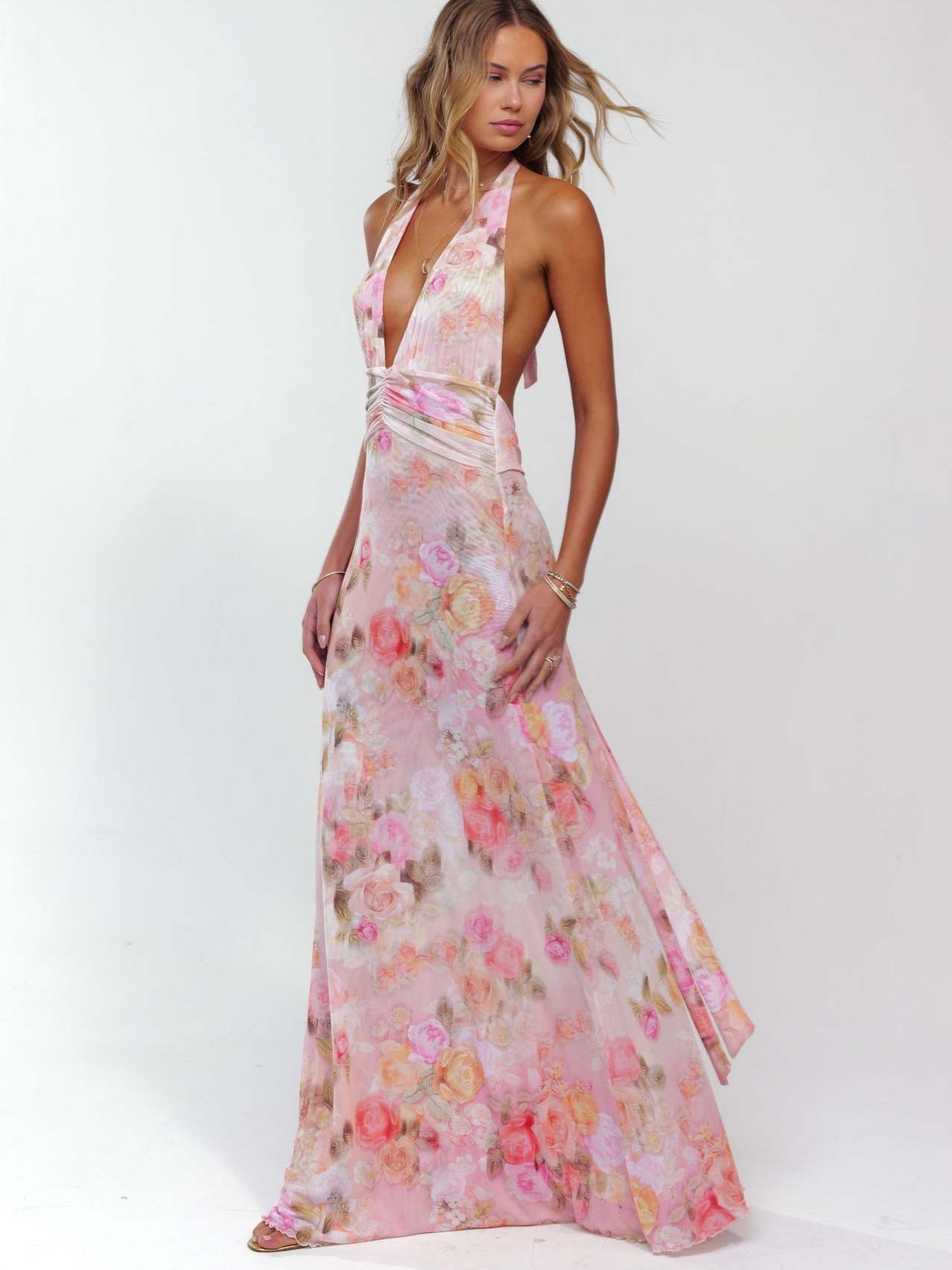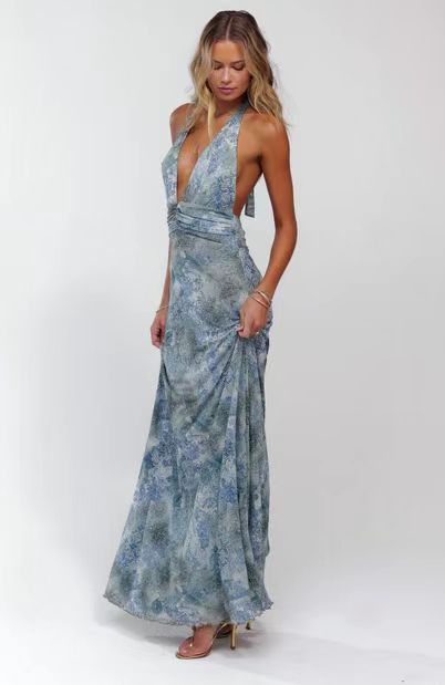 유럽과 미국의 Ins 스타일 국경 봄과 여름 새로운 패션 섹시한 원피스 백리스 슬림 핏 인쇄 된 목 교수형 원피스