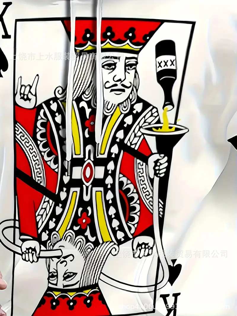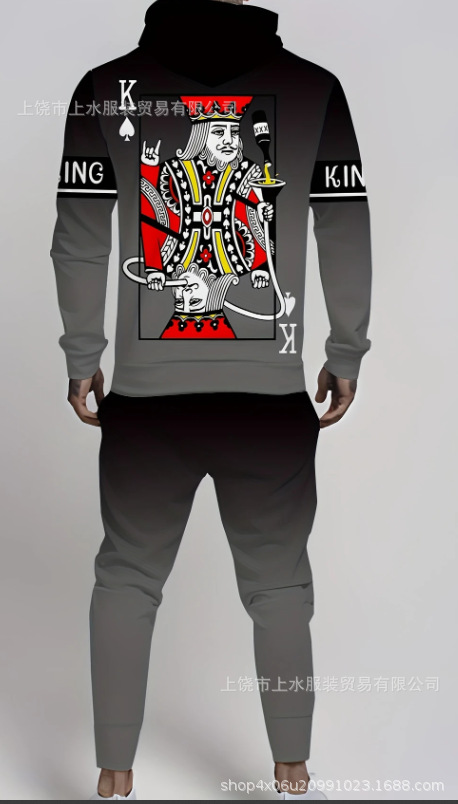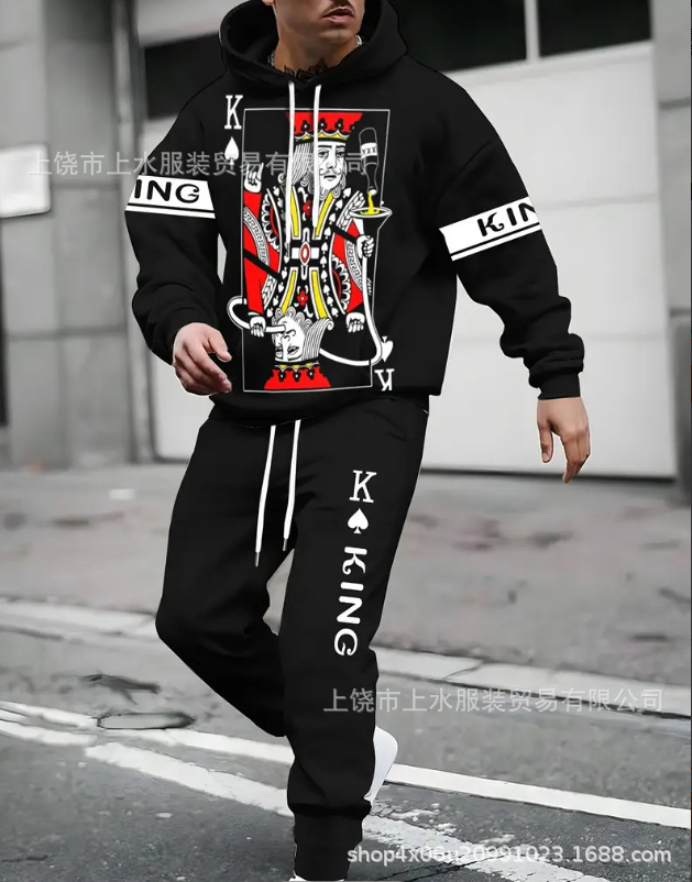 남성 캐주얼 후드티 및 스웨트팬츠 세트 - 포커 킹 프린트, 긴 소매, 폴리에스테르 혼방 슈트