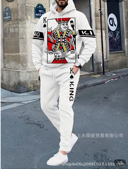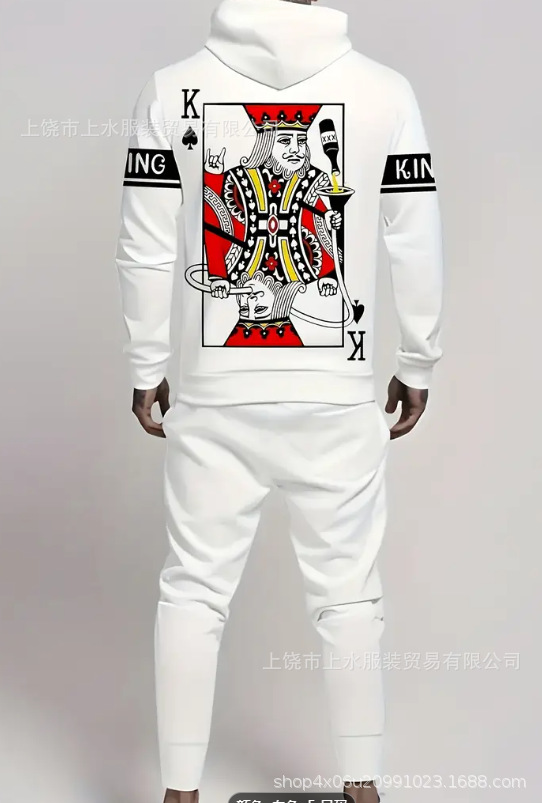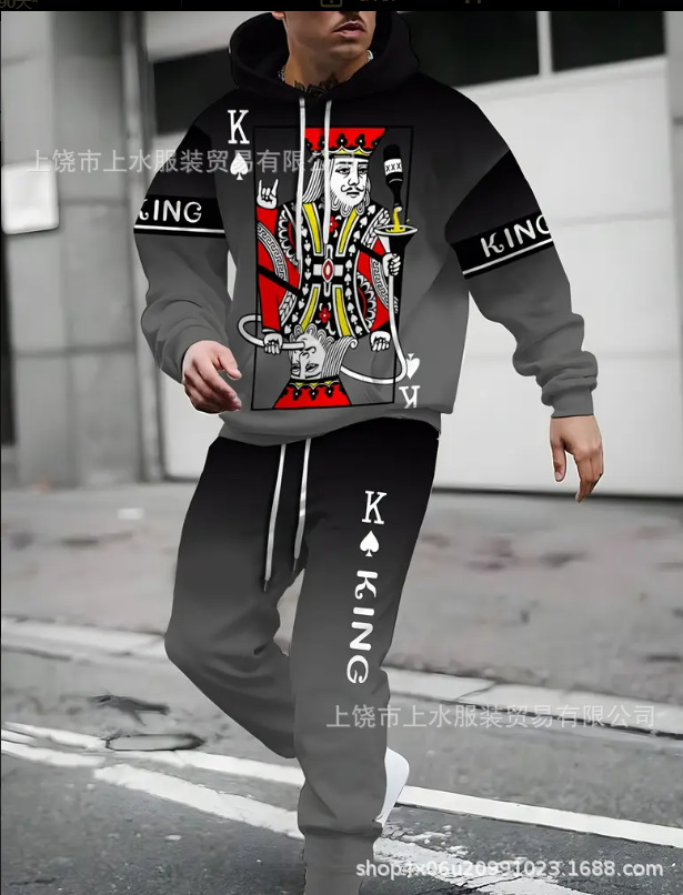 남성 캐주얼 후드티 및 스웨트팬츠 세트 - 포커 킹 프린트, 긴 소매, 폴리에스테르 혼방 슈트스토어 가기