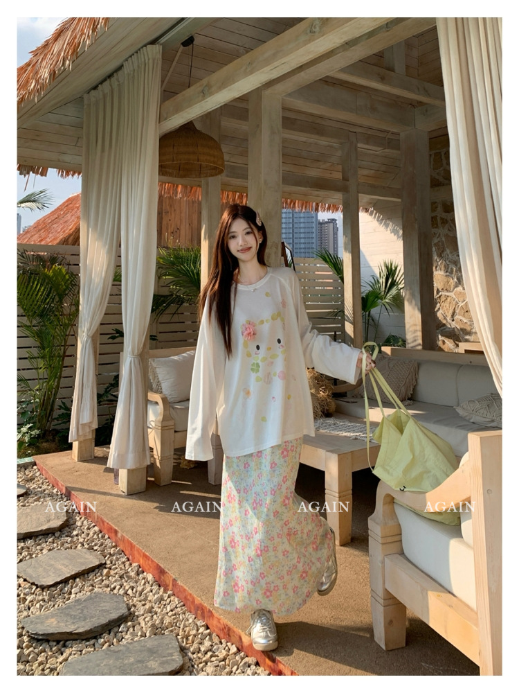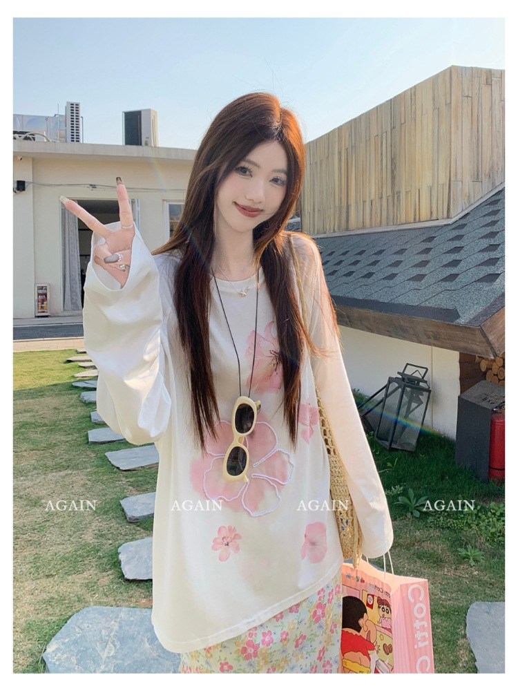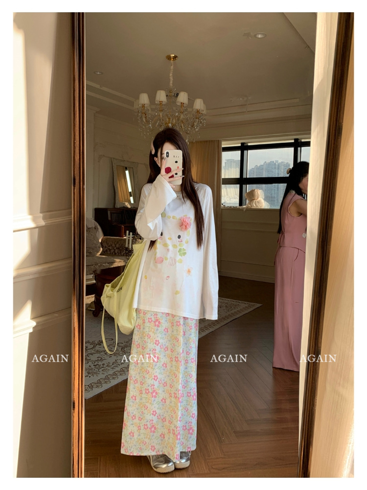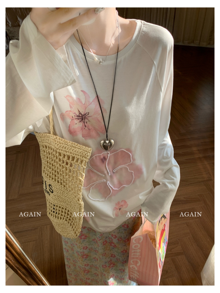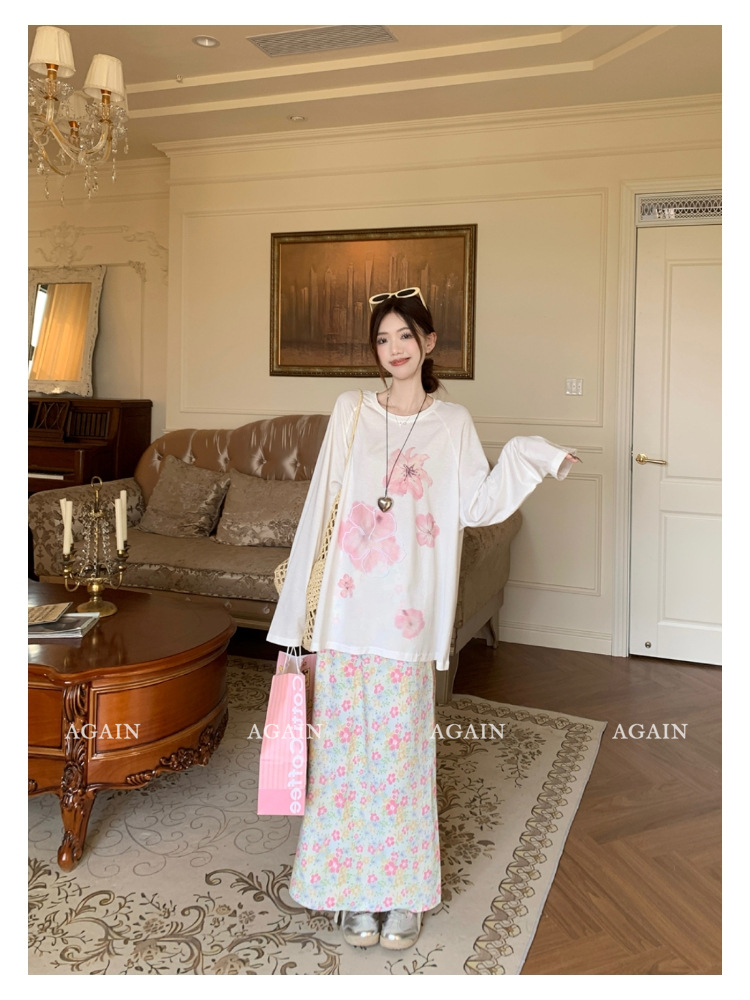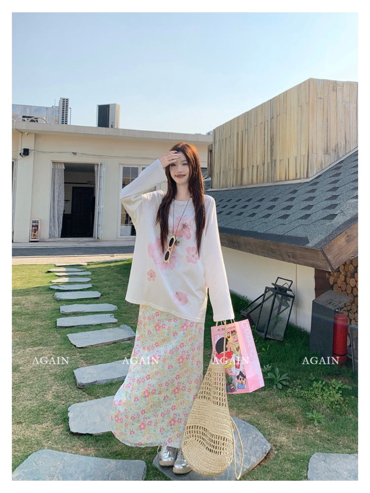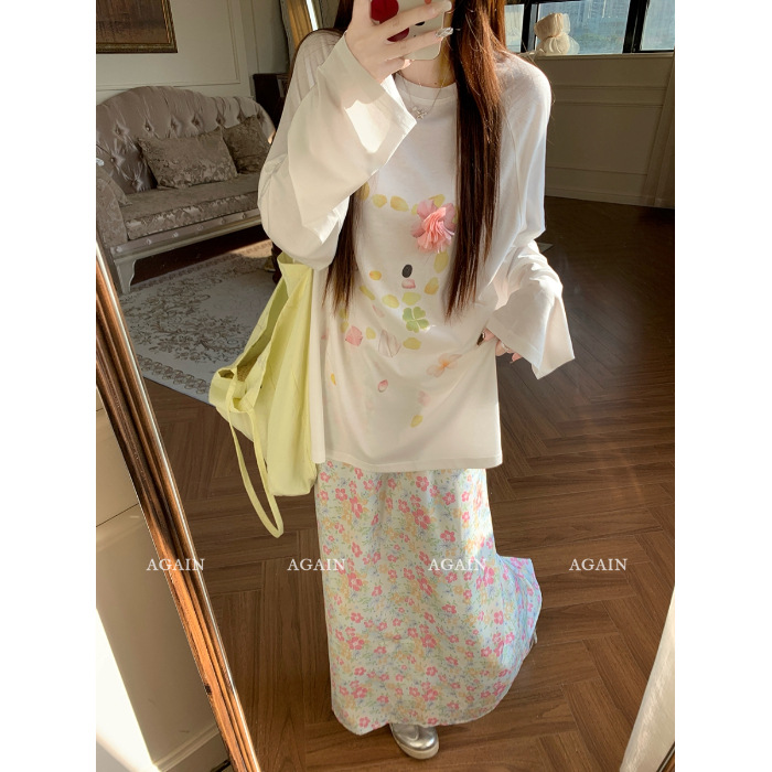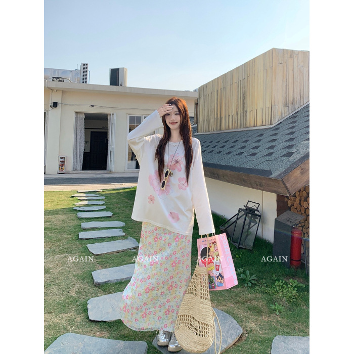 디자인 센스 인쇄 긴팔 티셔츠 여성의 2025 봄 느슨한 올매치 최고 달콤한 꽃 치마스토어 가기
