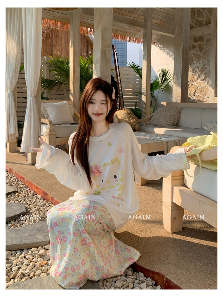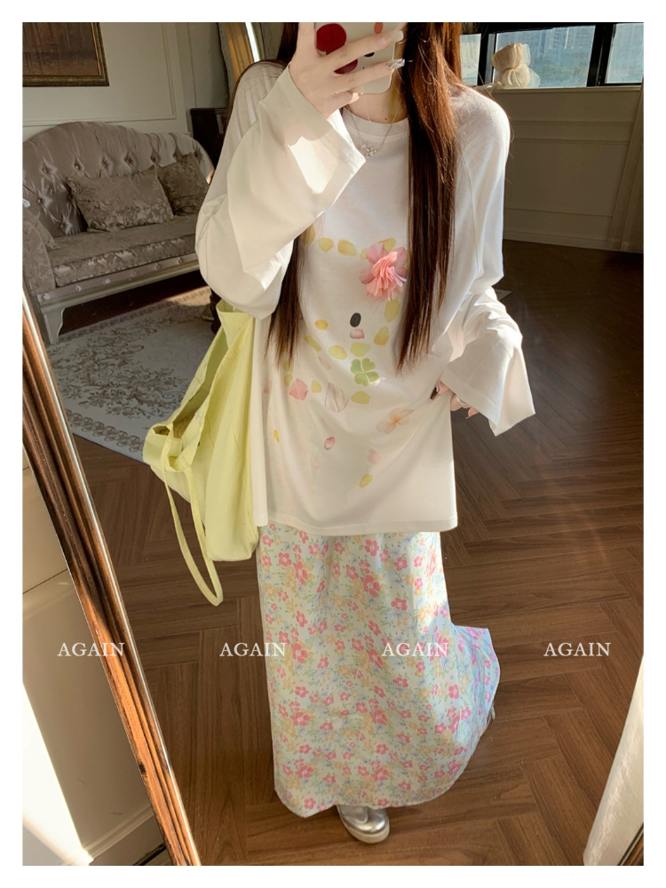 디자인 센스 인쇄 긴팔 티셔츠 여성의 2025 봄 느슨한 올매치 최고 달콤한 꽃 치마