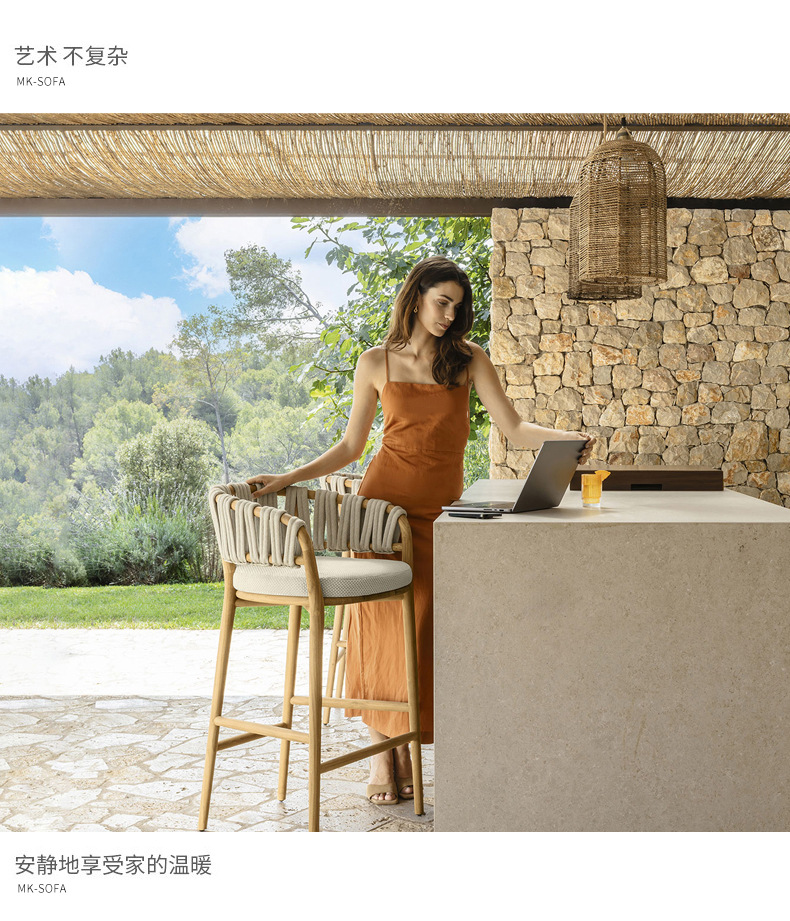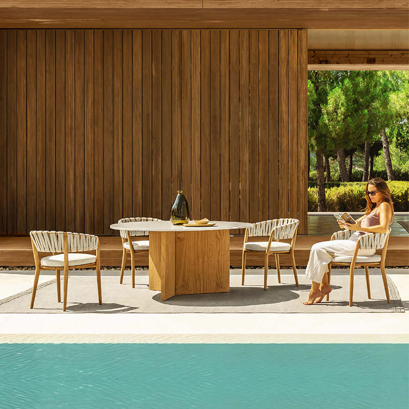 야외 원목 식탁과 의자, 비와 햇빛 차단, 빌라 호텔 야외 레스토랑, 등나무로 짠 티크 원탁과 의자 6개, 안뜰