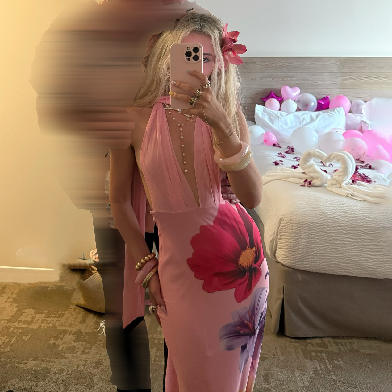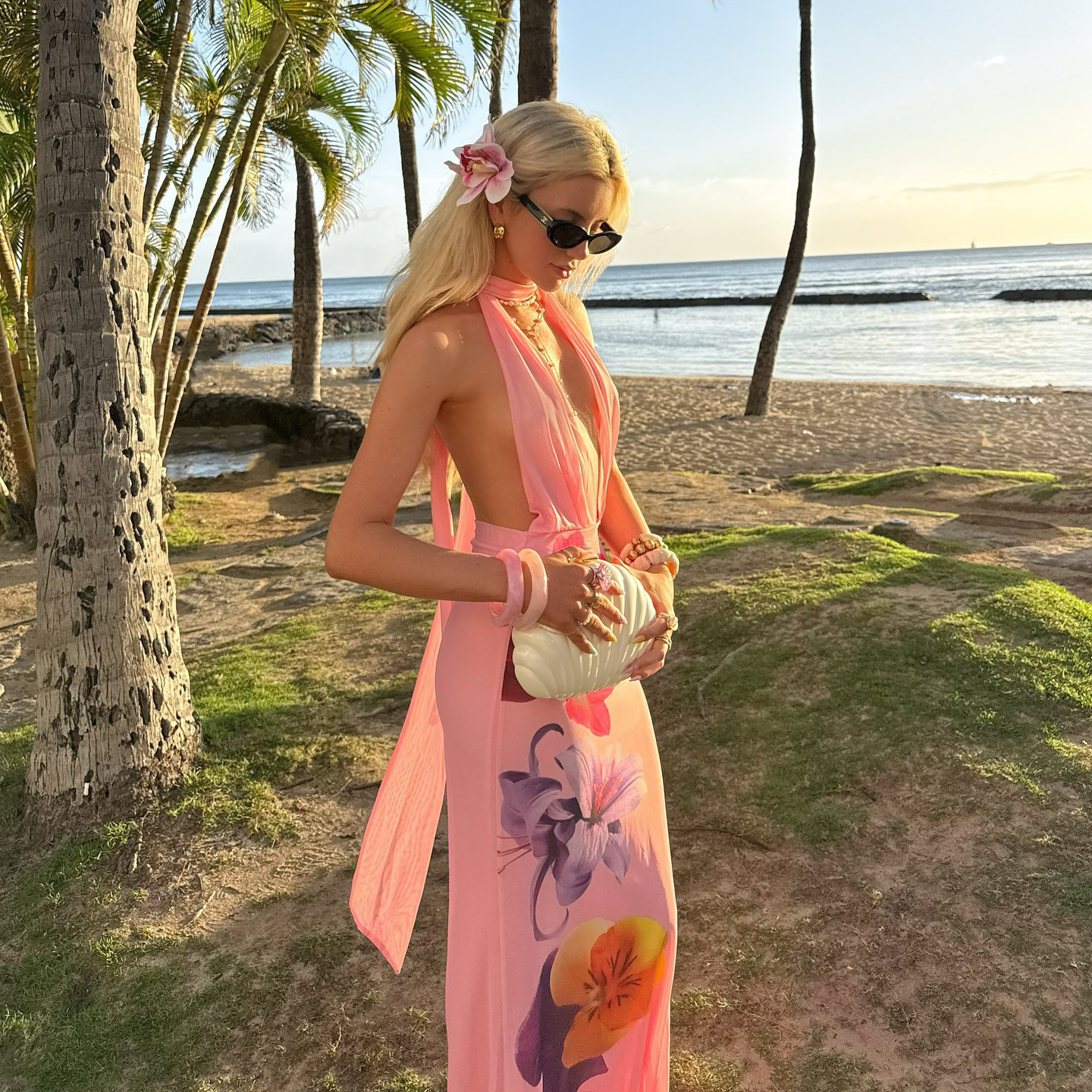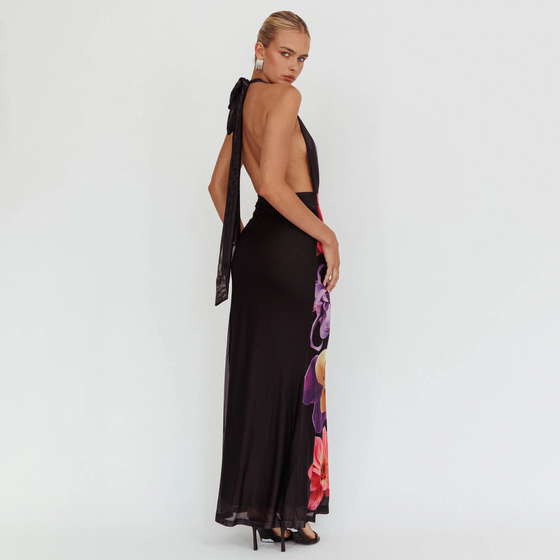 森系度假连衣裙春季新款网纱印花挂脖深V领露背无袖气质沙滩长裙