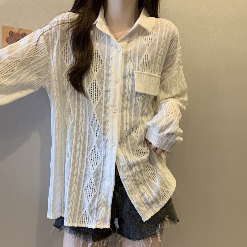 여성을위한 프랑스 세련된 크로 셰 뜨개질 중공 자외선 차단제 셔츠 2024 여름 새로운 슬림 롱 화이트 셔츠 탑