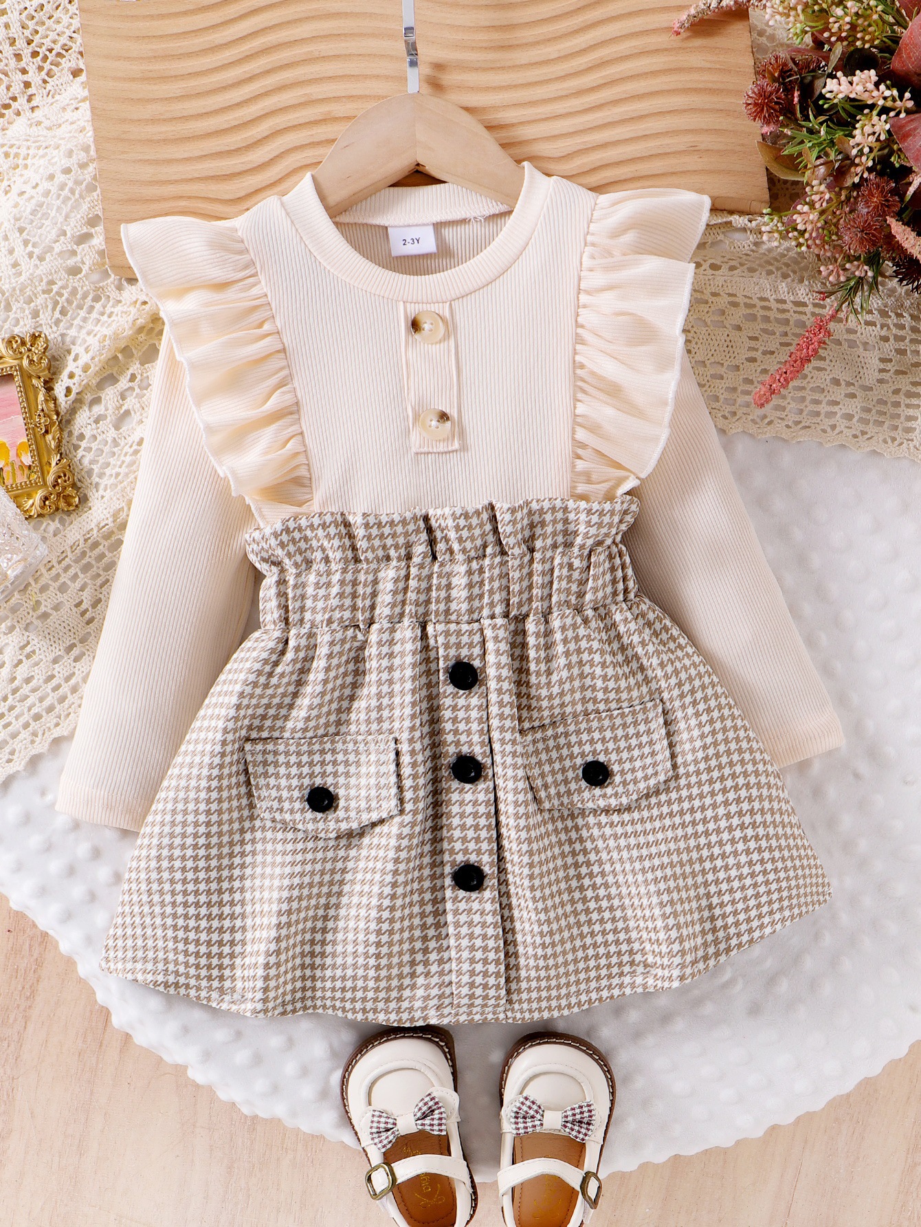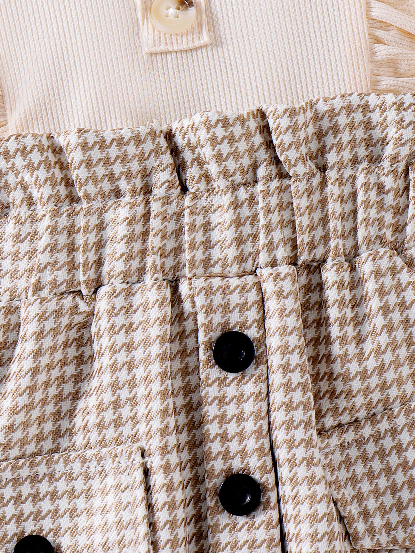 2025 국경 봄과 여름 새로운 소녀들의 세트 솔리드 컬러 러플 플라잉 슬리브 탑 (Houndstooth Short Skirt 투피스 세트)스토어 가기