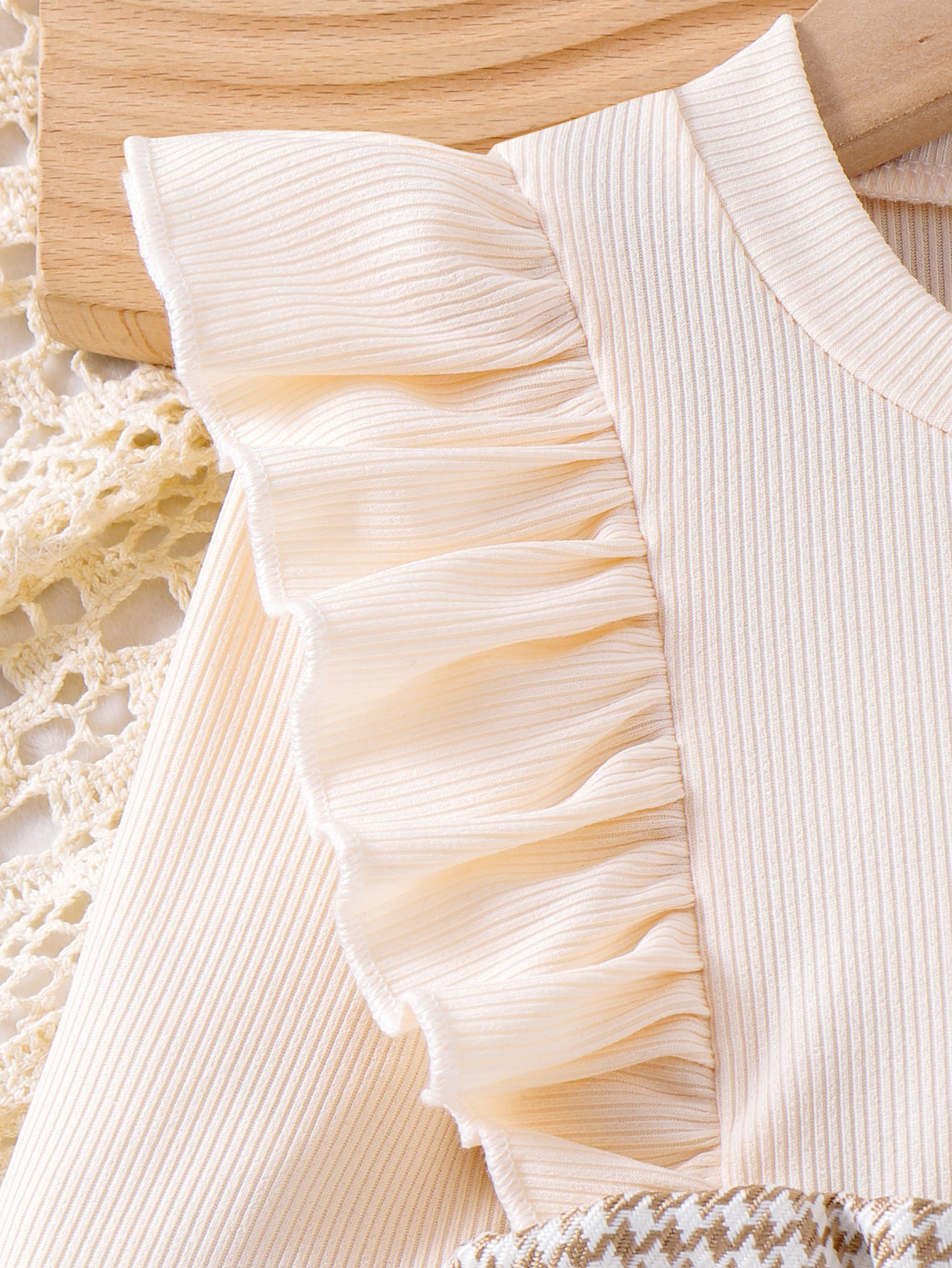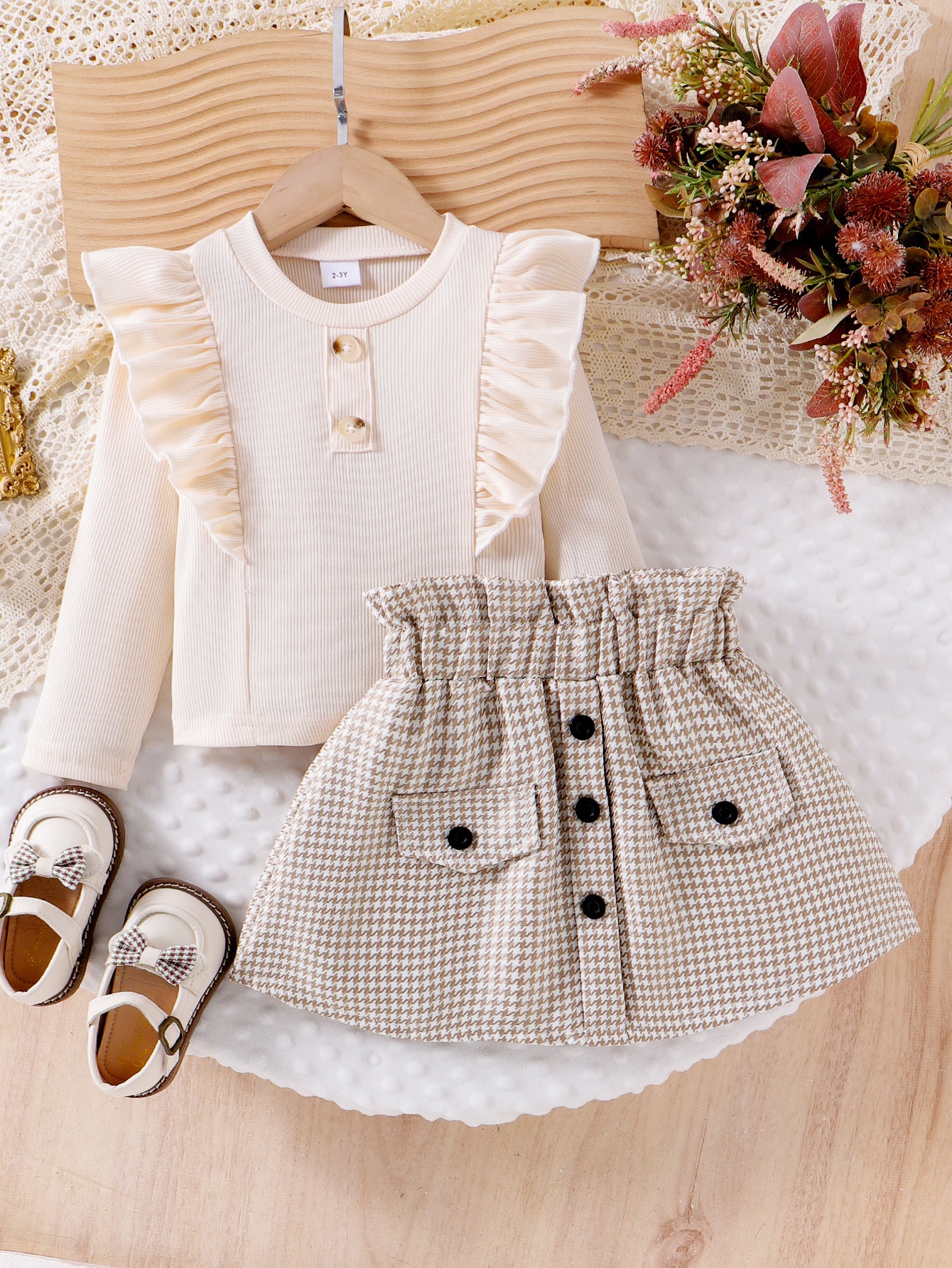 2025 국경 봄과 여름 새로운 소녀들의 세트 솔리드 컬러 러플 플라잉 슬리브 탑 (Houndstooth Short Skirt 투피스 세트)
