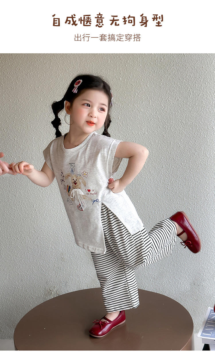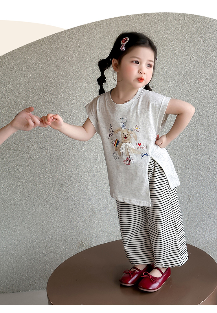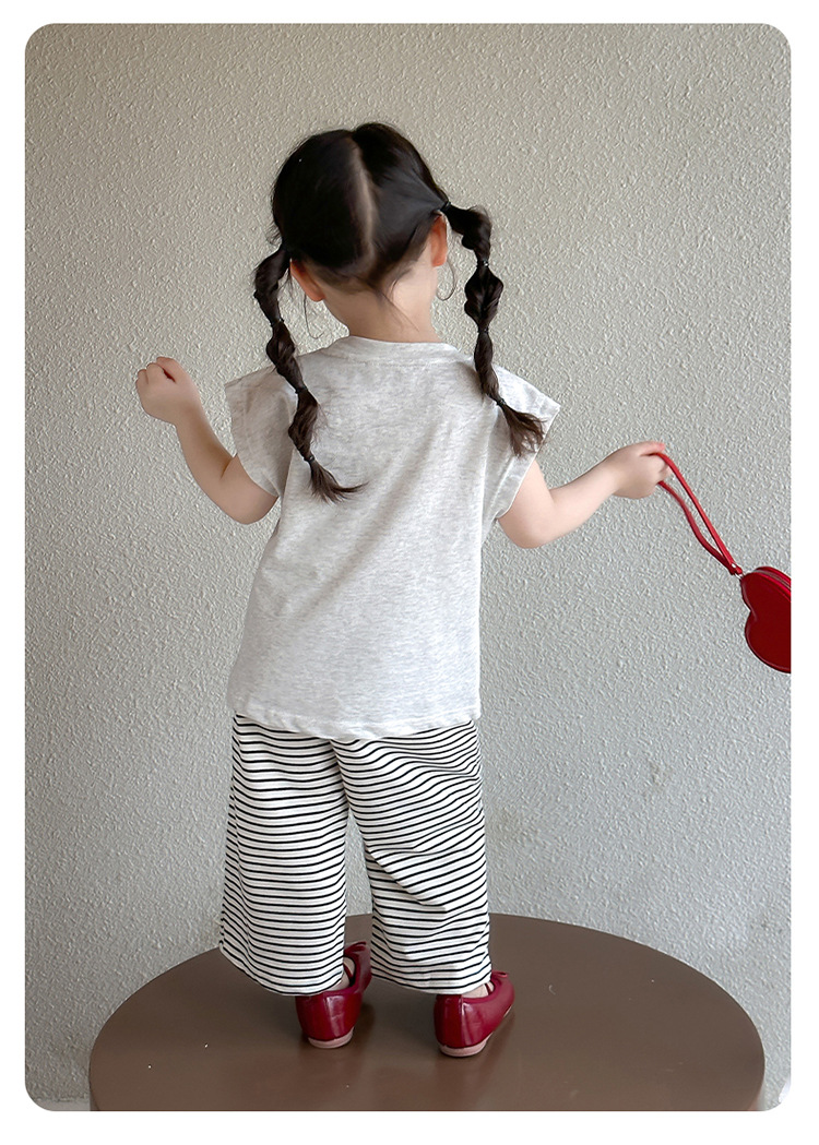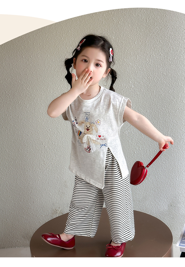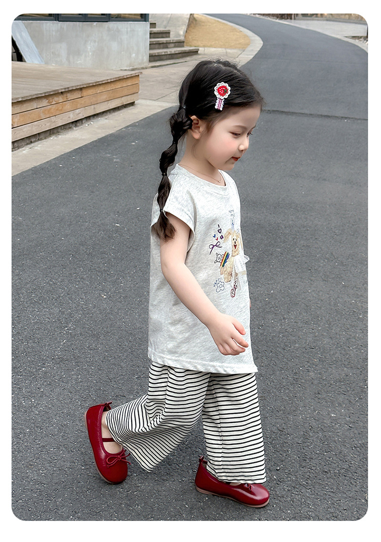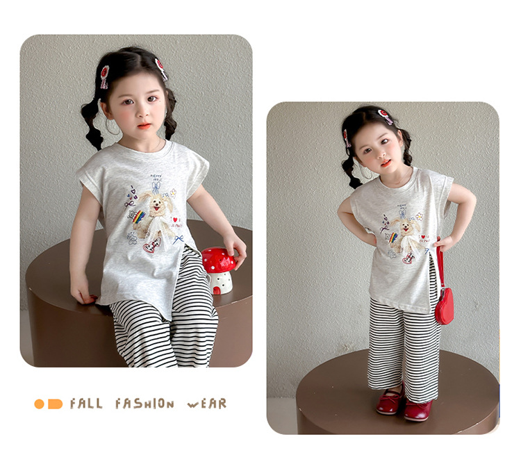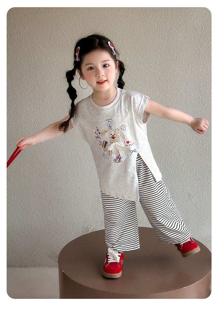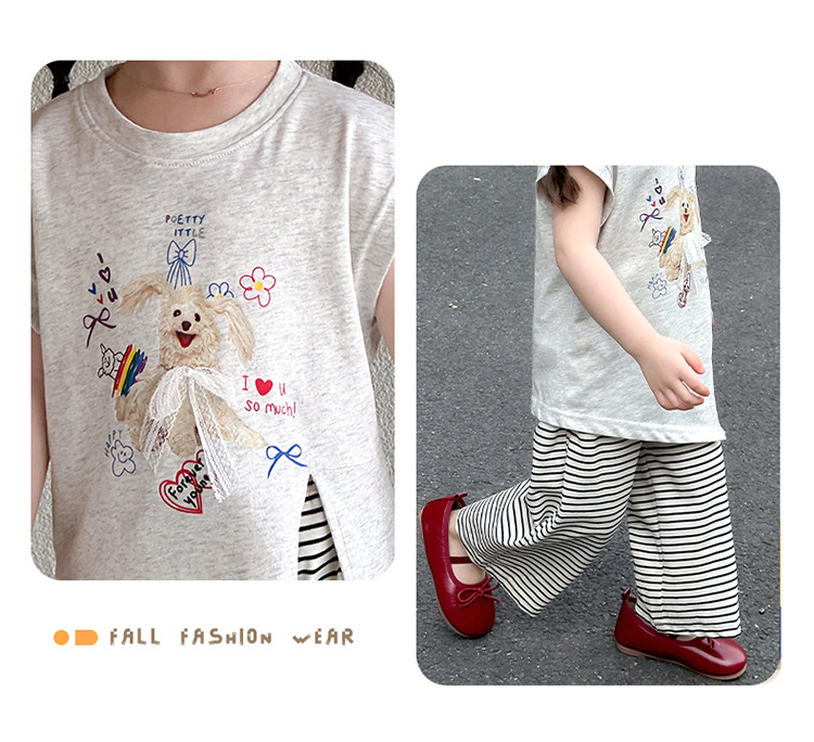 여자 만화 귀여운 분할 긴 티셔츠 스트라이프 넓은 다리 바지 투피스 세트 2025 여름 새로운 어린이 세트스토어 가기