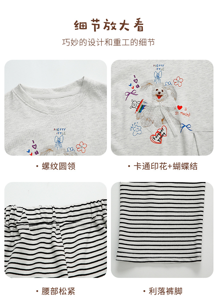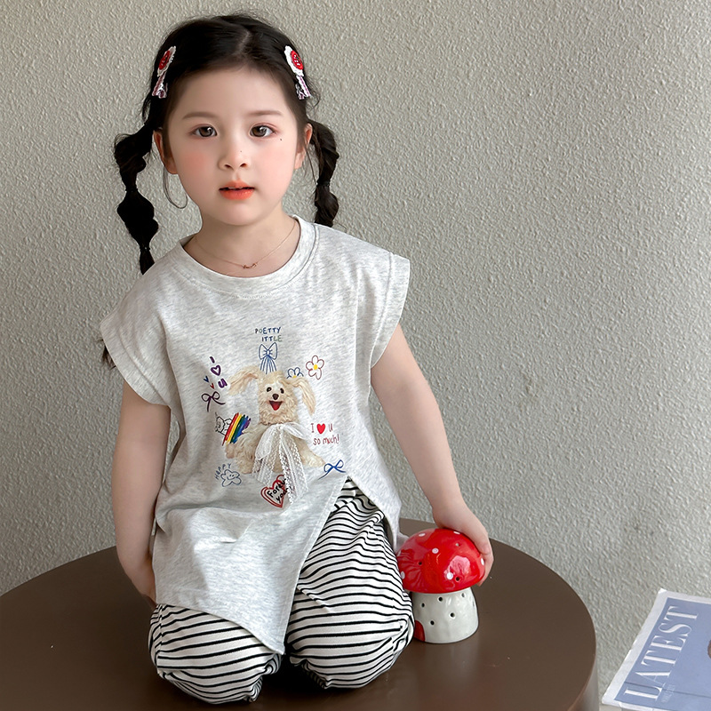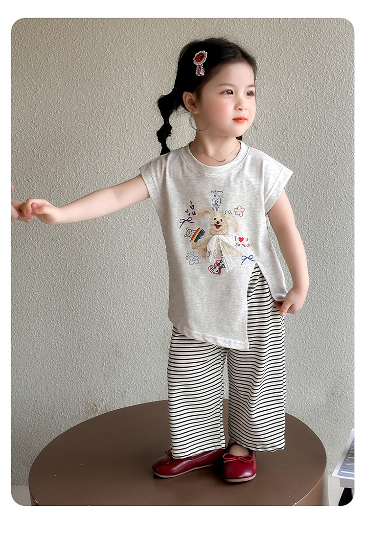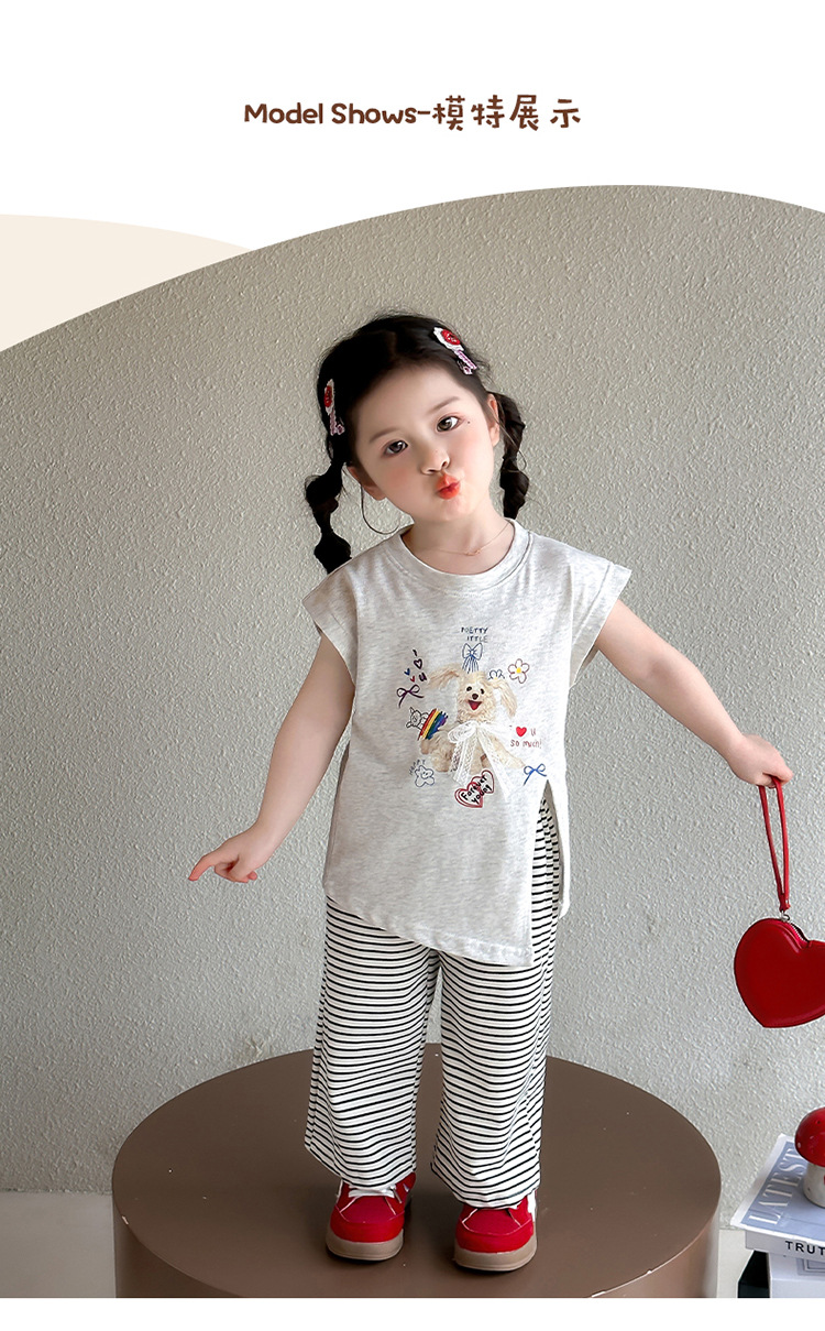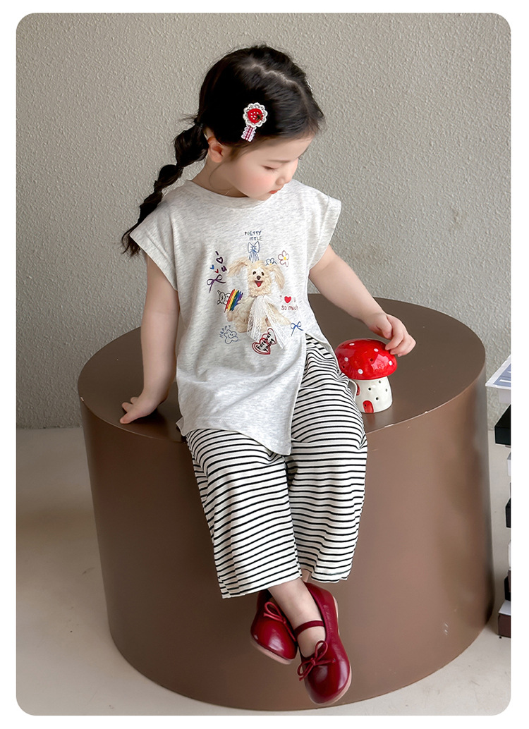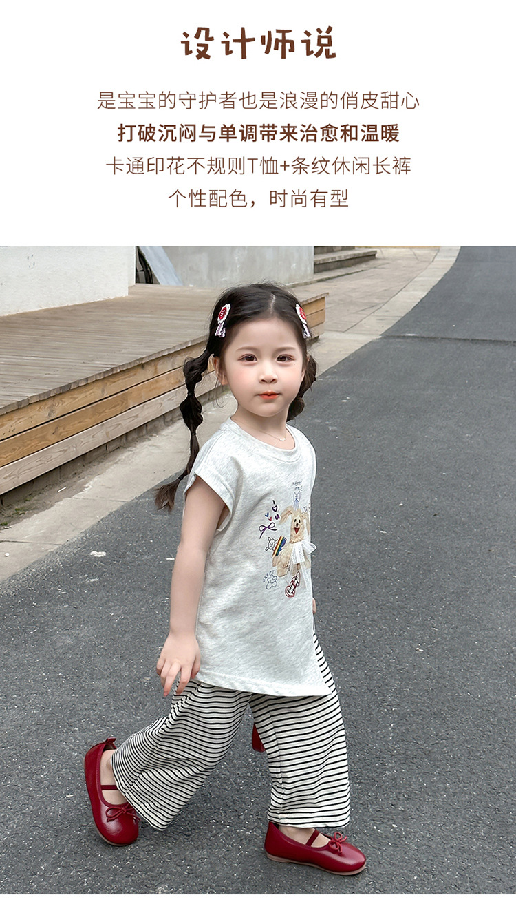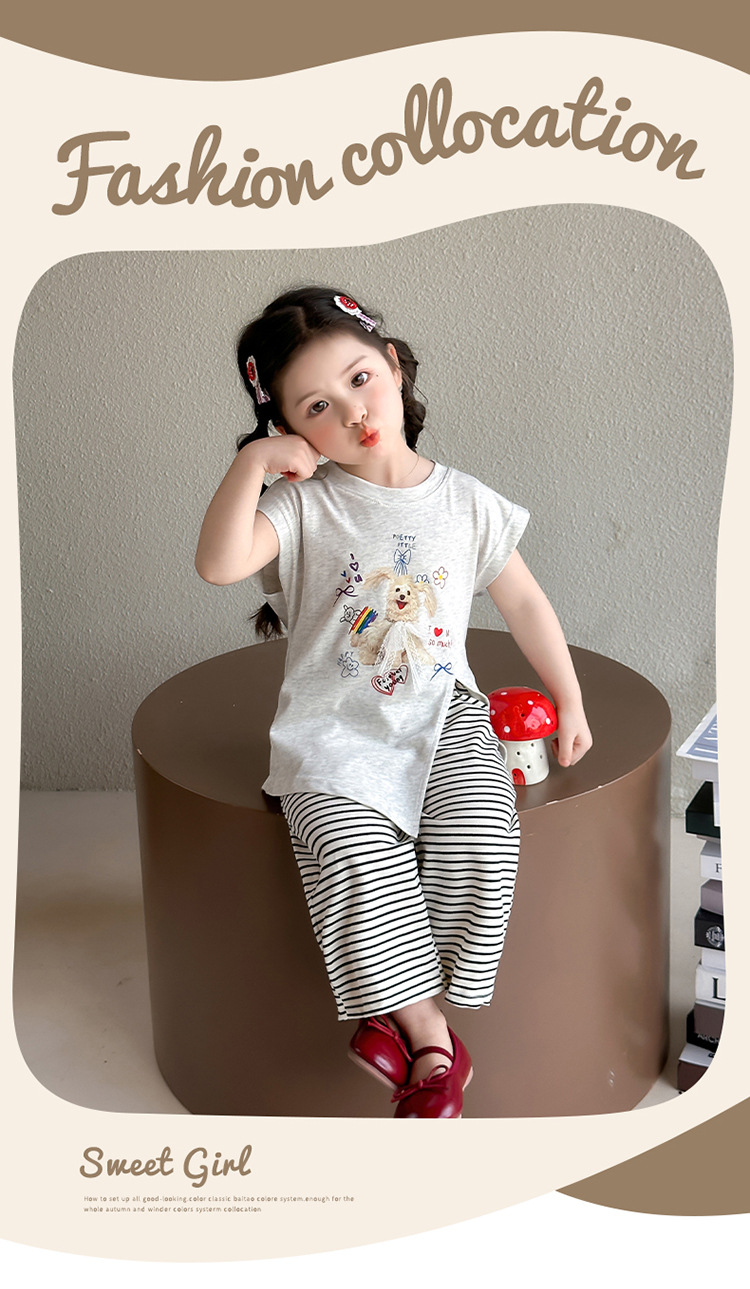 여자 만화 귀여운 분할 긴 티셔츠 스트라이프 넓은 다리 바지 투피스 세트 2025 여름 새로운 어린이 세트스토어 가기