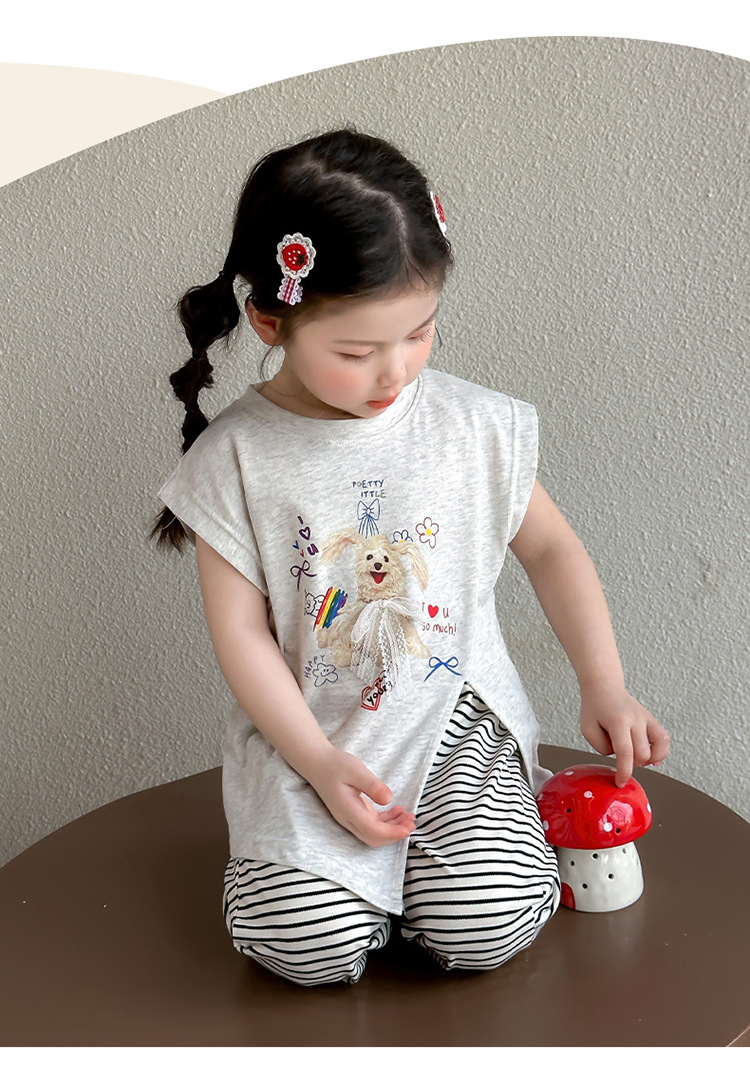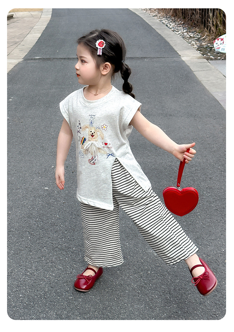 여자 만화 귀여운 분할 긴 티셔츠 스트라이프 넓은 다리 바지 투피스 세트 2025 여름 새로운 어린이 세트
