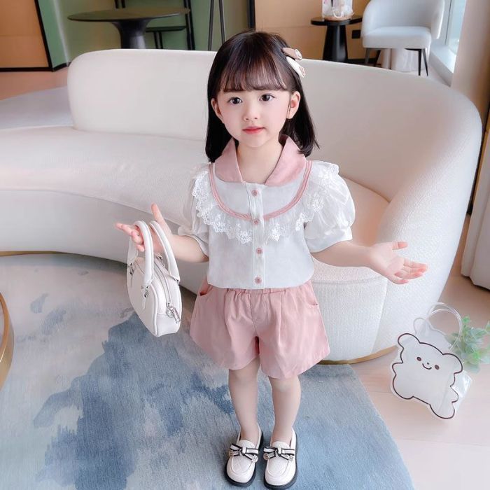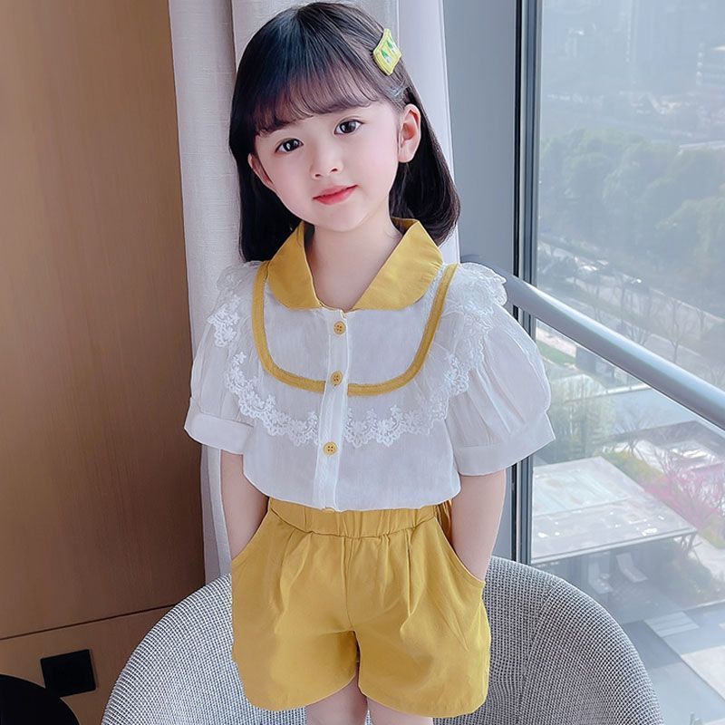 여자 레이스 양복 여름 얇은 2025 여름 새로운 스타일 어린이 한국 패션 반팔 반바지 투피스 세트 유행스토어 가기