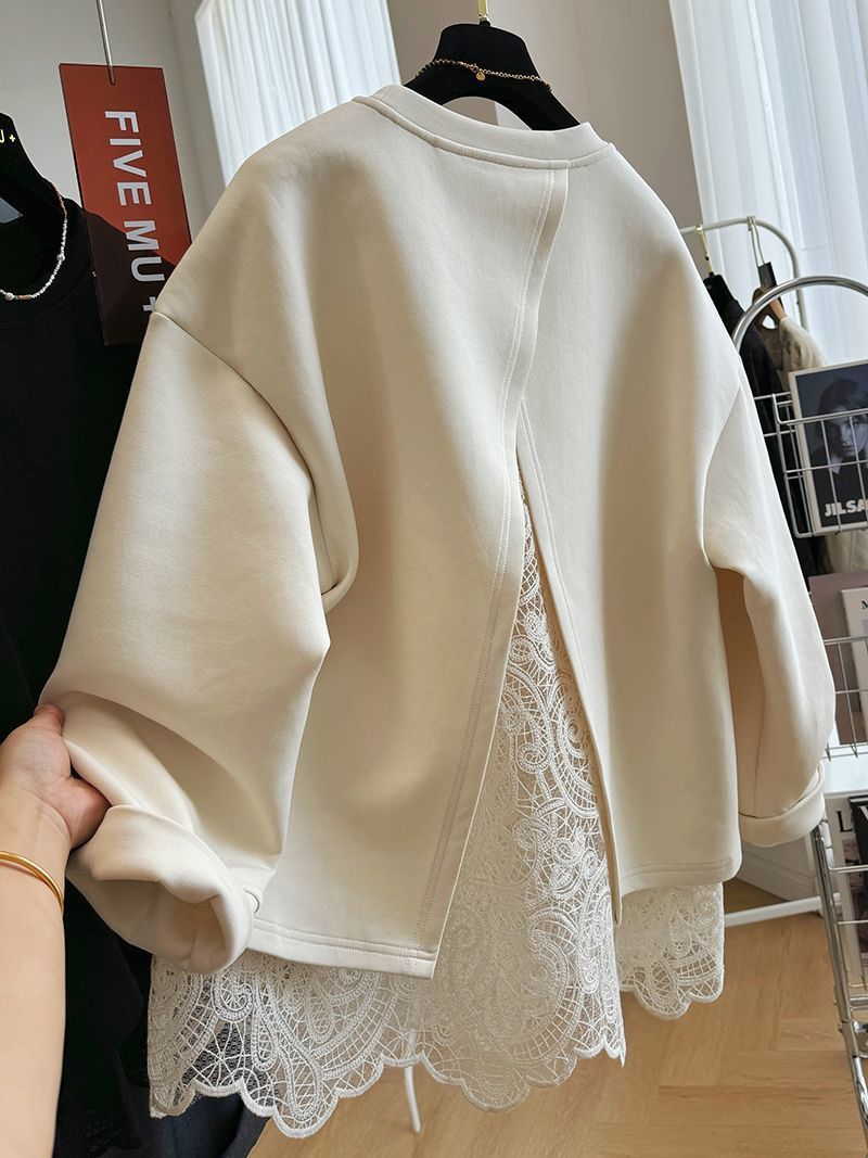 [4344명이 즐겨찾고 있는] 레이스 스플라이싱 페이크 투피스 풀오버 라운드넥 스웨트셔츠 여성용 봄, 가을 레이지 스타일 아메리칸 와이드