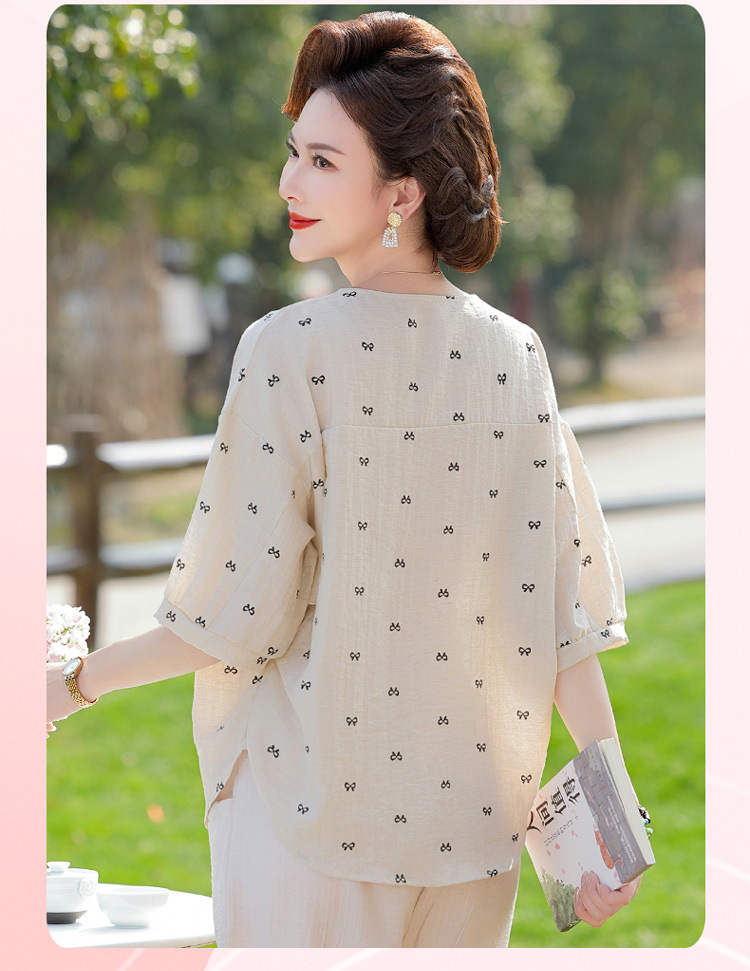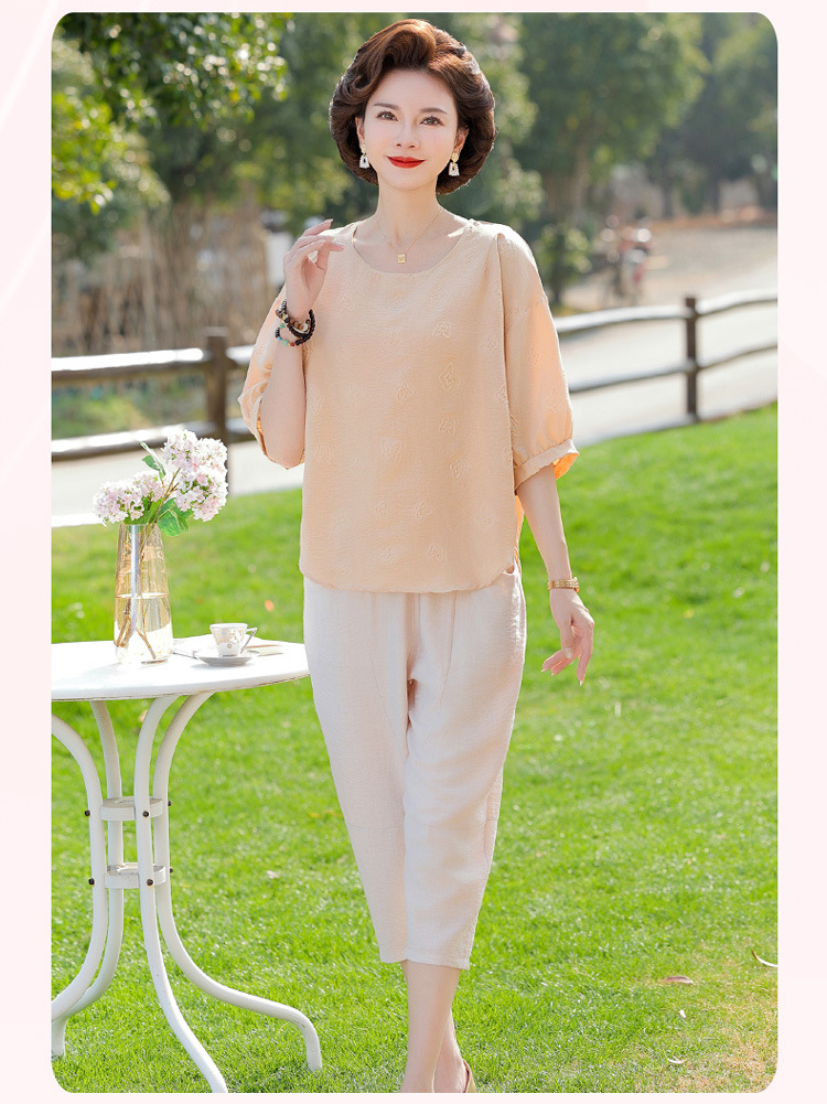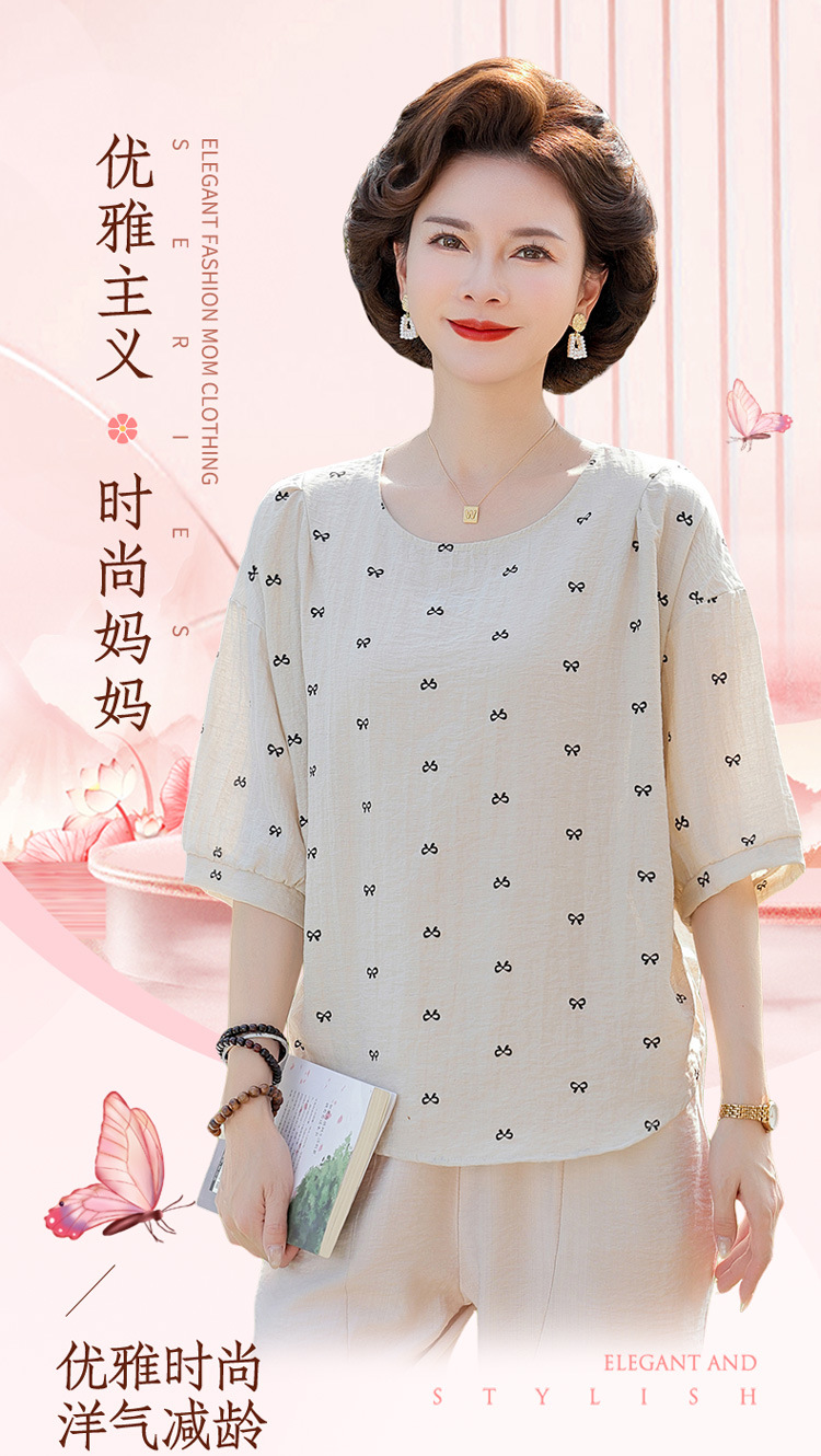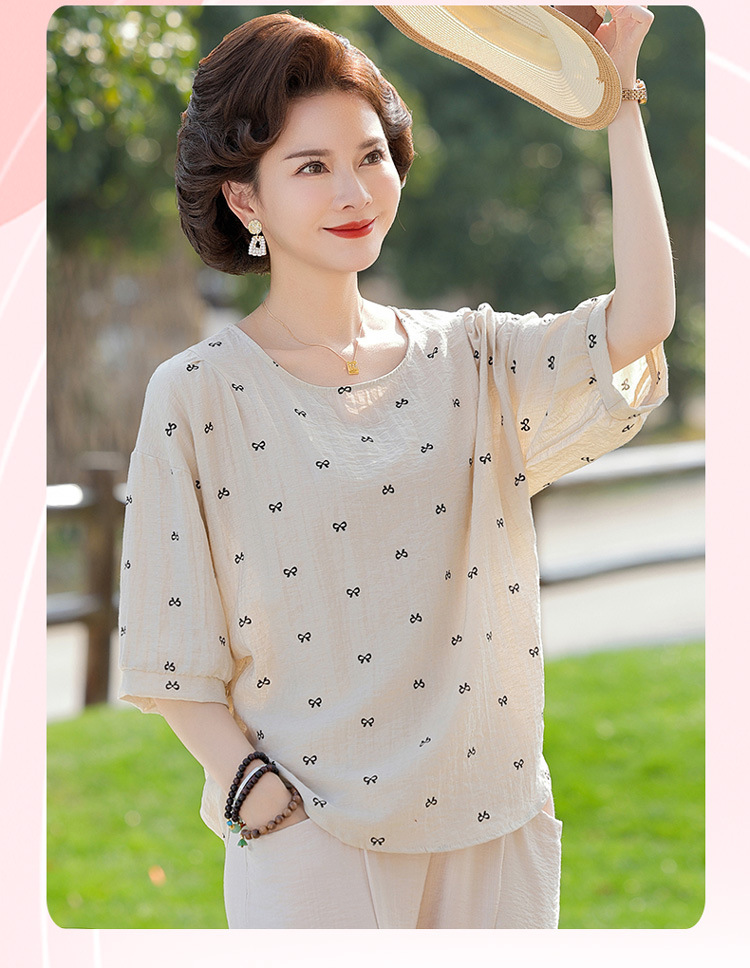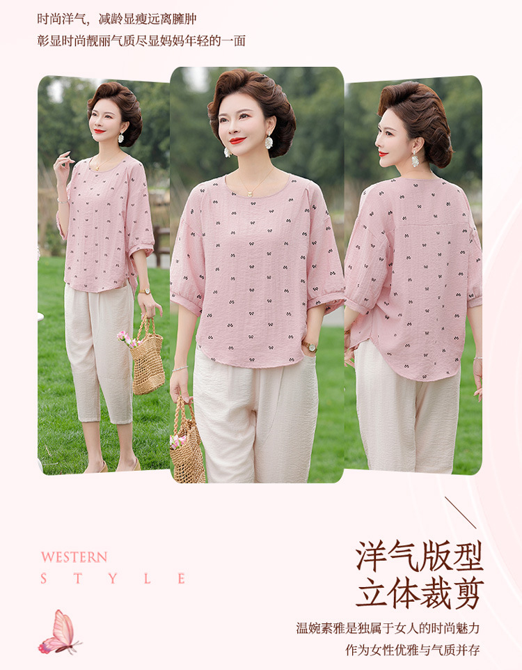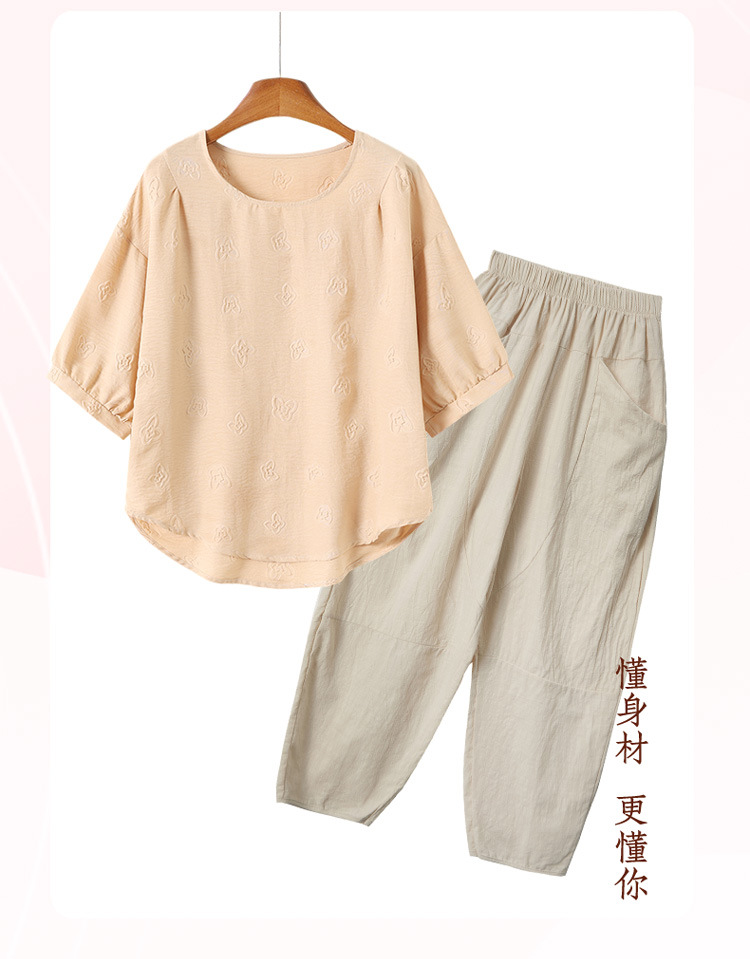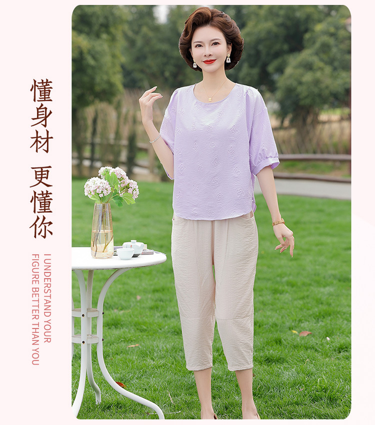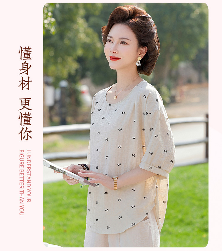 어머니의 여름 2025 새로운 면화와 리넨 세트 느슨한 플러스 사이즈 중년 및 노인 여성의 작은 캐주얼 바지 투피스 세트