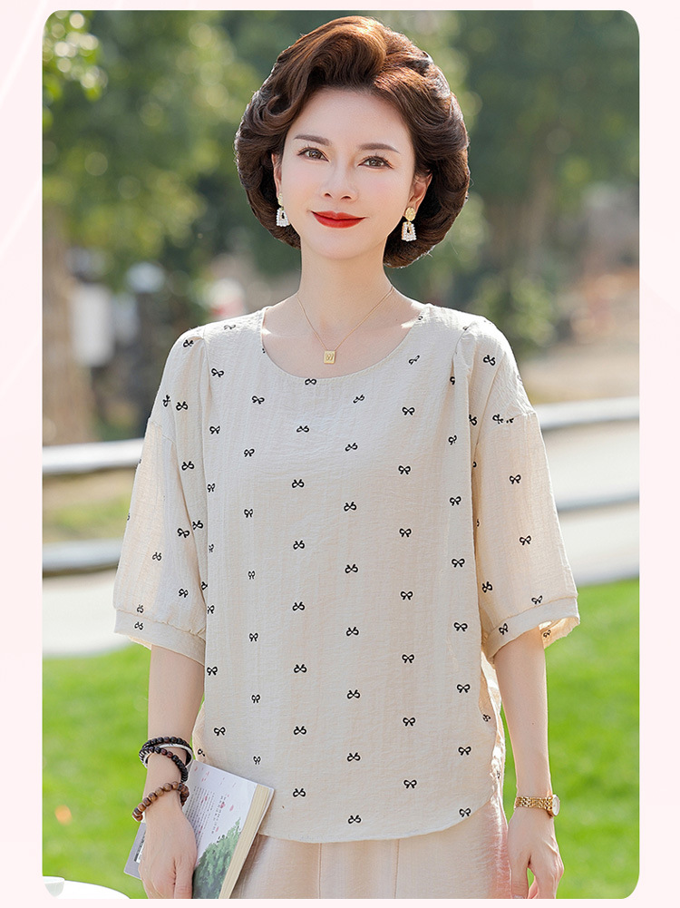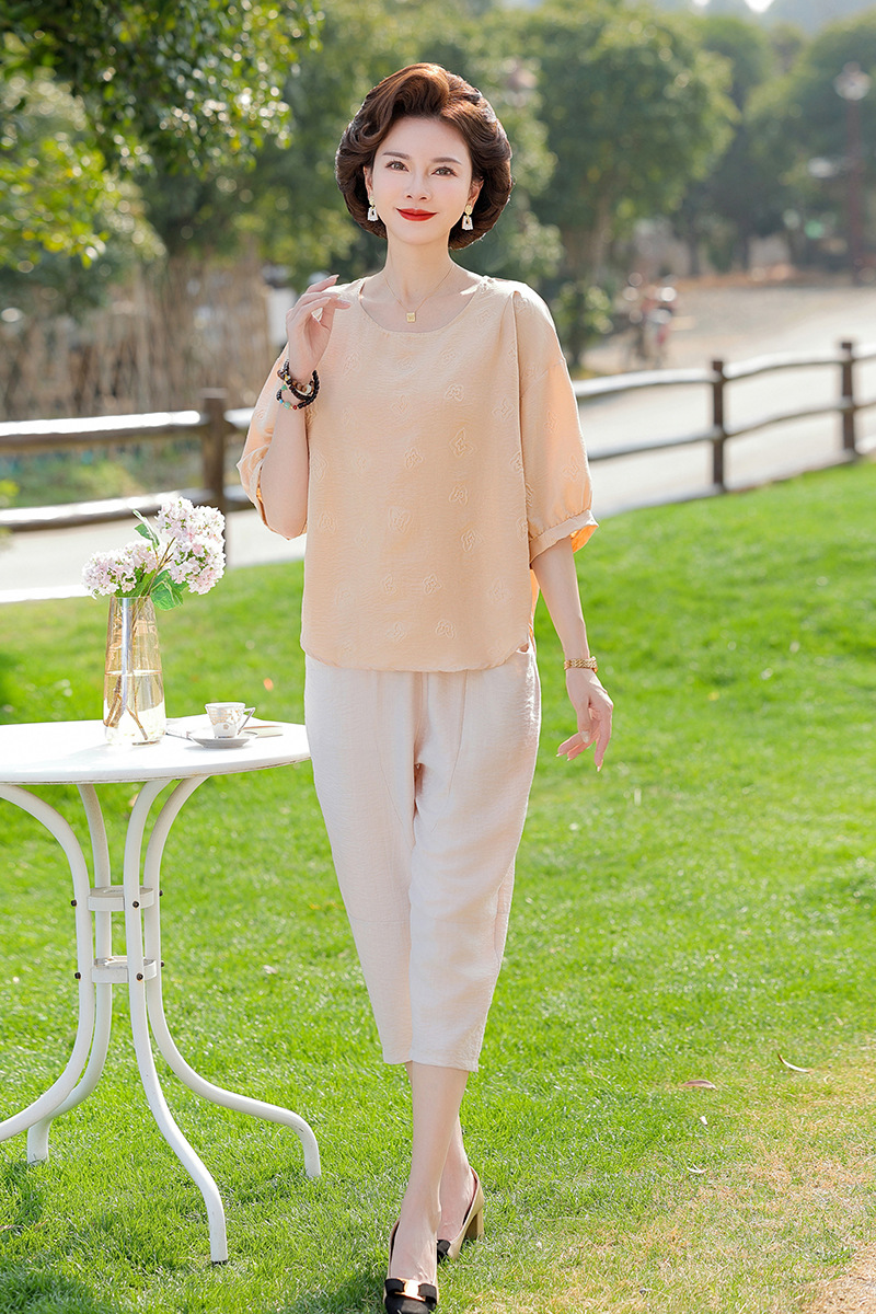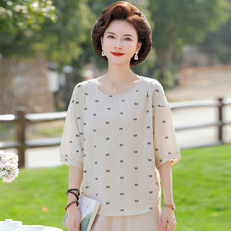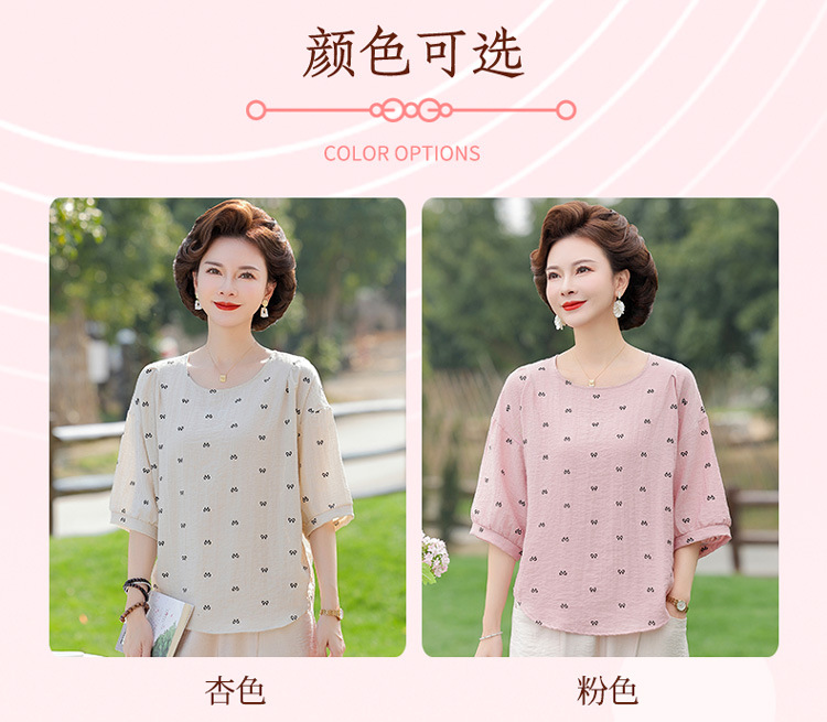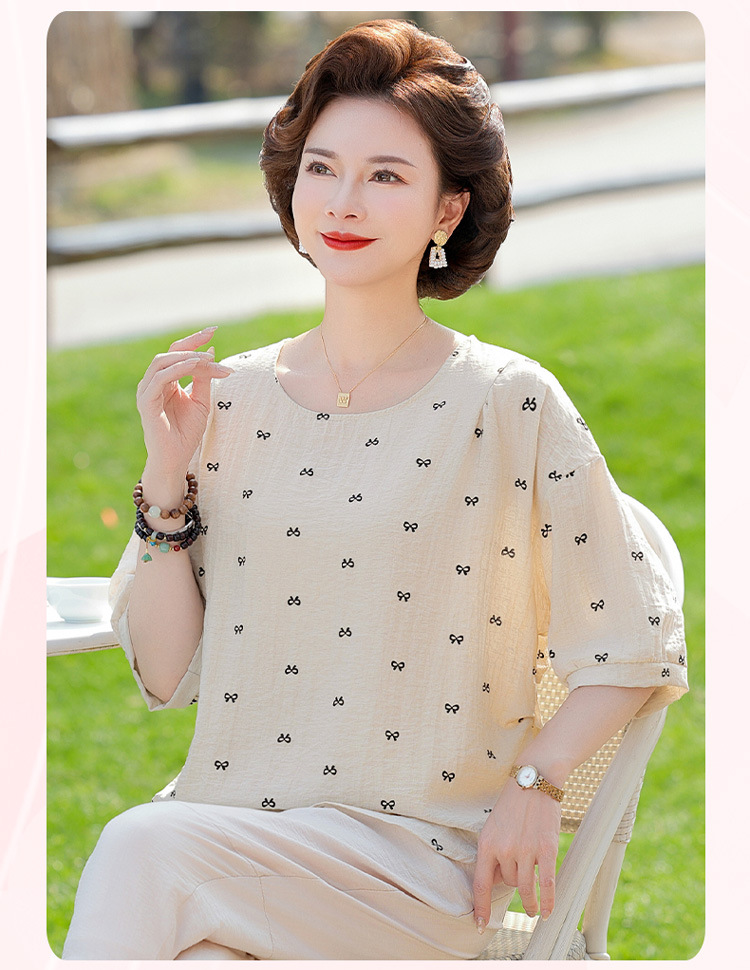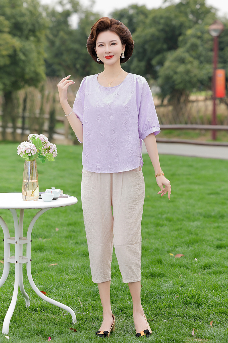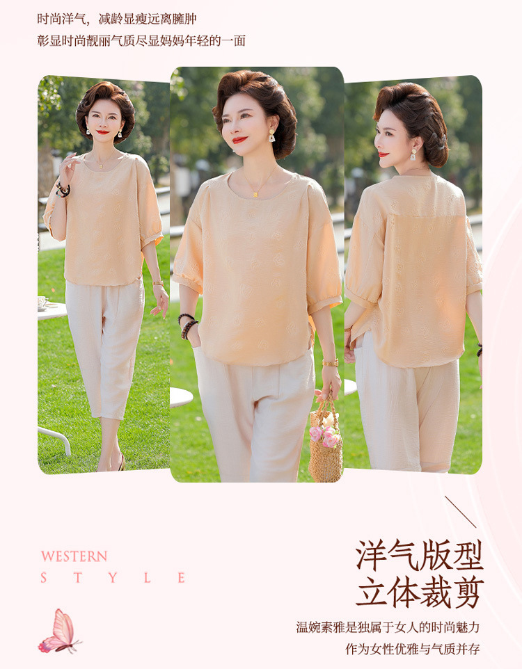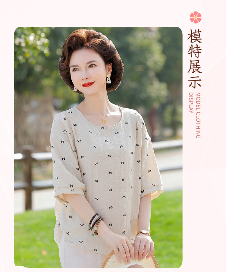어머니의 여름 2025 새로운 면화와 리넨 세트 느슨한 플러스 사이즈 중년 및 노인 여성의 작은 캐주얼 바지 투피스 세트