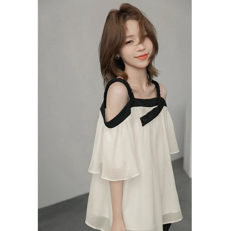 통통녀 플러스 사이즈 150.00kg 달콤한 스트랩리스 콘트라스트 쉬폰 셔츠 여자의 여름 느슨한 우아한 반팔 작은 셔츠 톱 2스토어 가기