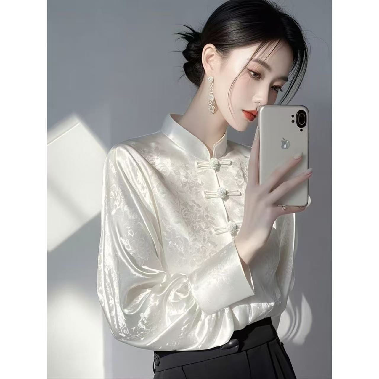 새로운 중국 스타일 국가 스타일 내베이스 셔츠 여성의 2025 년 초 봄 하이 엔드 라이트 럭셔리 에이지 감소 서양식 화이트 자카드 셔츠