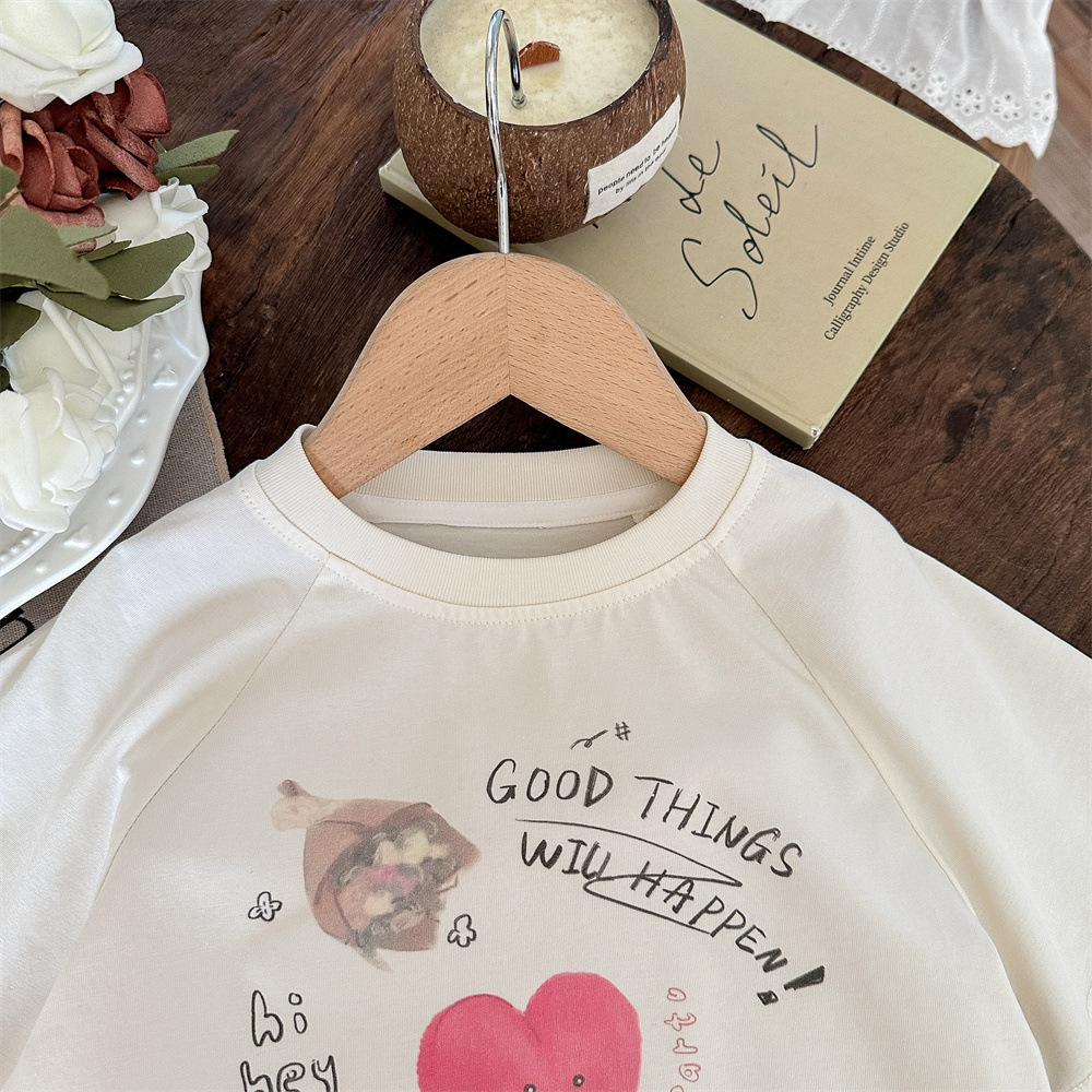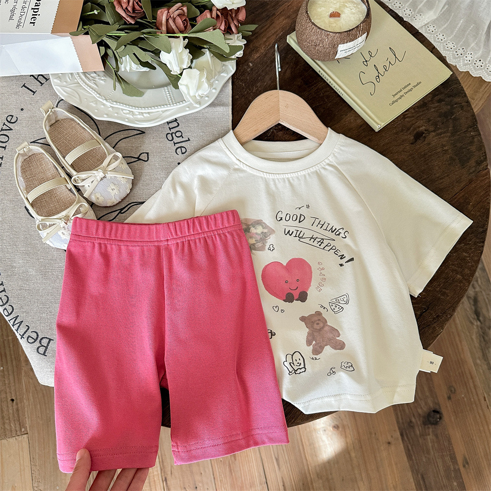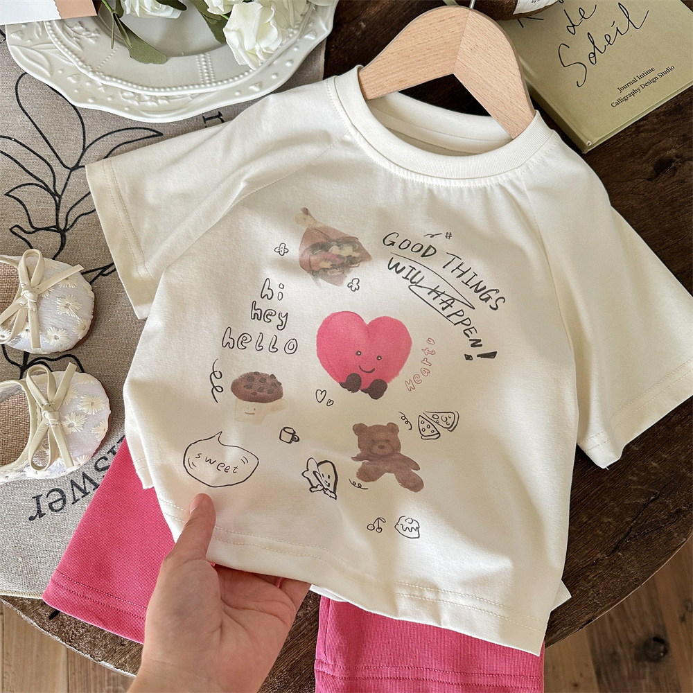 [핑크] 어린이 반팔 티셔츠 외국식 귀여운 달콤한 소녀 만화 낙서 화이트 탑 세트