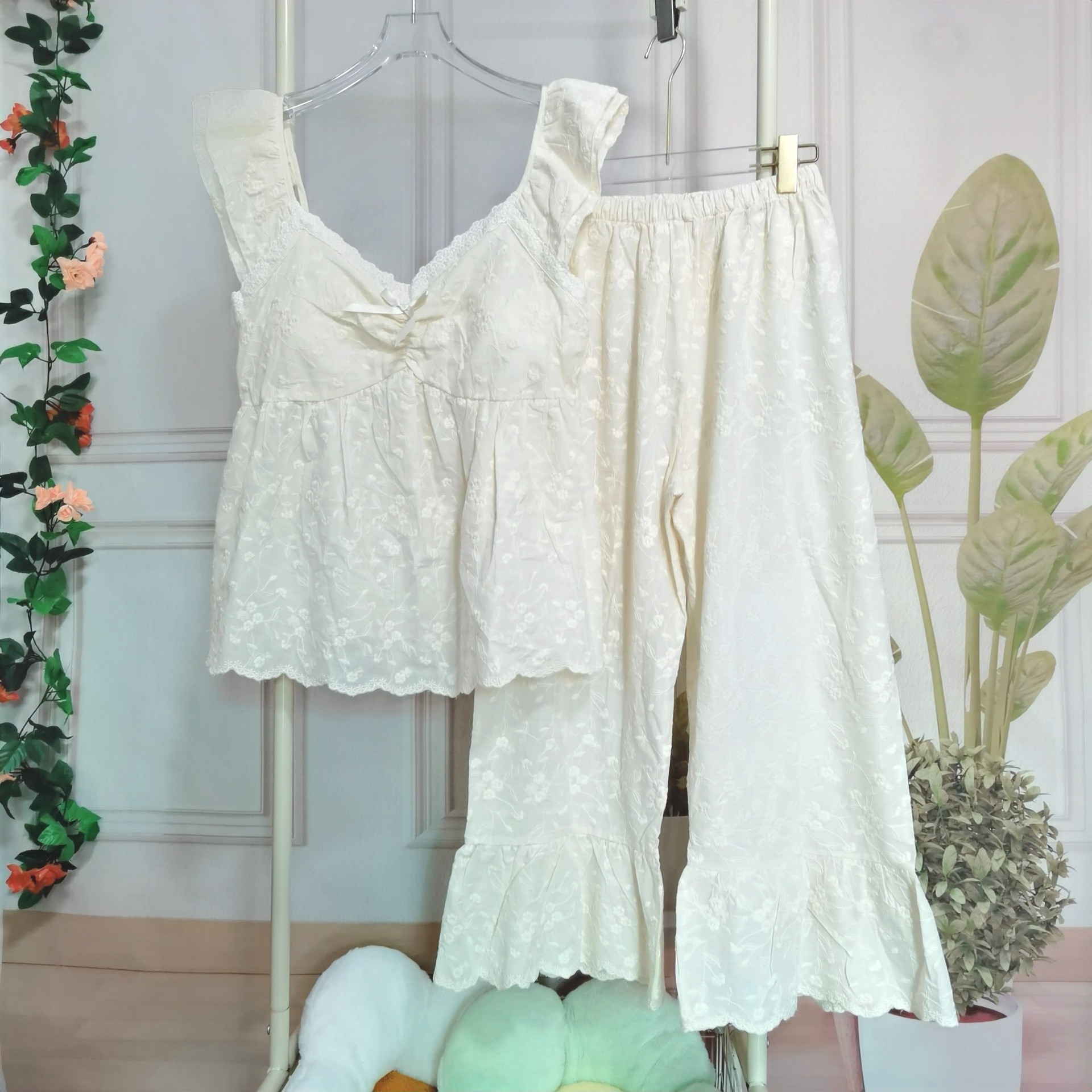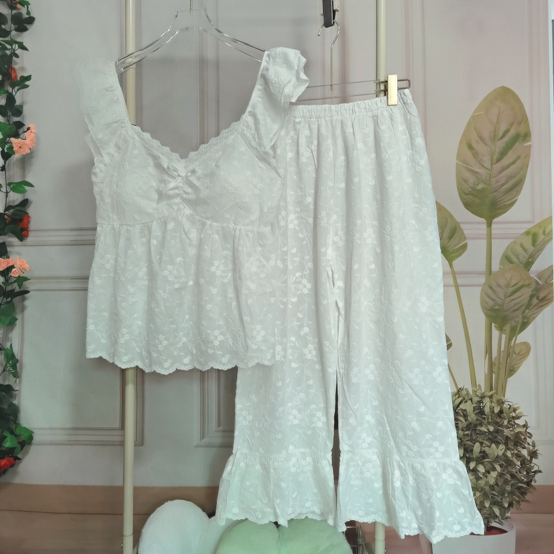 슬링과 가슴 패드 잠옷 여성의 여름 새로운 도착 헤비 듀티 자수 달콤한 달콤한 공주 자른 바지 고급 세트