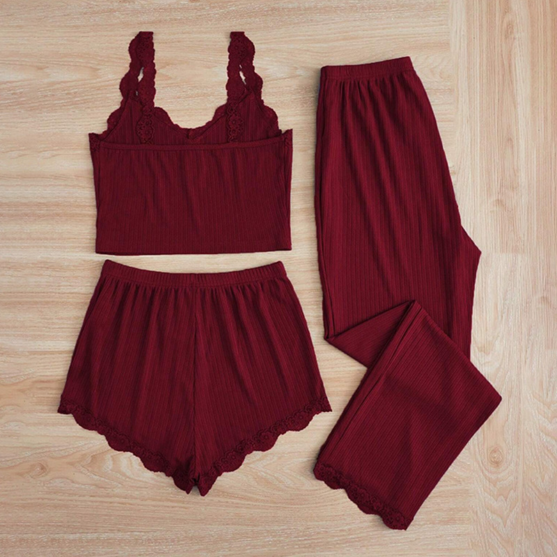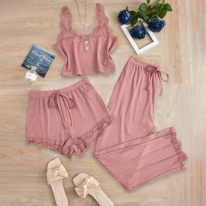 유럽풍 레이스 여성 홈웨어 섹시 속옷 파자마 3종 세트 끈팬티 반바지 긴바지 도매