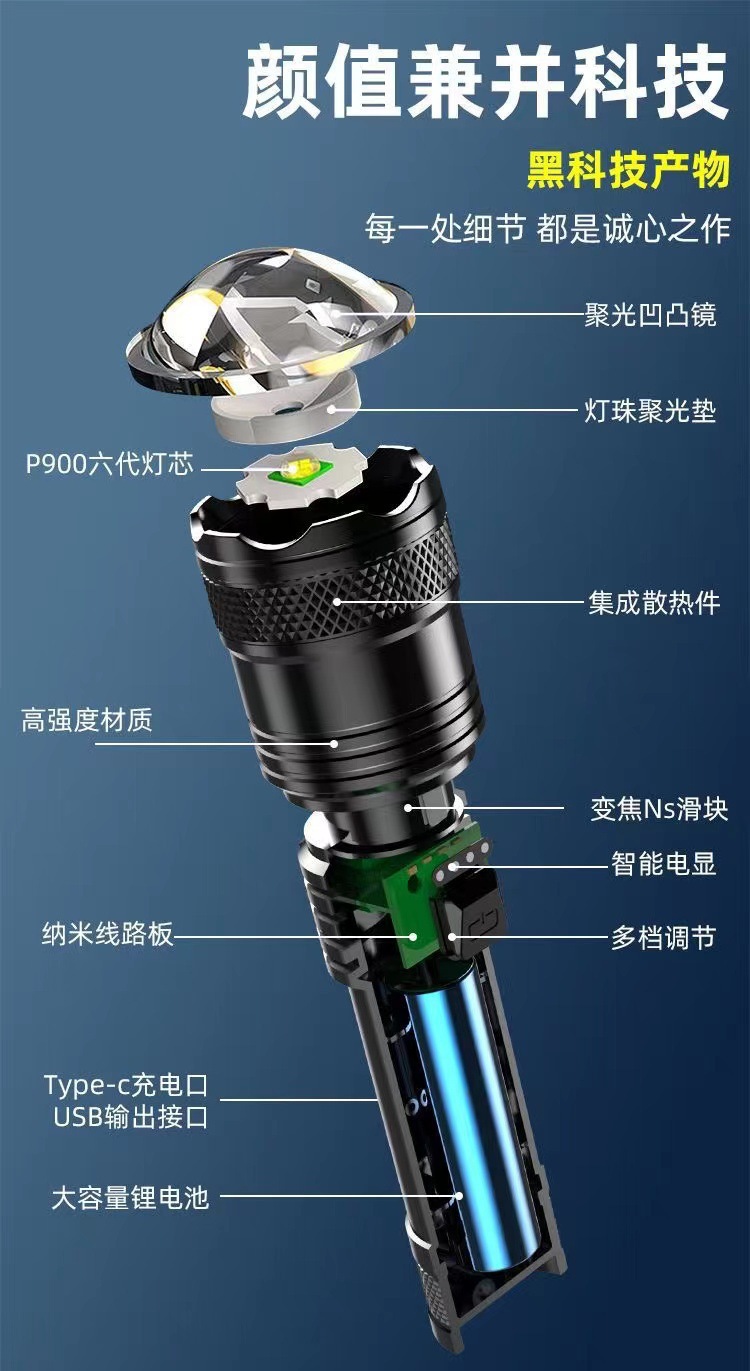 국경 흰색 레이저 손전등 강한 빛 야외 충전 슈퍼 밝은 USB 텔레스코픽 초점 작업 손전등 도매