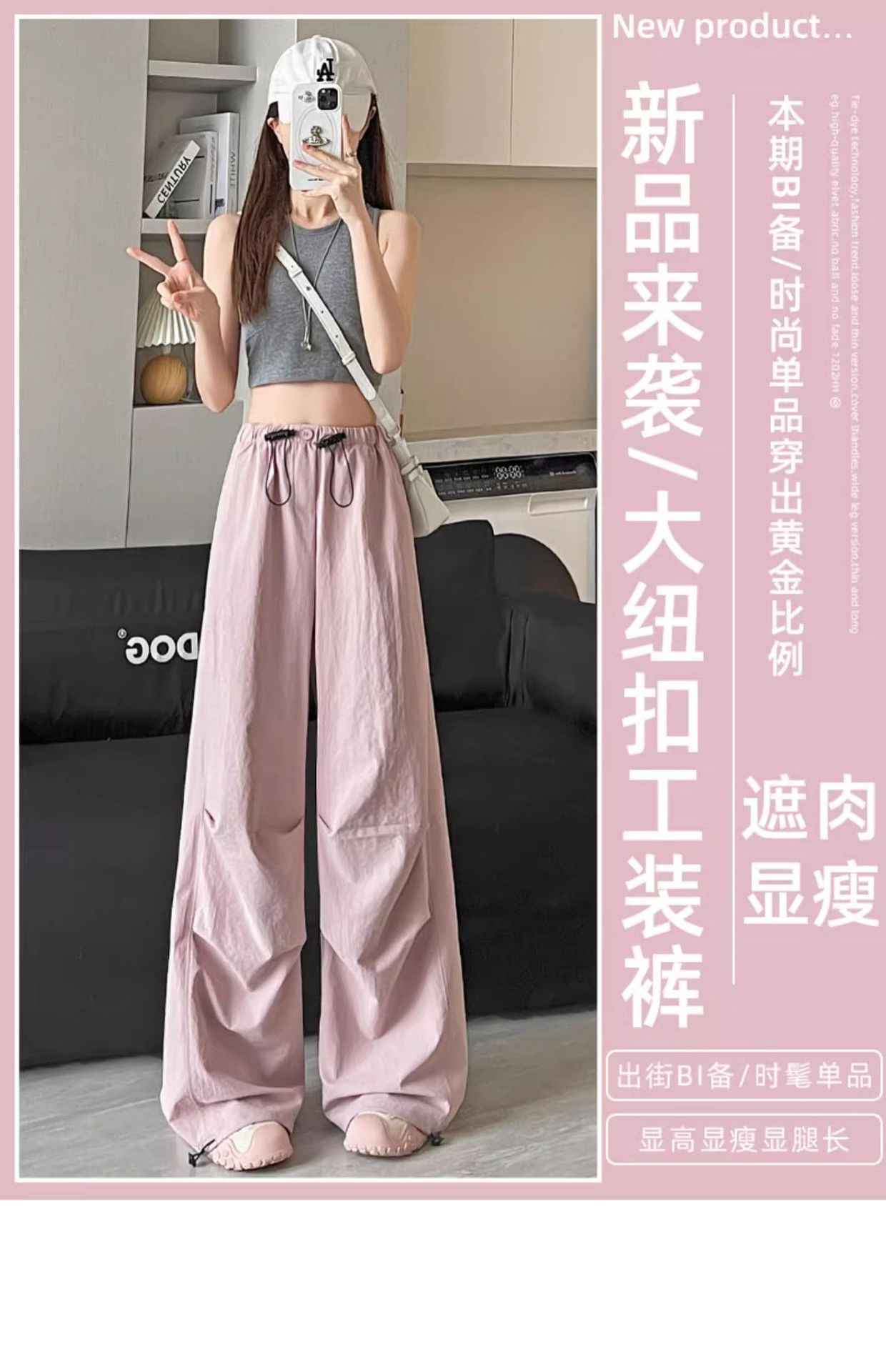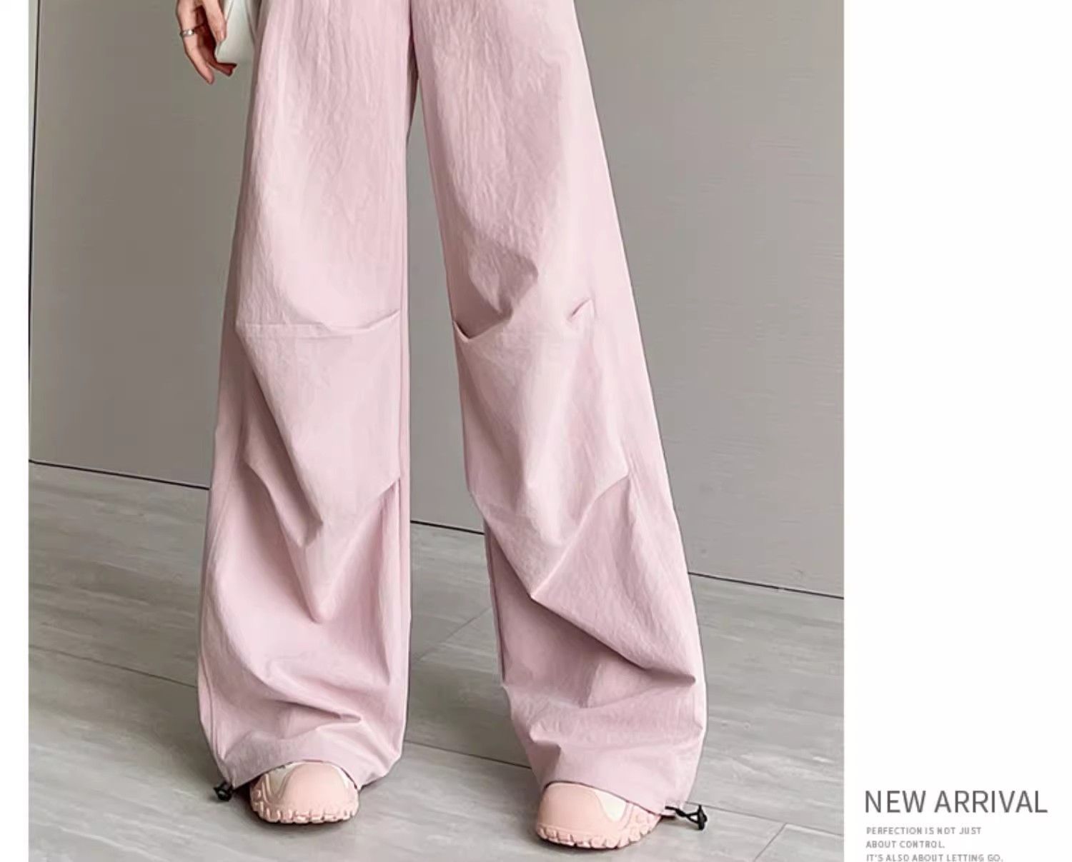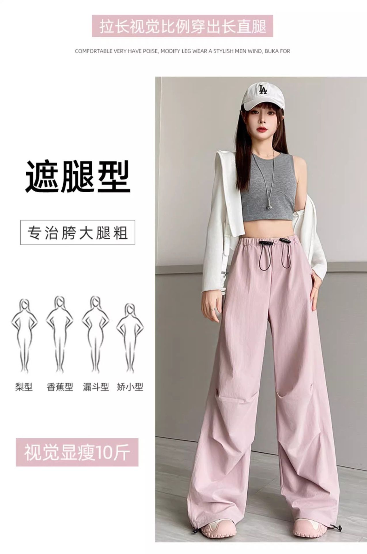 여성용 핑크 작업복 봄 여름 2025 새로운 한국 스타일 하이 웨이스트 슬리밍 야외 등산 느슨한 속건 스포츠 바지