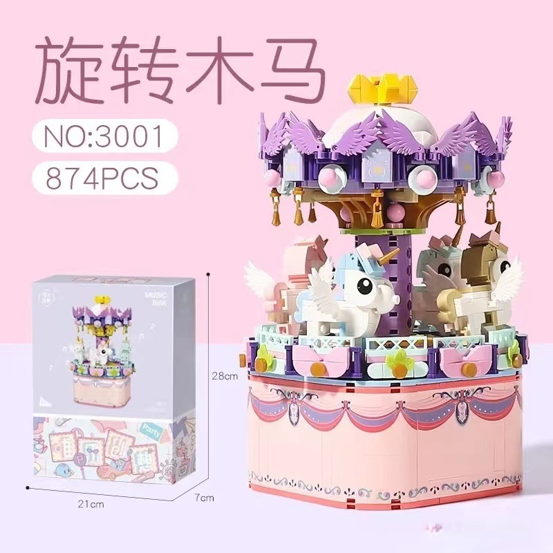 Weile Chuangyuan 미니 작은 입자 그물 빨간 음악 상자 회전 목마 관람차 빌딩 블록스토어 가기