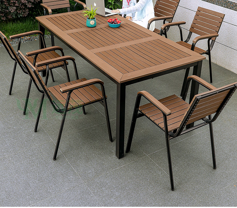 야외 안뜰 플라스틱 나무 테이블과 의자 부식 방지 목재 알루미늄 합금 레저 빌라 야외 테이블 방수 자외선 차단제 식탁 및 의자