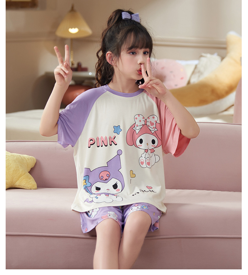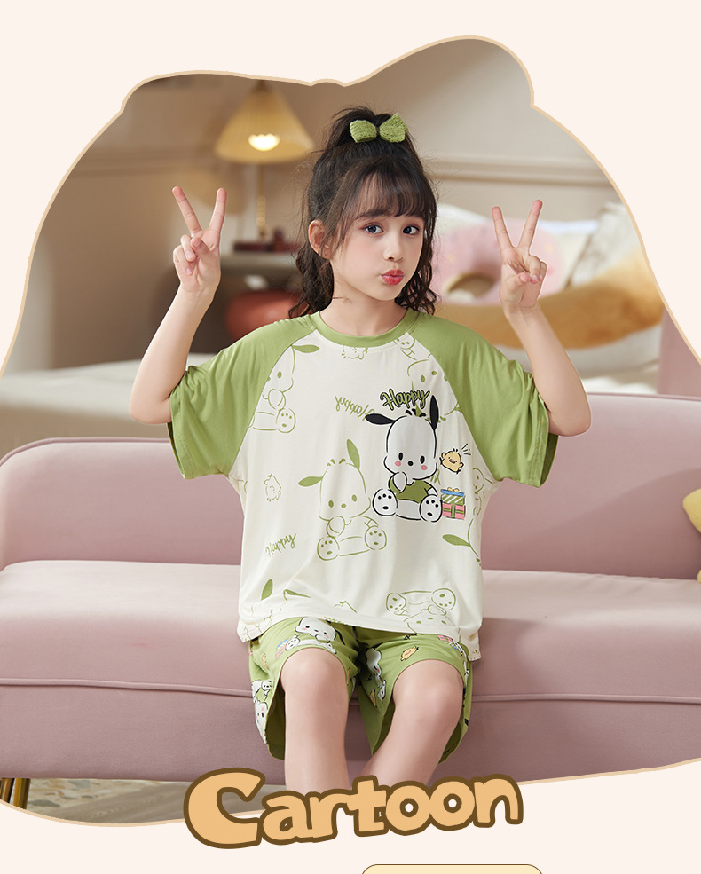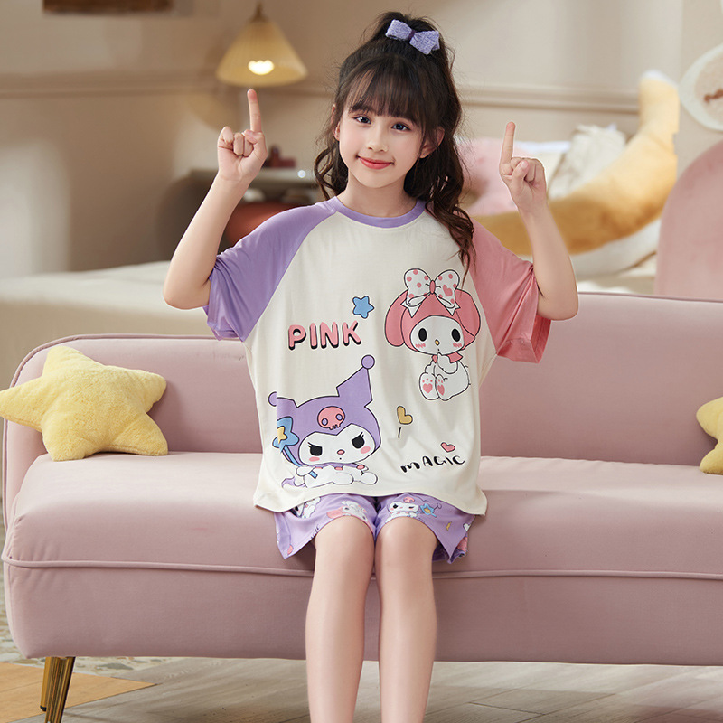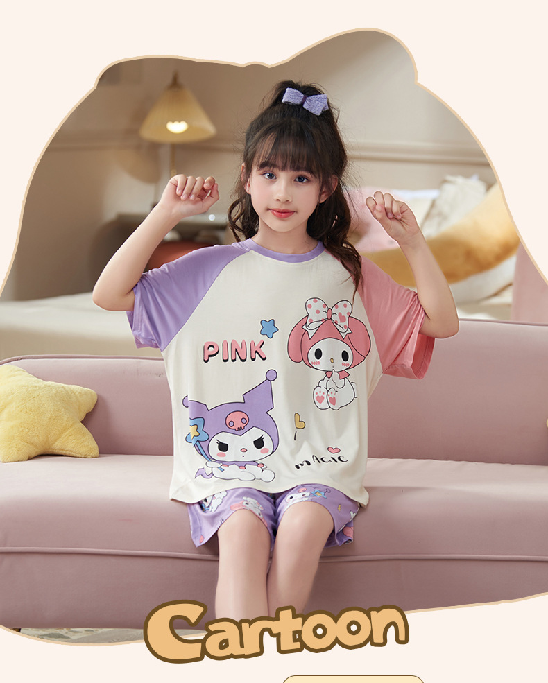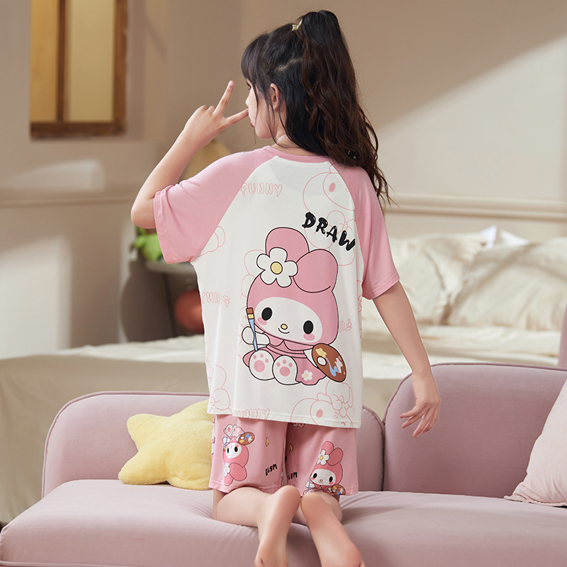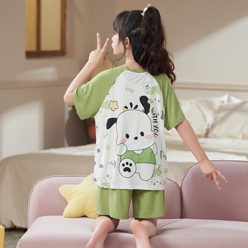 모달 소녀 잠옷 여름 2025 새로운 얇은 짧은 소매 어린이 만화 큰 아이 에어컨 홈 의류 세트