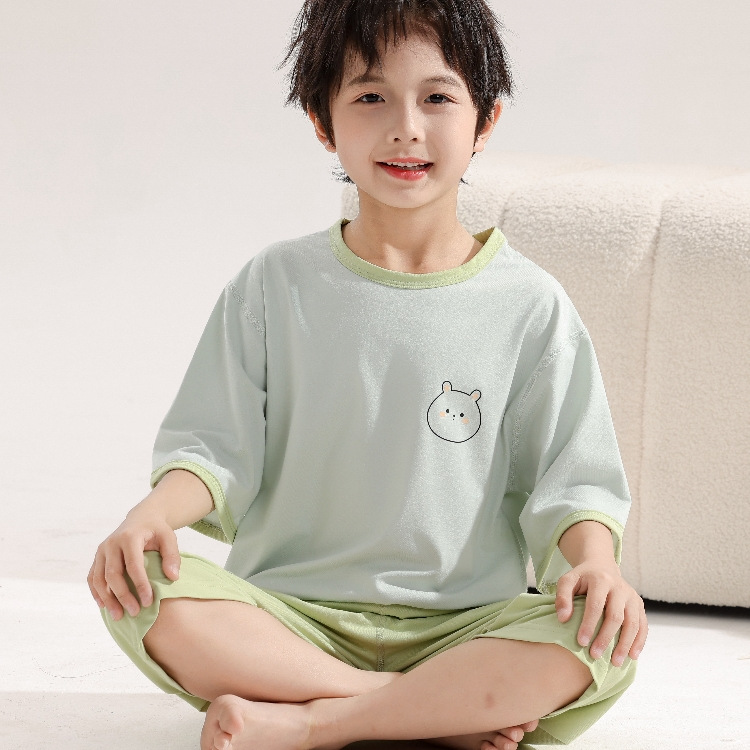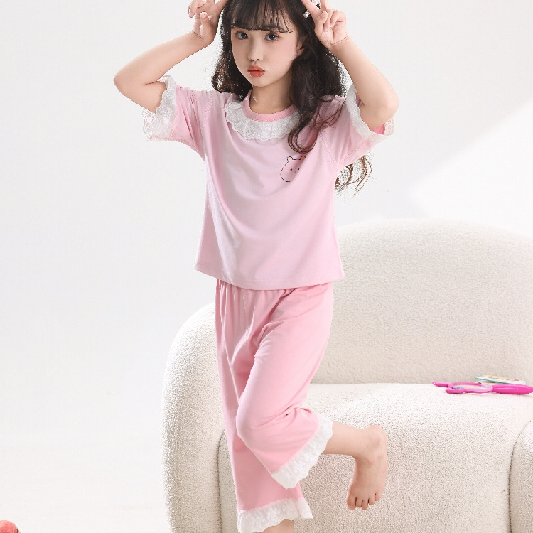 어린이 모조 면 파자마 소녀 자른 소매 바지 세트 소녀 여름 에어컨 옷 외부 옷 캐주얼 홈 옷