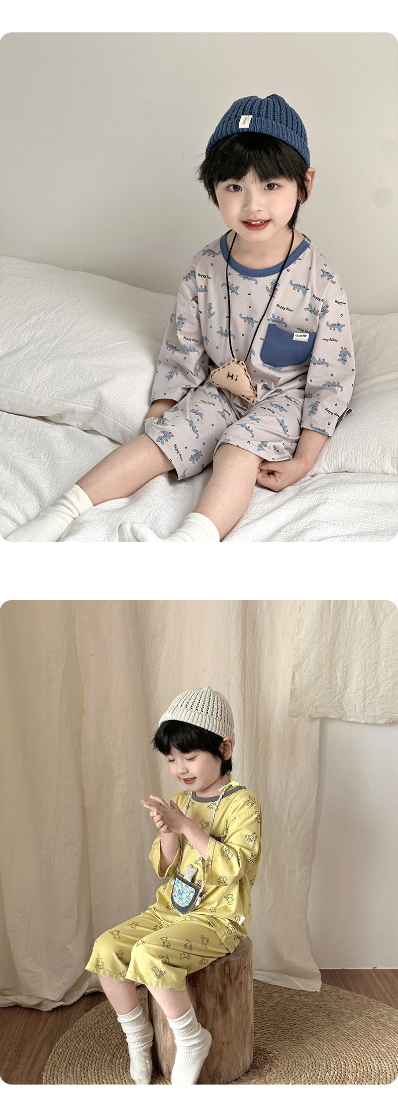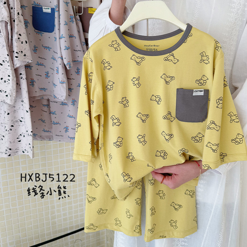 블랙 커피 베어 크루 넥 만화 Lyocell 코튼 클래스 어린이 홈 옷 봄과 여름 느슨한 자른 소매 바지 파자마 세트스토어 가기