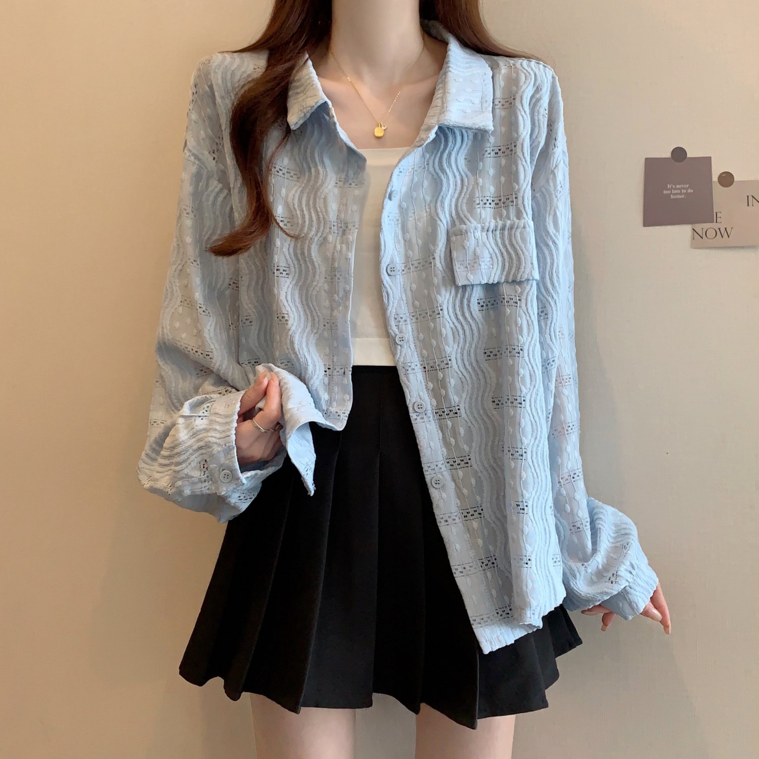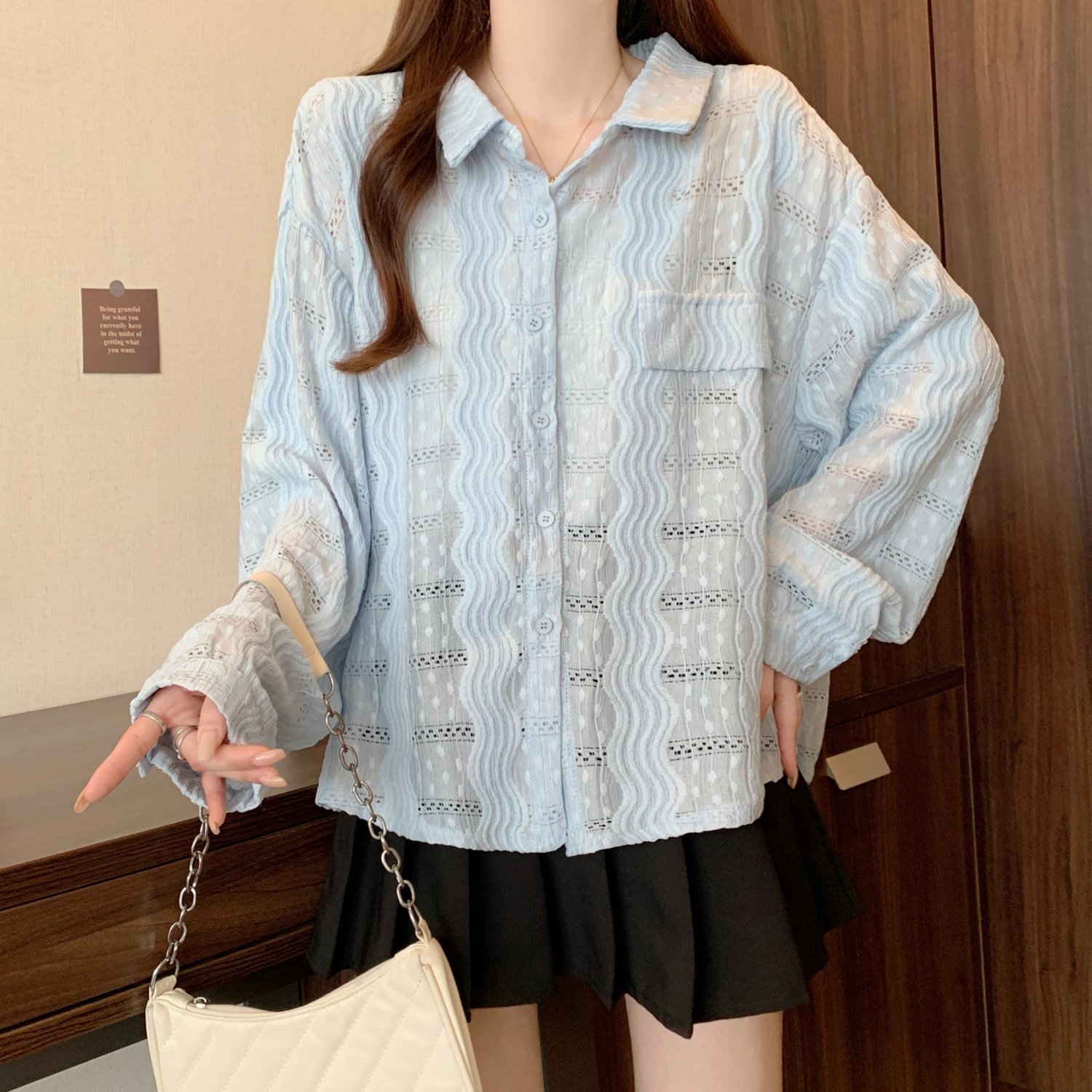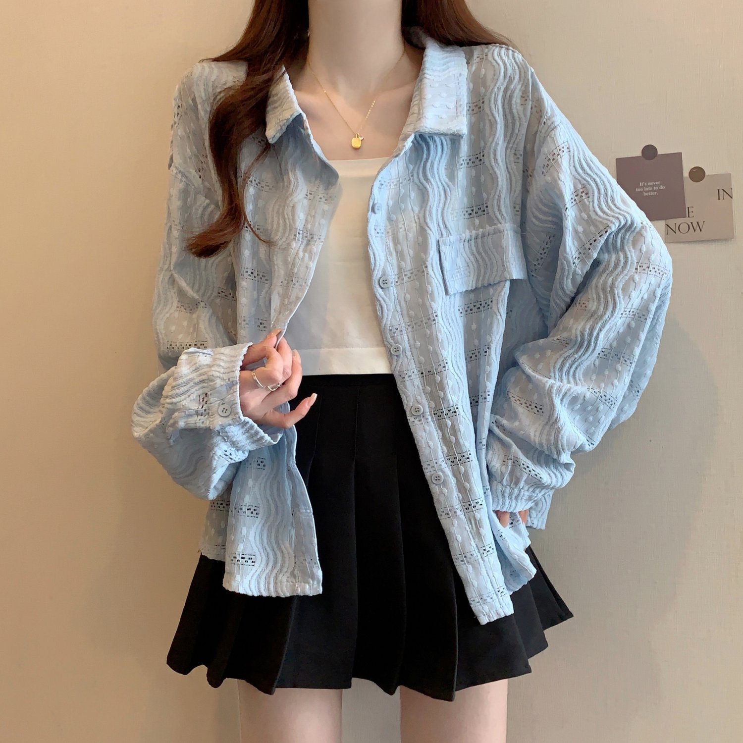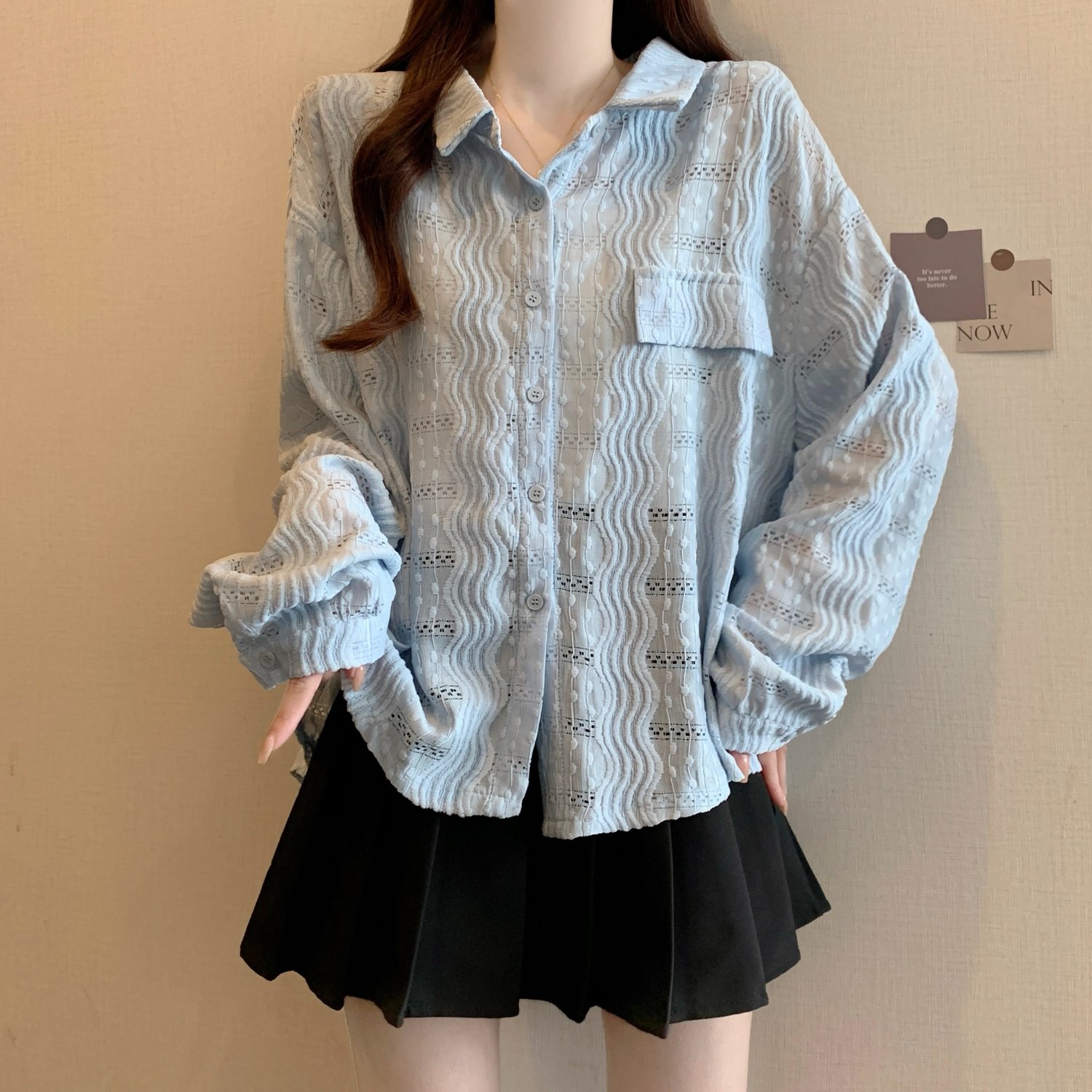 라이트 블루 크로 셰 뜨개질 빈 셔츠 어깨 재킷 여성의 2025 년 봄과 여름 약간의 뚱뚱한 mm 슈퍼 아름다운 탑스토어 가기