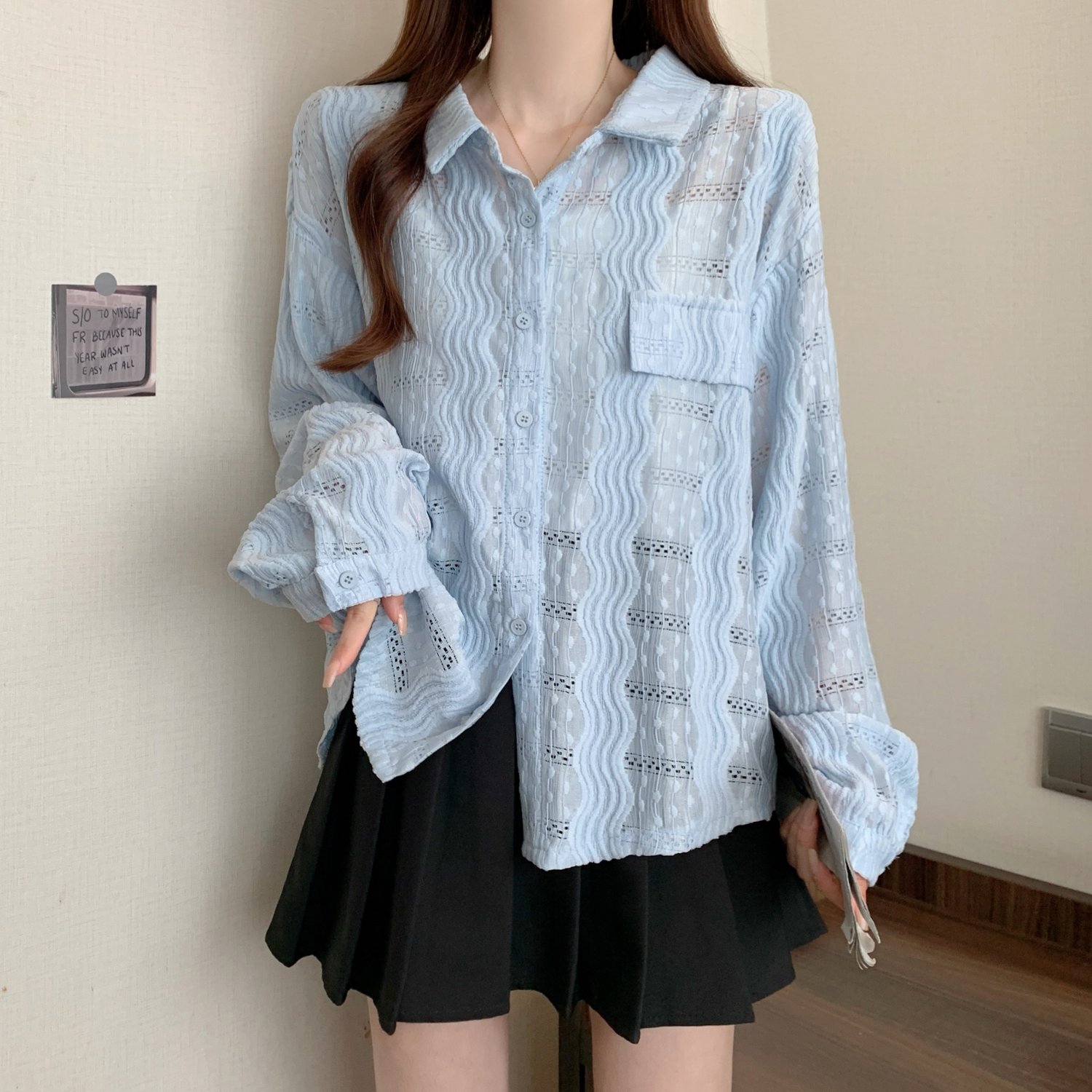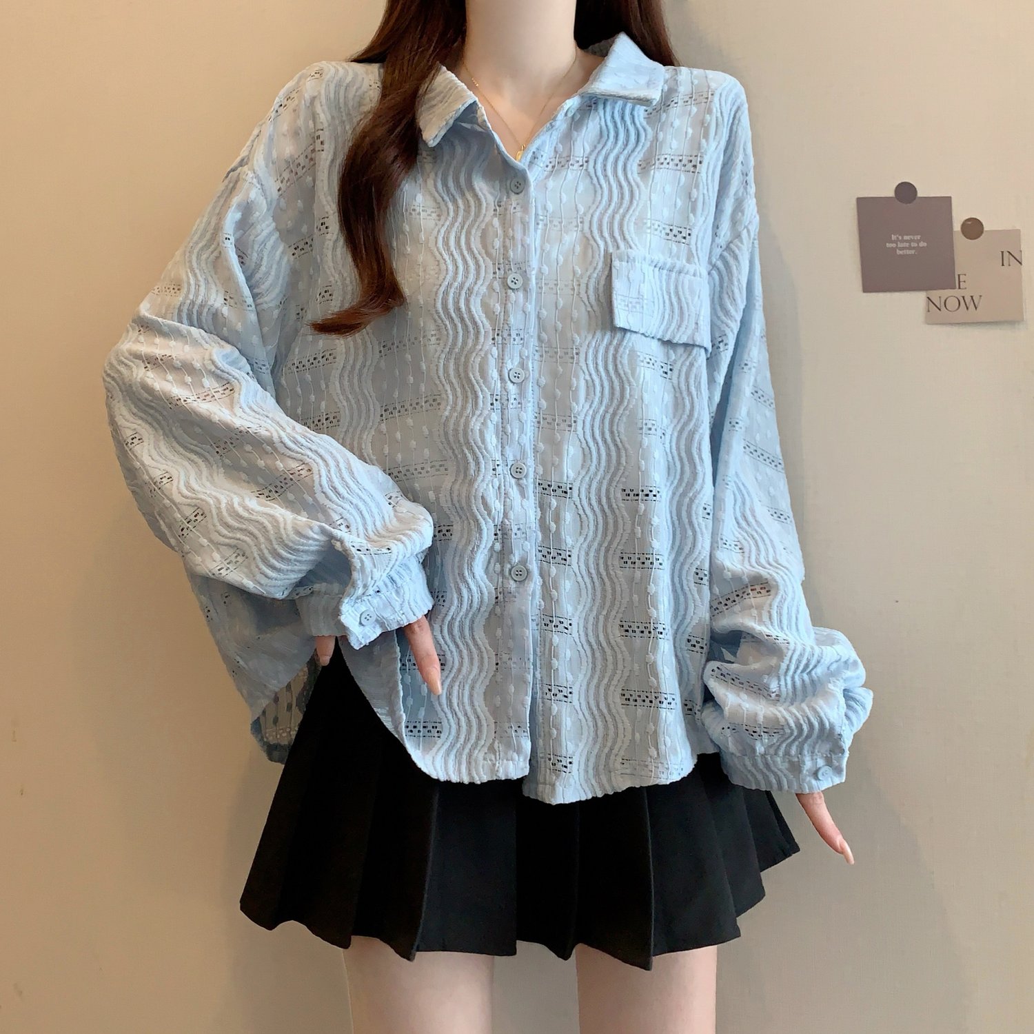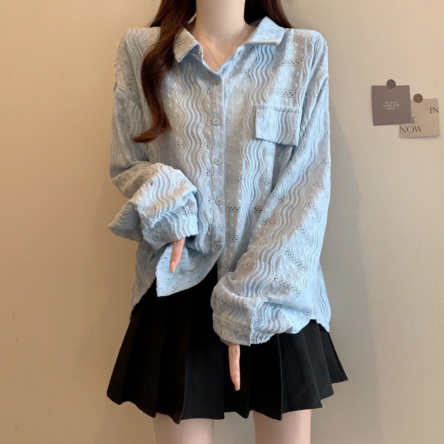 라이트 블루 크로 셰 뜨개질 빈 셔츠 어깨 재킷 여성의 2025 년 봄과 여름 약간의 뚱뚱한 mm 슈퍼 아름다운 탑스토어 가기