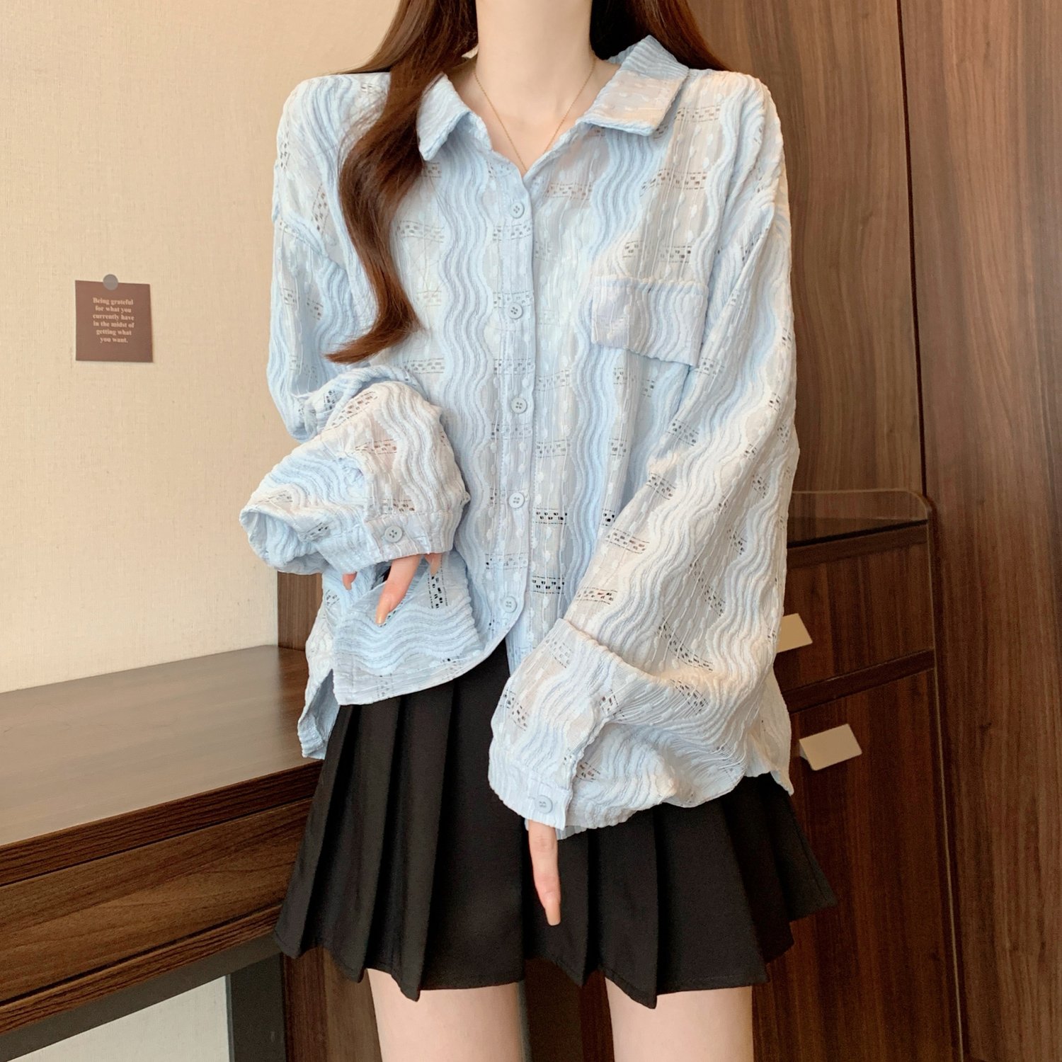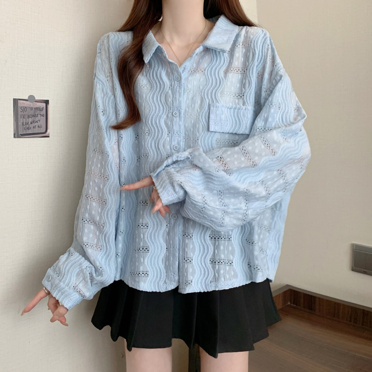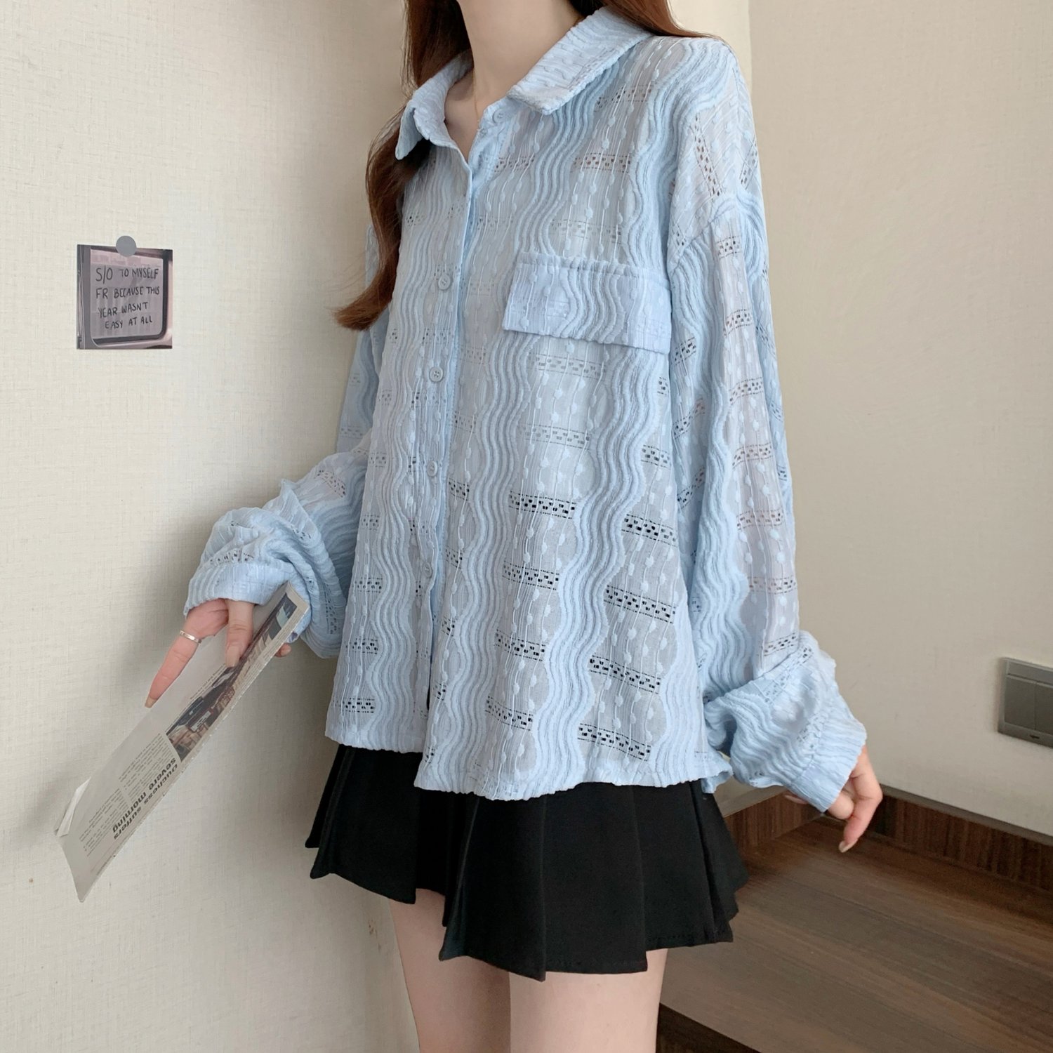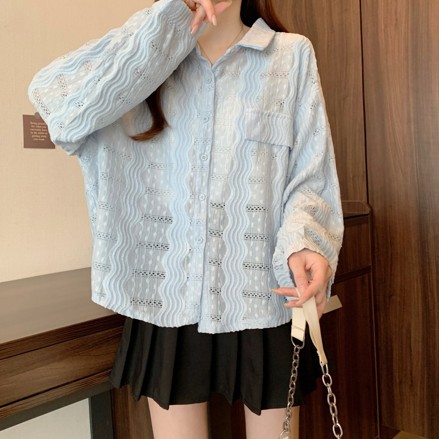 라이트 블루 크로 셰 뜨개질 빈 셔츠 어깨 재킷 여성의 2025 년 봄과 여름 약간의 뚱뚱한 mm 슈퍼 아름다운 탑스토어 가기