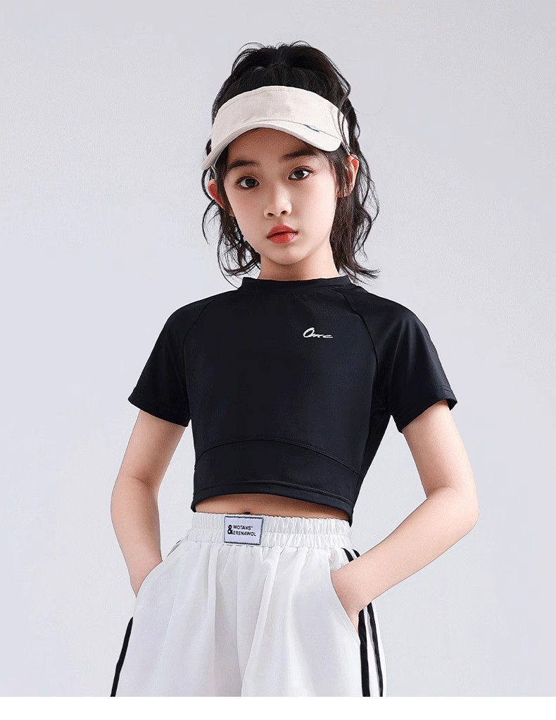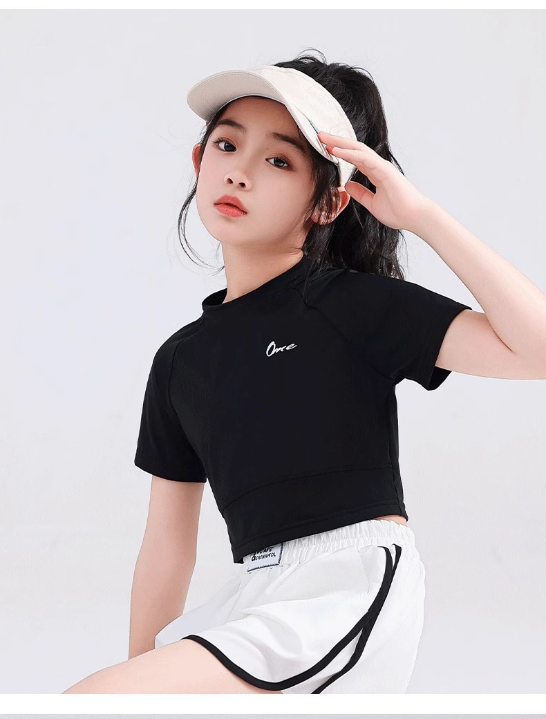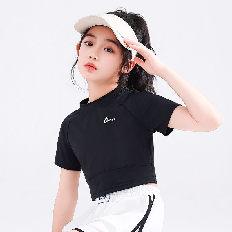 소녀 아이스 실크 반팔 2025 여름 새로운 선 스크린 티셔츠 중대형 어린이를위한 빠른 건조 탑 배꼽 짧은 스포츠 티셔츠