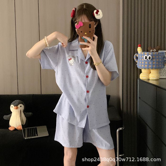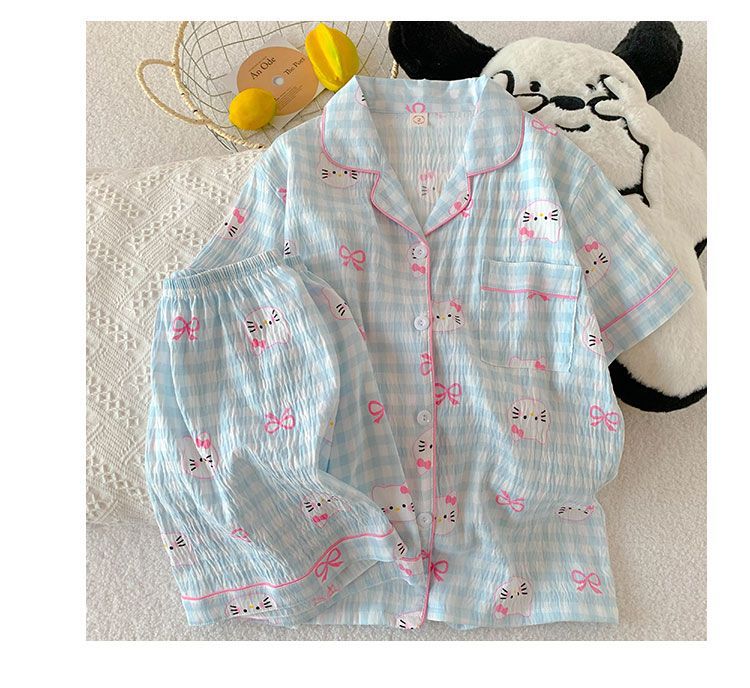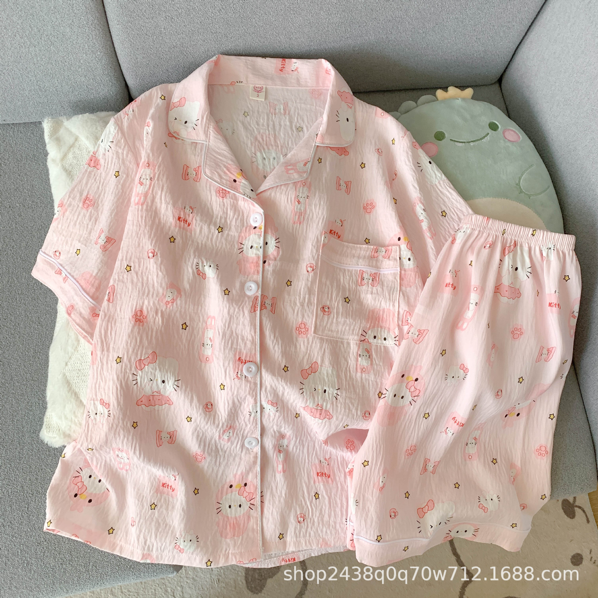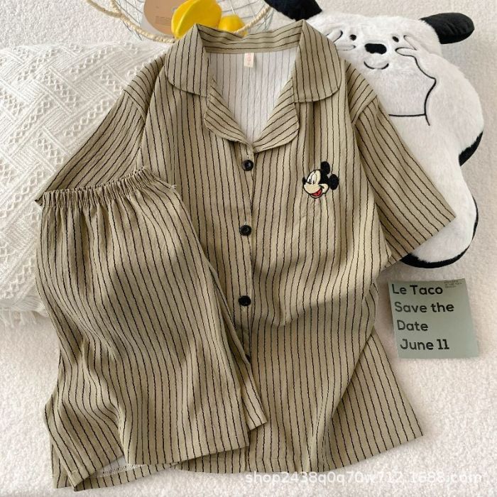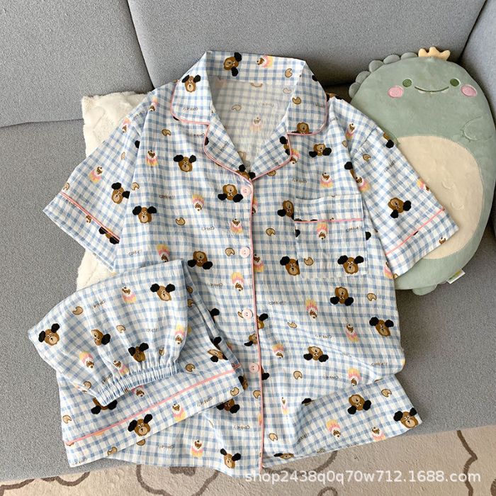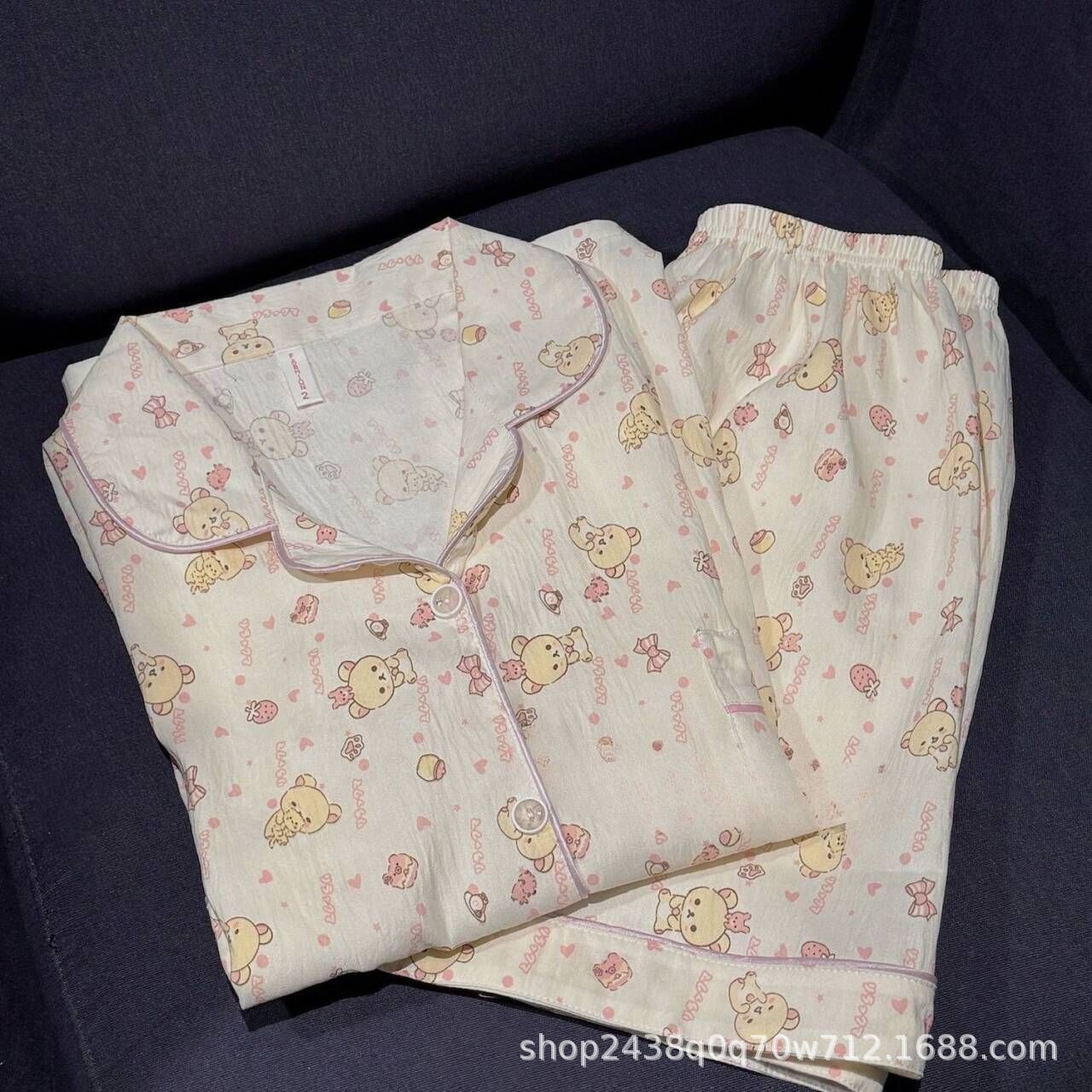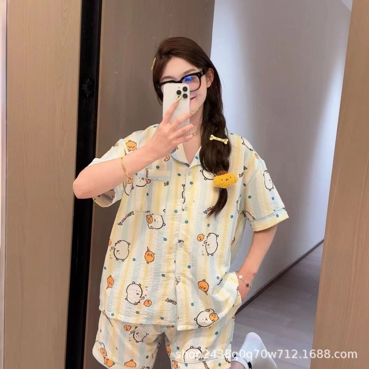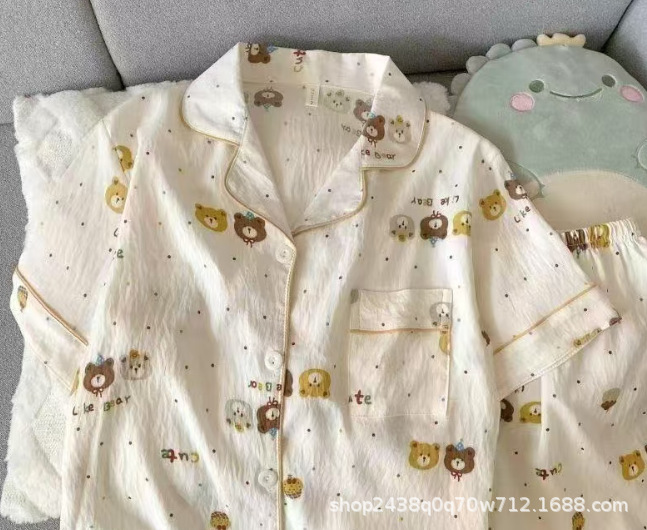 2025 새로운 구름면 귀여운 자기 비하 곰 반팔 줄무늬 잠옷 여성의 봄과 여름 캐주얼 아웃웨어 홈 의류스토어 가기