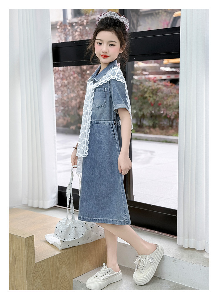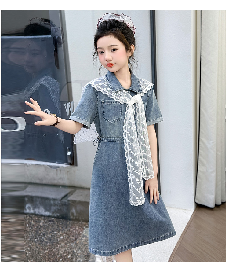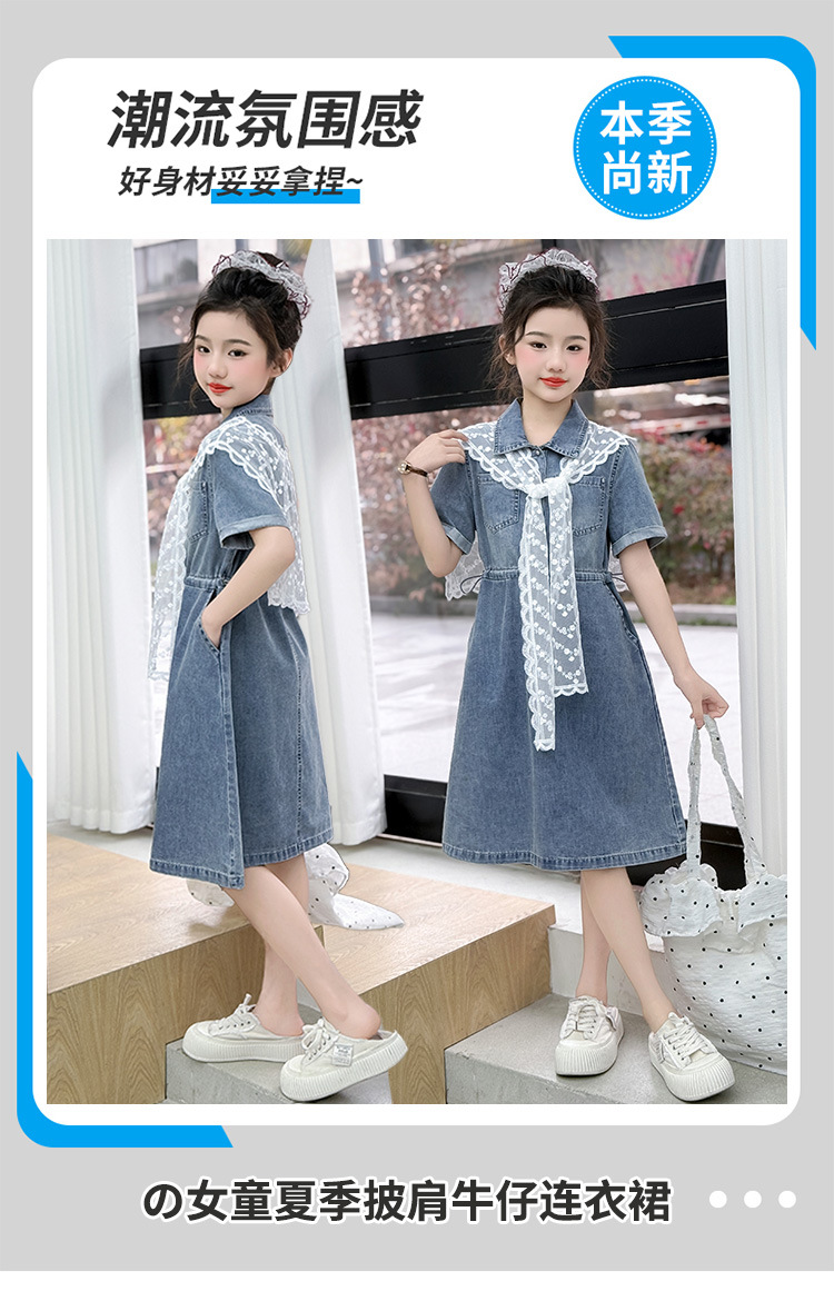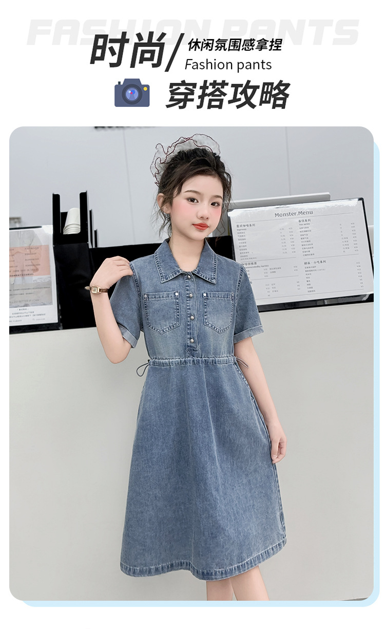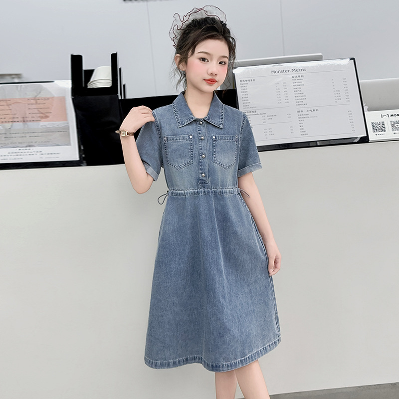 소녀 여름 2025 새로운 도착 데님 원피스 미드 빅 어린이 서양식 허리 슬리밍 반팔 원피스 서양식 패션스토어 가기