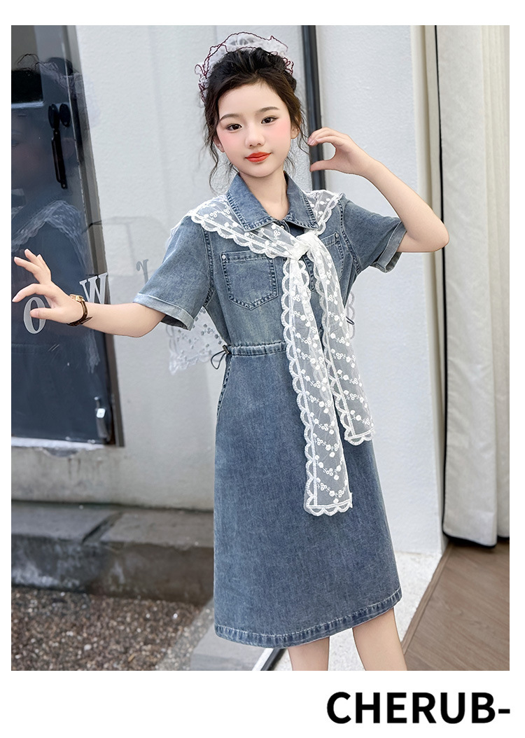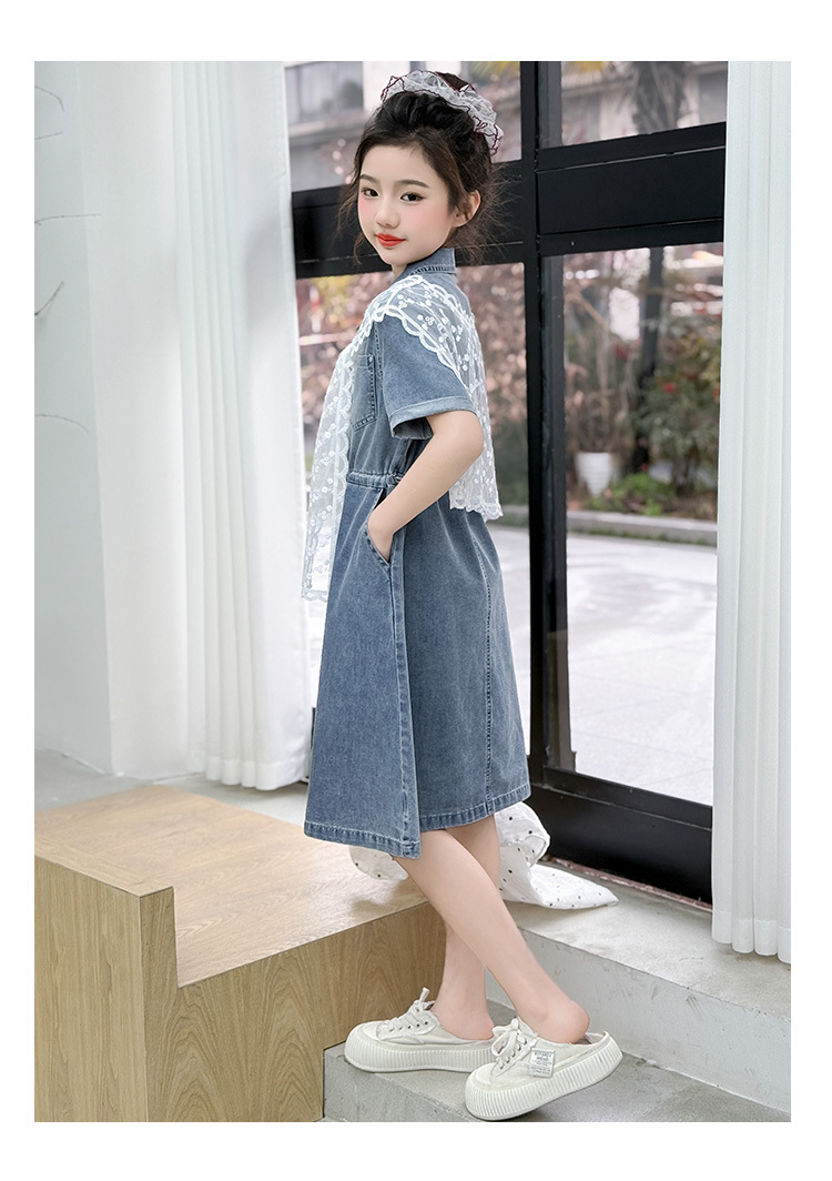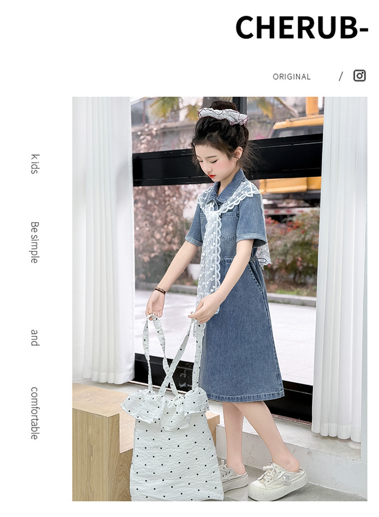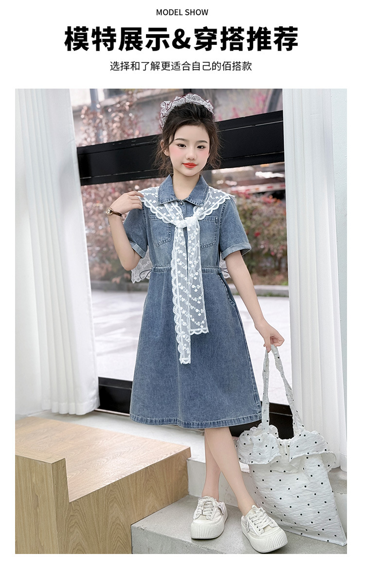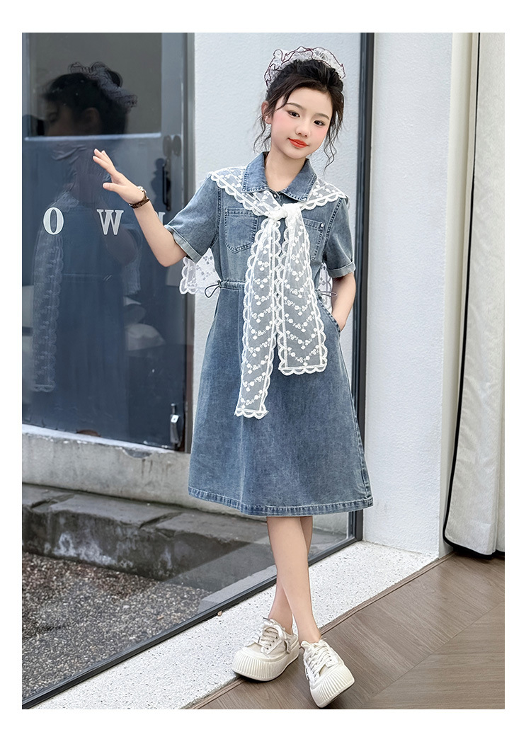 소녀 여름 2025 새로운 도착 데님 원피스 미드 빅 어린이 서양식 허리 슬리밍 반팔 원피스 서양식 패션스토어 가기