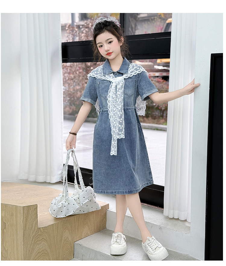 소녀 여름 2025 새로운 도착 데님 원피스 미드 빅 어린이 서양식 허리 슬리밍 반팔 원피스 서양식 패션