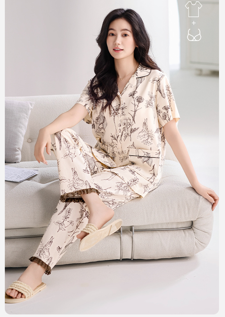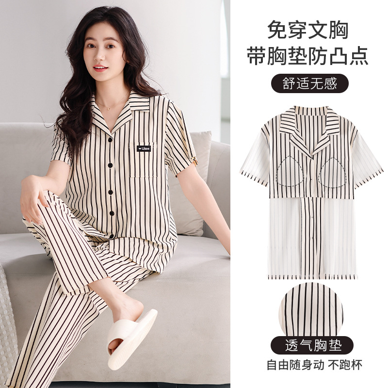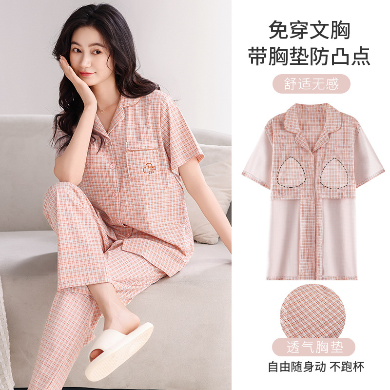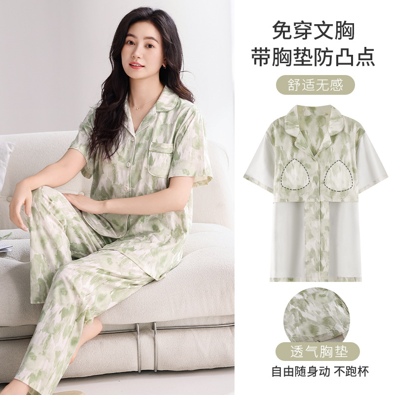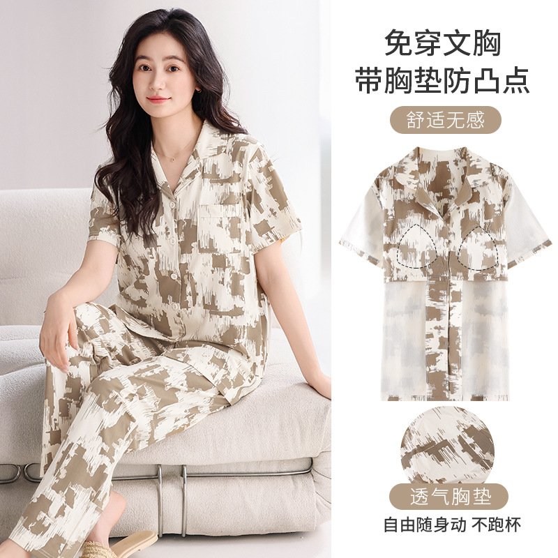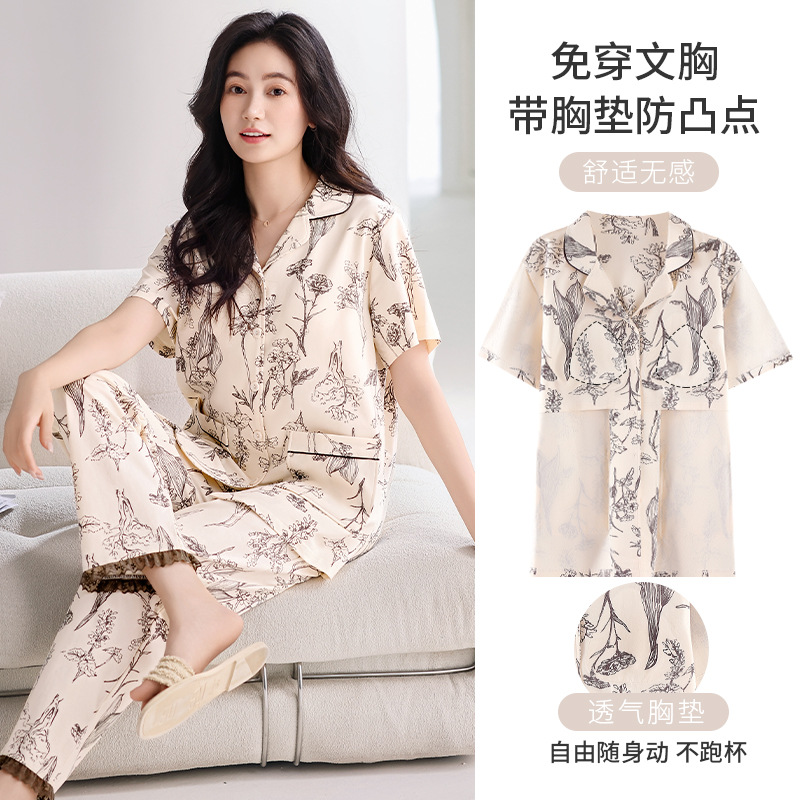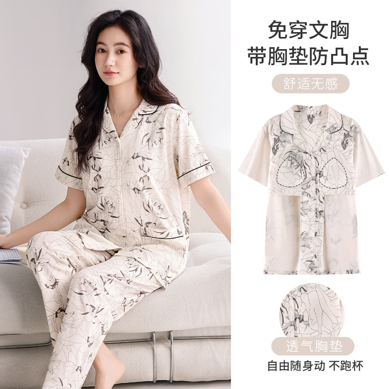 가슴 패드 여성 여름 순면 반팔 바지 여름 여성 중년 어머니 얇은 반소매 홈 옷을 입은 잠옷스토어 가기