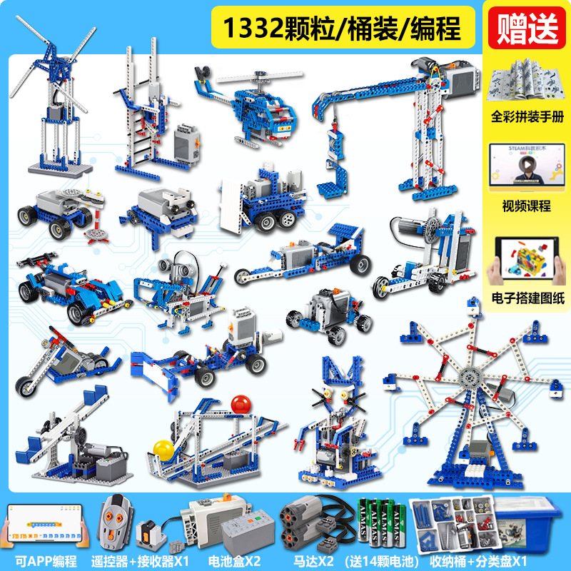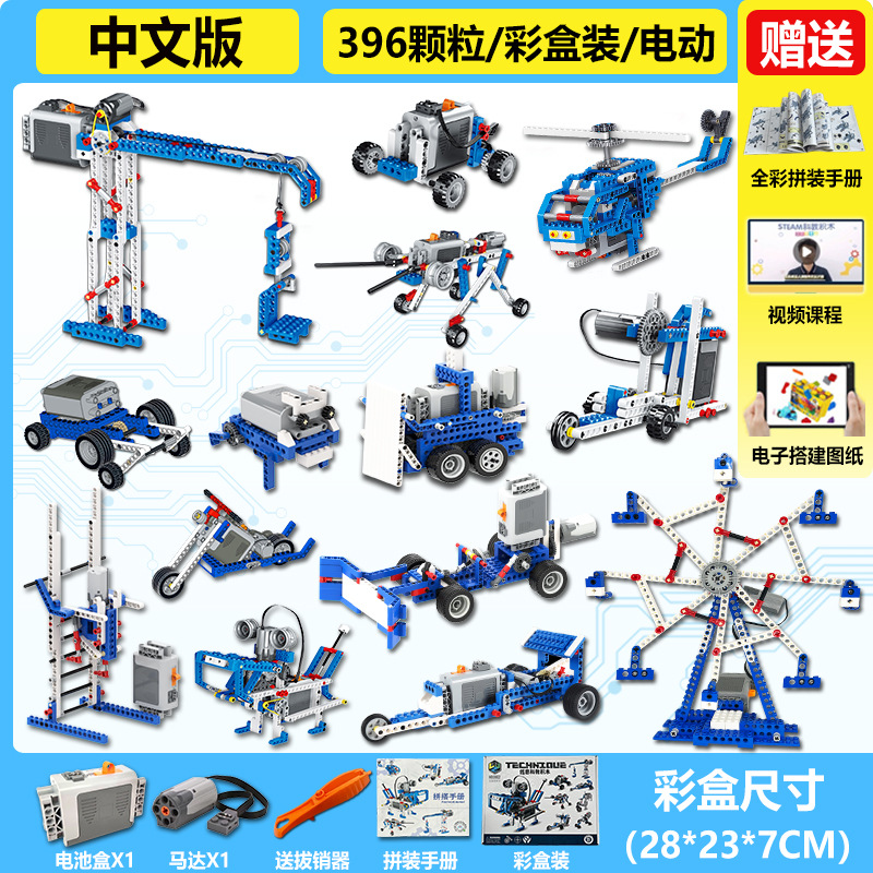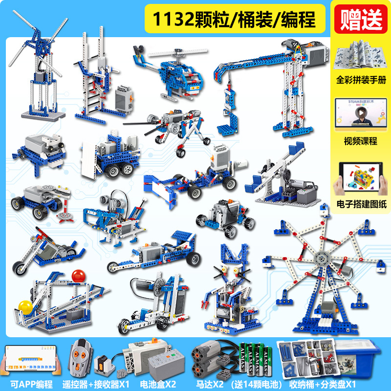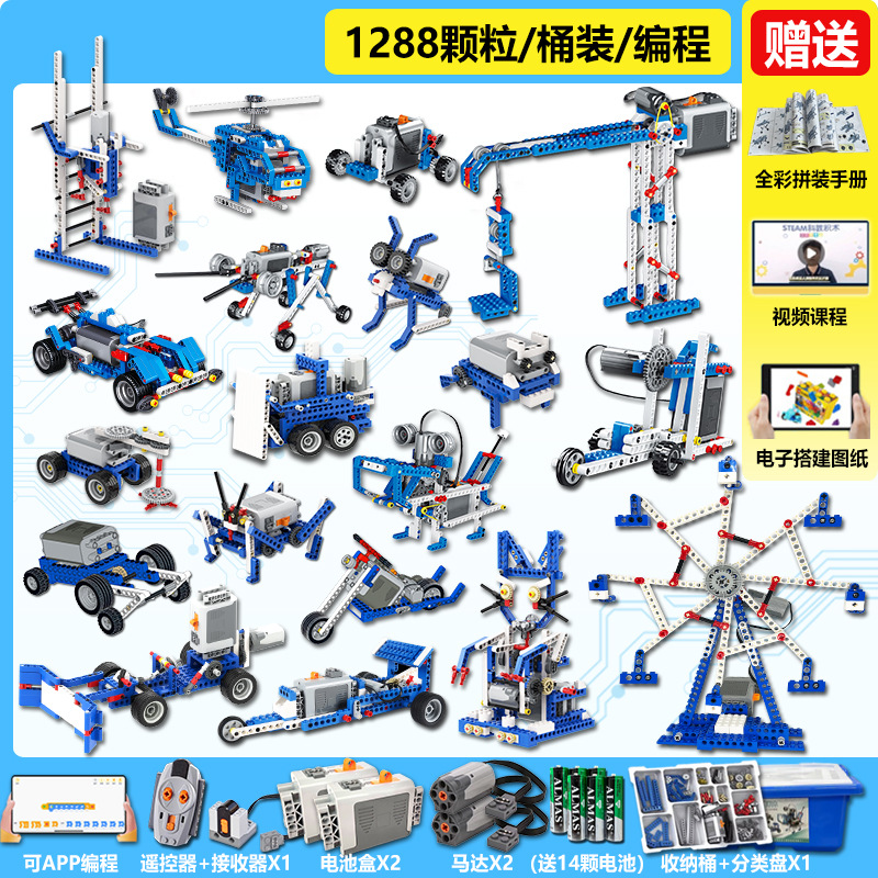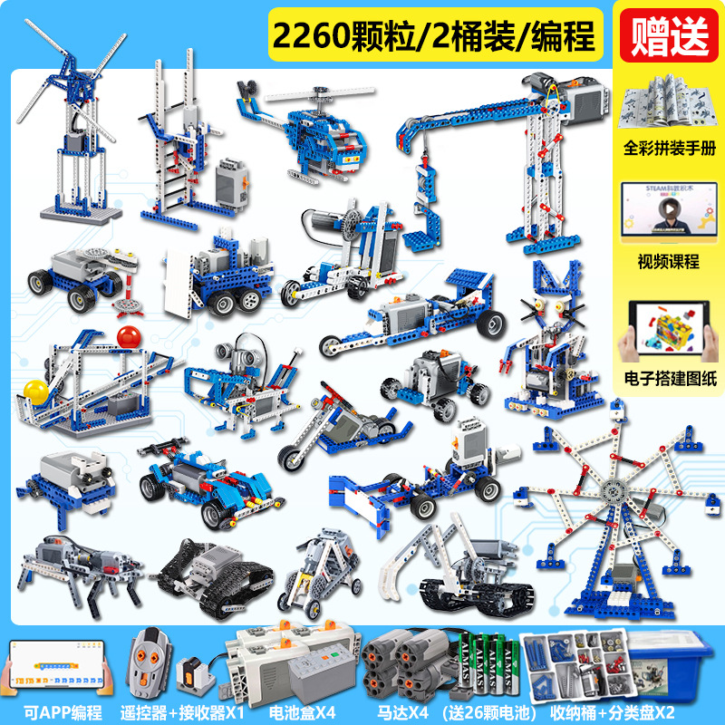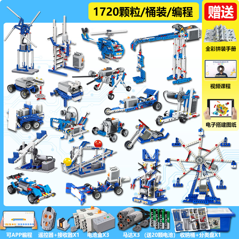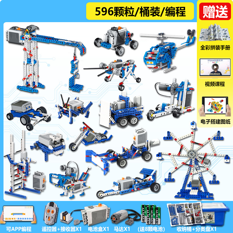 • 1단계 및 2단계 교육 보조 장치[858개 입자] + 프로그래밍 원격 제어 버전에는 배터리 8개가 포함되어 있습니다.