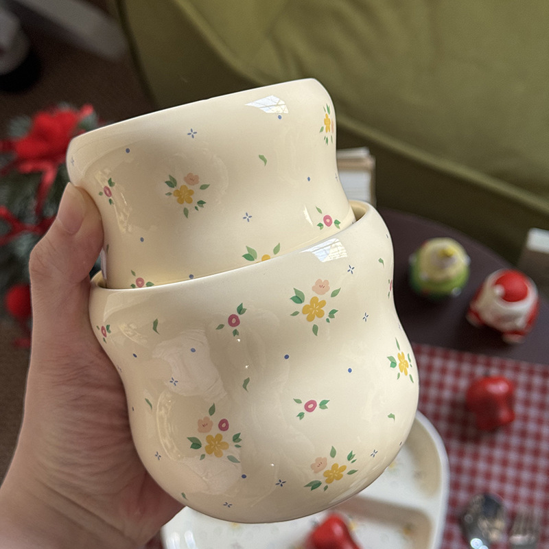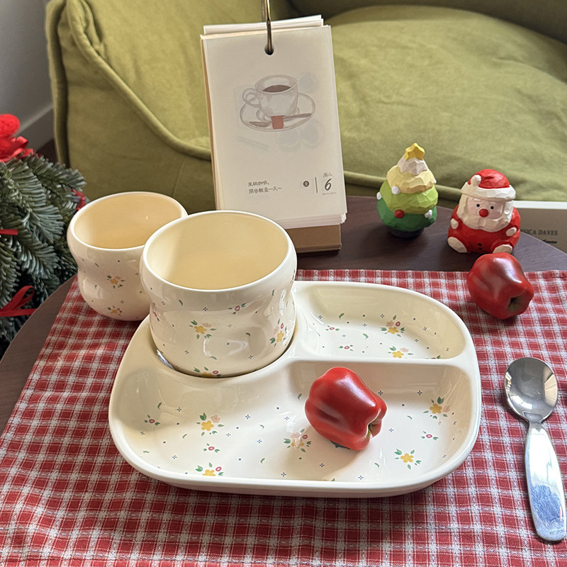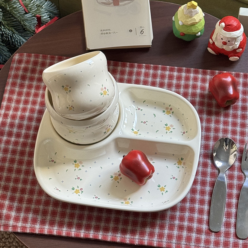 인스 스타일 꽃무늬 3칸 식판, 귀여운 세라믹 아침식사용 다이어트 접시, 가정용 컵, 여자아이와 어린이를 위한 분리형 접시