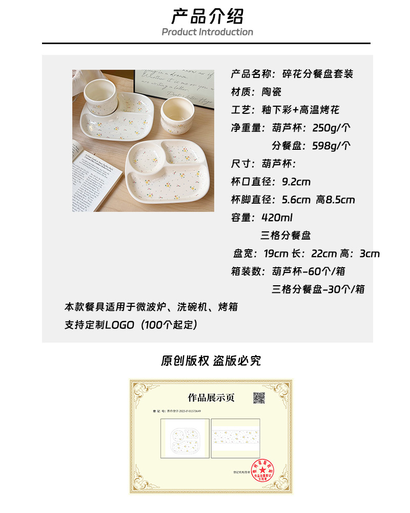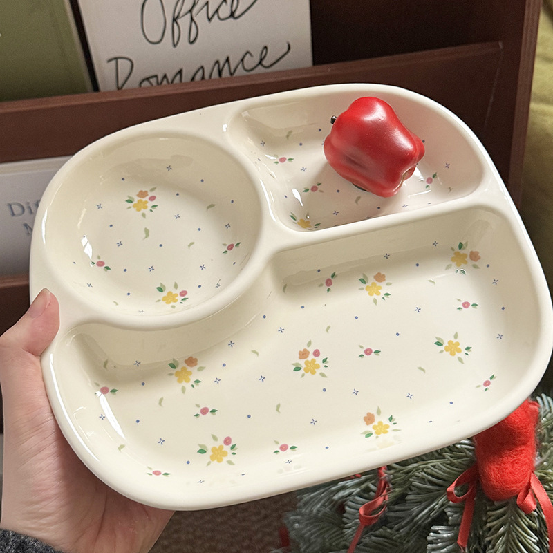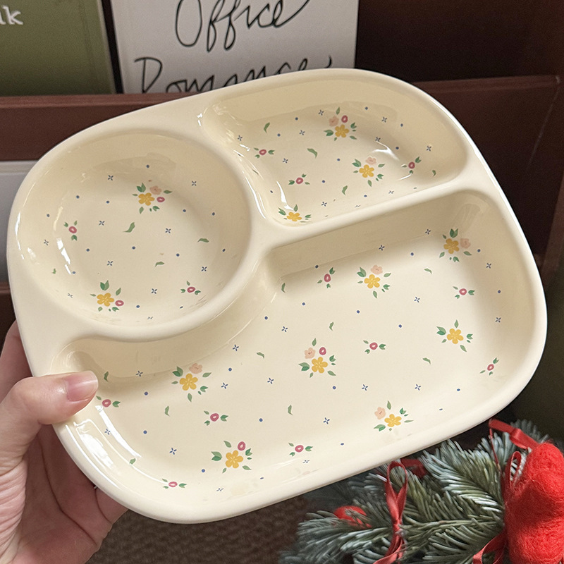 인스 스타일 꽃무늬 3칸 식판, 귀여운 세라믹 아침식사용 다이어트 접시, 가정용 컵, 여자아이와 어린이를 위한 분리형 접시스토어 가기